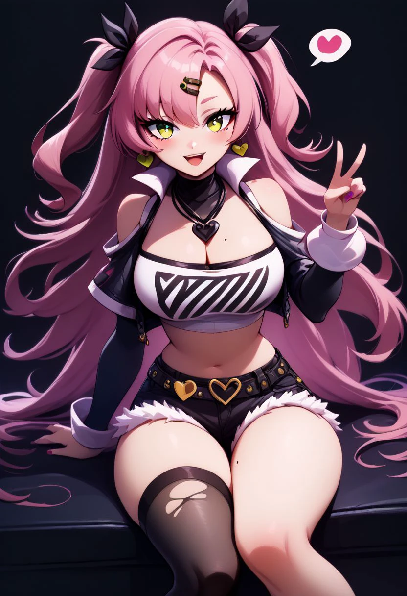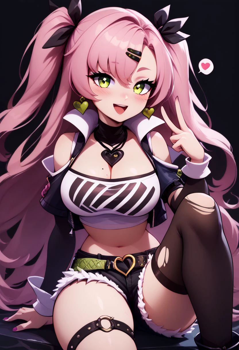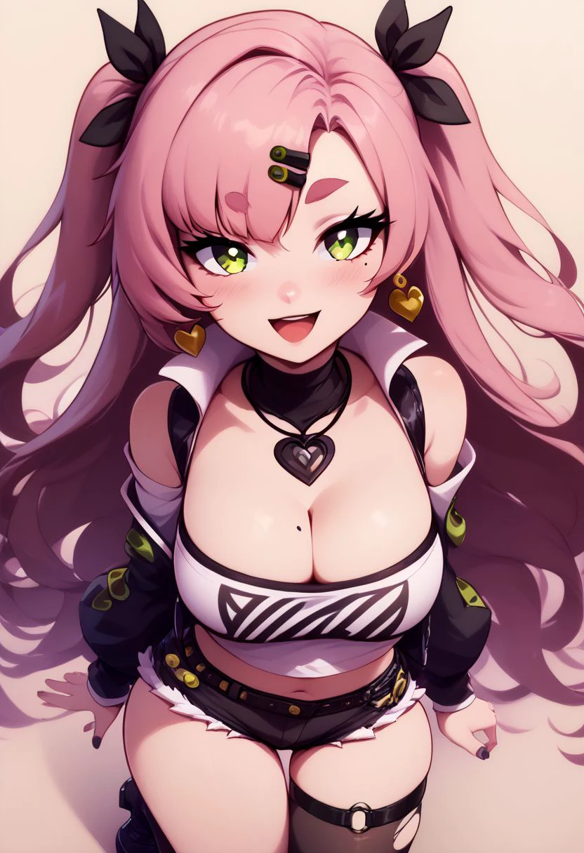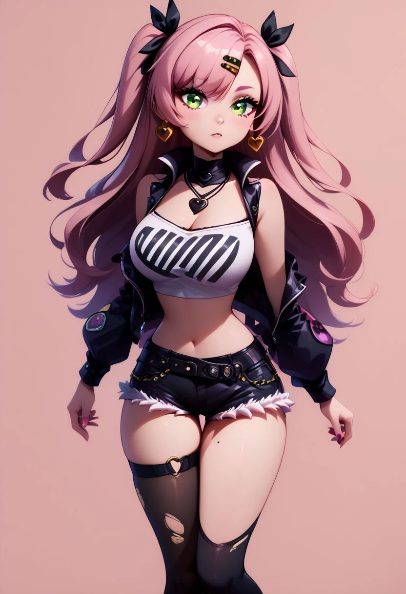 nicole demara, green eyes, pink hair, hair ornament, hair ribbon, hairclip, long hair, mole, mole on breast, mole on thigh, mole under eye, two side up, ribbon, black footwear, black ribbon, black shorts, black socks, black thighhighs, boots, cleavage, crop top, earrings, jewelry, kneehighs, nail polish, necklace, o-ring, short shorts, shorts, single kneehigh, single sock, single thighhigh, socks, thigh strap, thighhighs, torn clothes, two side up,