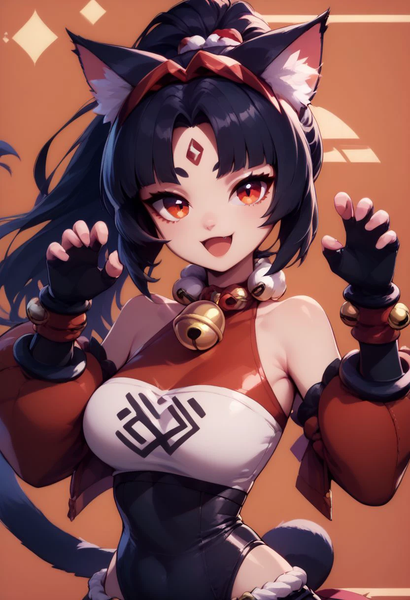 nekomiya mana, cat ears, red eyes, neck bell, hairband, two tails, detached sleeves, black thighhighs, ponytail, red leotard, leotard under clothes, black shorts, hair ribbon, boots, forehead mark,