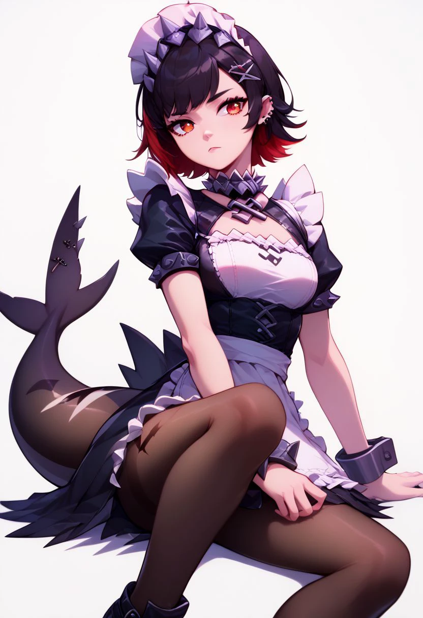 ellen joe, black hair, colored inner hair, multicolored hair, red eyes, red hair, short hair, two-tone hair, apron, black pantyhose, black shirt, black skirt, ear piercing, fins, fish tail, maid, maid apron, maid headdress, pantyhose, piercing, puffy short sleeves, puffy sleeves, shark girl, shark tail, shirt, short sleeves, skirt, tail, two-tone hair, wrist cuffs,