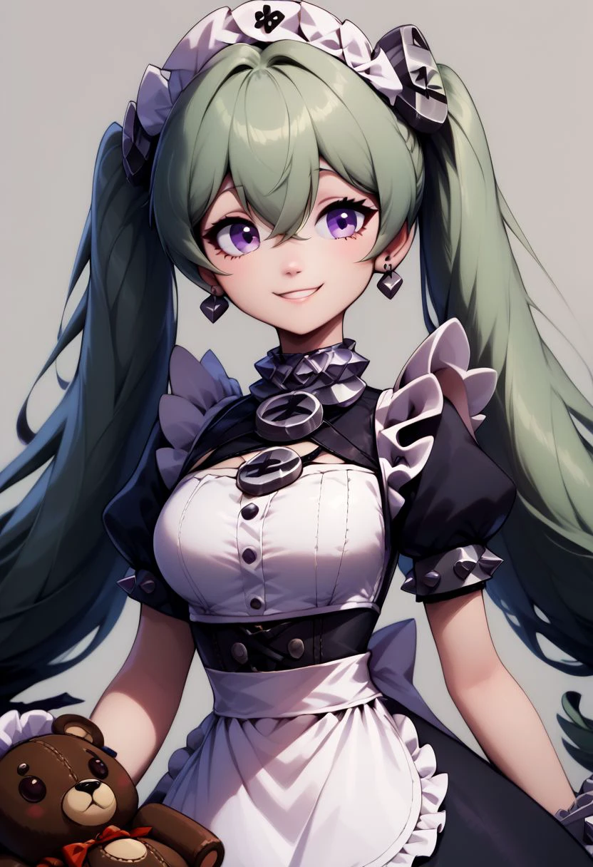 corin wickes, 1girl, green hair, purple eyes, hair between eyes, twintails, maid headdress, puffy short sleeves, black dress, white apron,