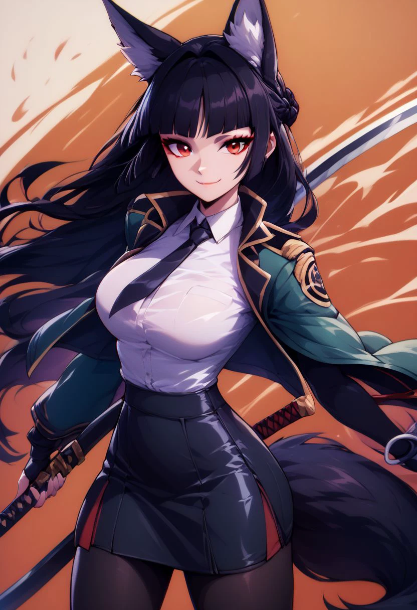 hoshimi miyabi, fox ears, red eyes, black hair, long hair, jacket, black skirt, black pantyhose,