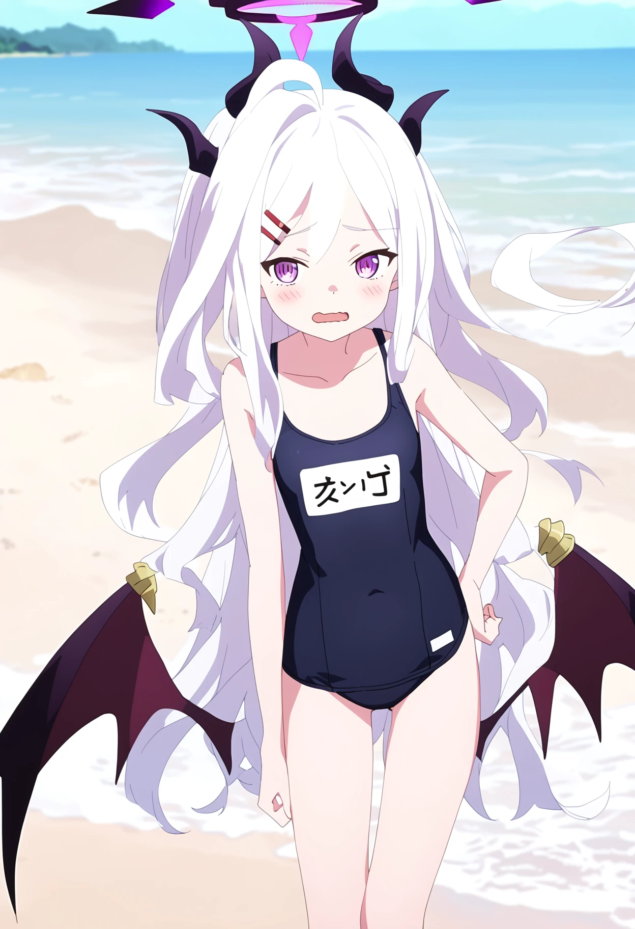 hinarng, white hair, long hair, bangs, purple eyes, hairclip, halo, small breasts, demon horns, demon wings, very long hair, ahoge, hair ornament, demon girl, school swimsuit, old school swimsuit, one-piece swimsuit, collarbone, name tag,
