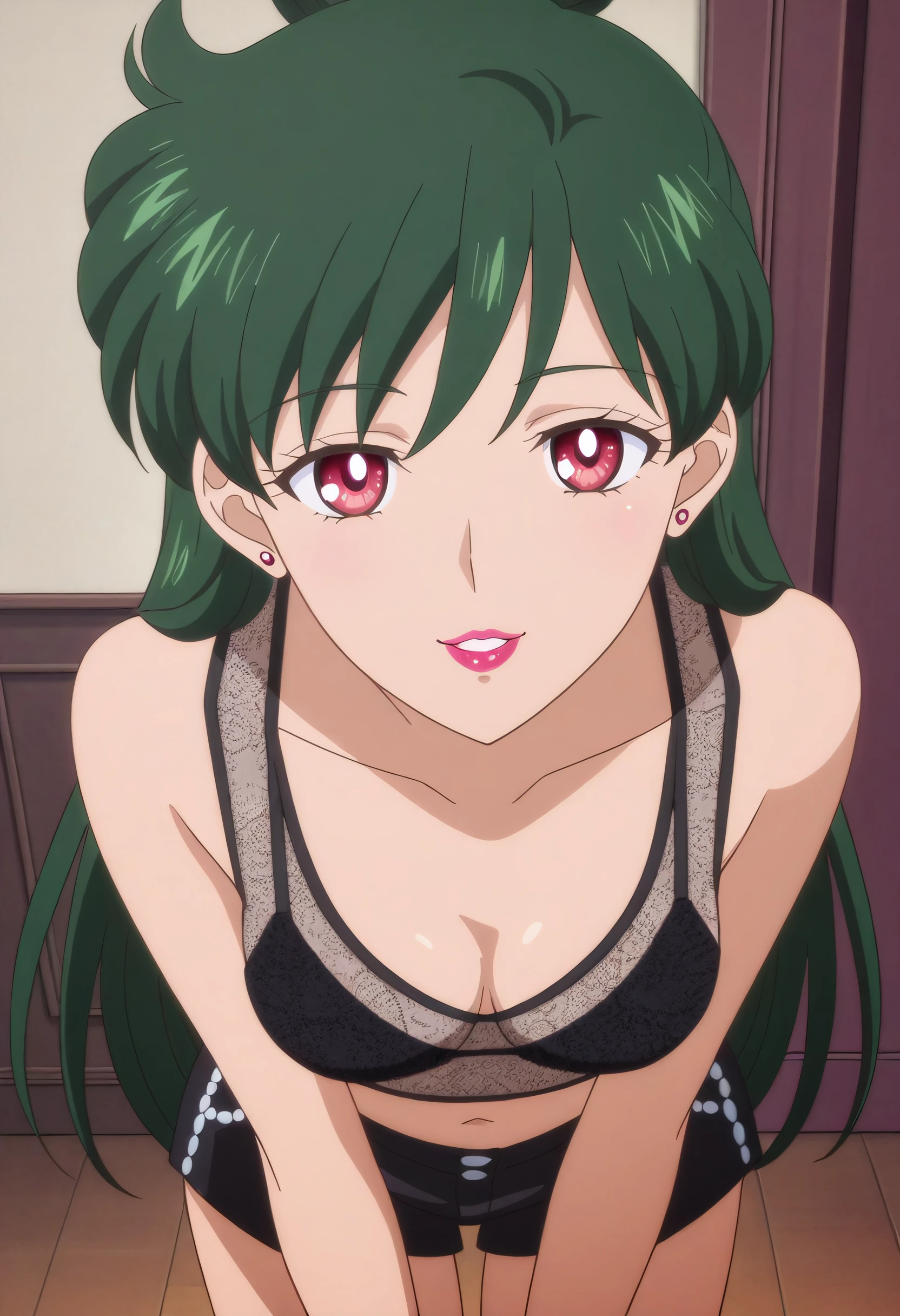 s41plu, red eyes, green hair, hair bun, lipstick, stud earrings, lace, black bra, sleeveless, midriff, black shorts