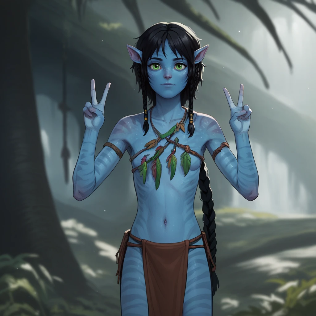 1girl, solo, Kiri, black hair, short hair, green eyes, pointy ears, colored skin, blue skin