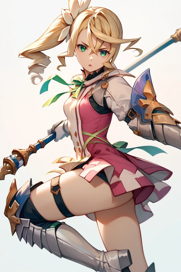 alisha diphda, blonde hair, dress, green eyes, side ponytail, hair between eyes, hair ornament, knee boots, greaves, thigh strap, white gloves, gauntlets, long sleeves,