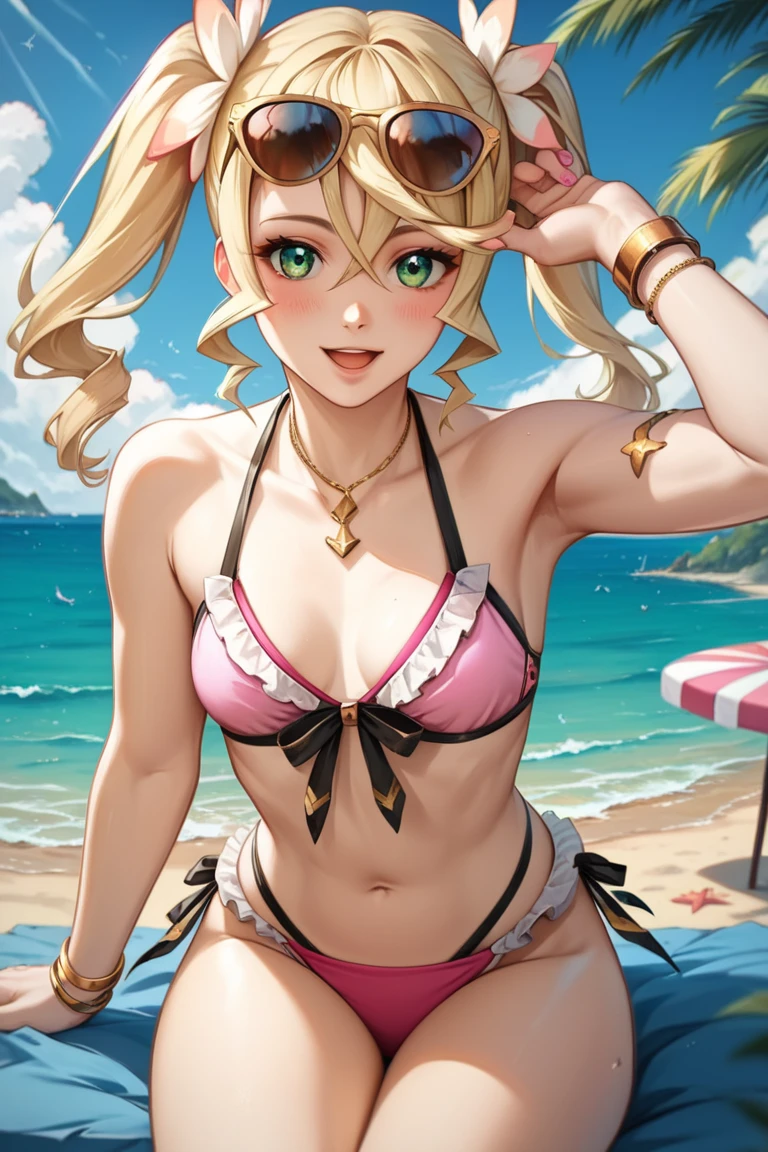 alisha diphda, blonde hair, dress, green eyes, side ponytail, hair between eyes, hair ornament, As for her base costume