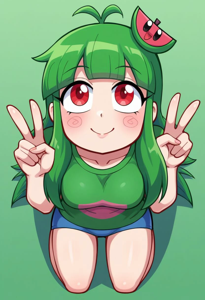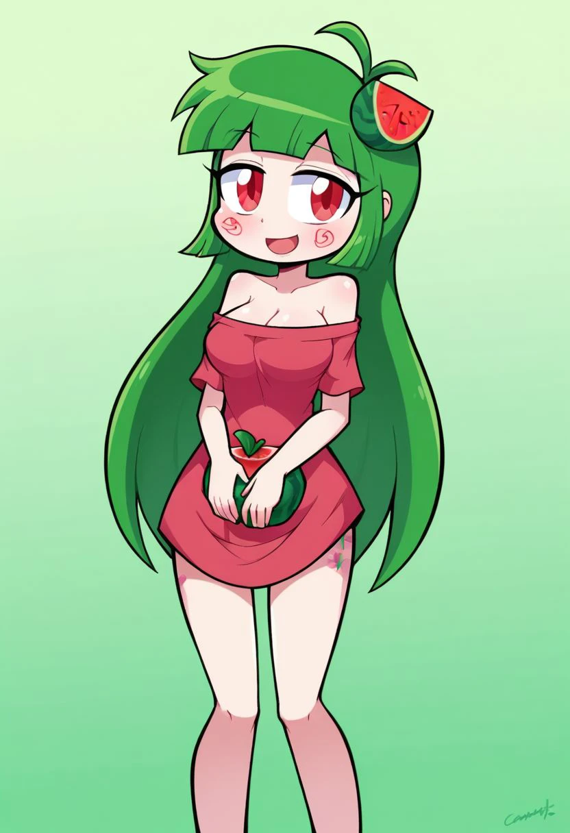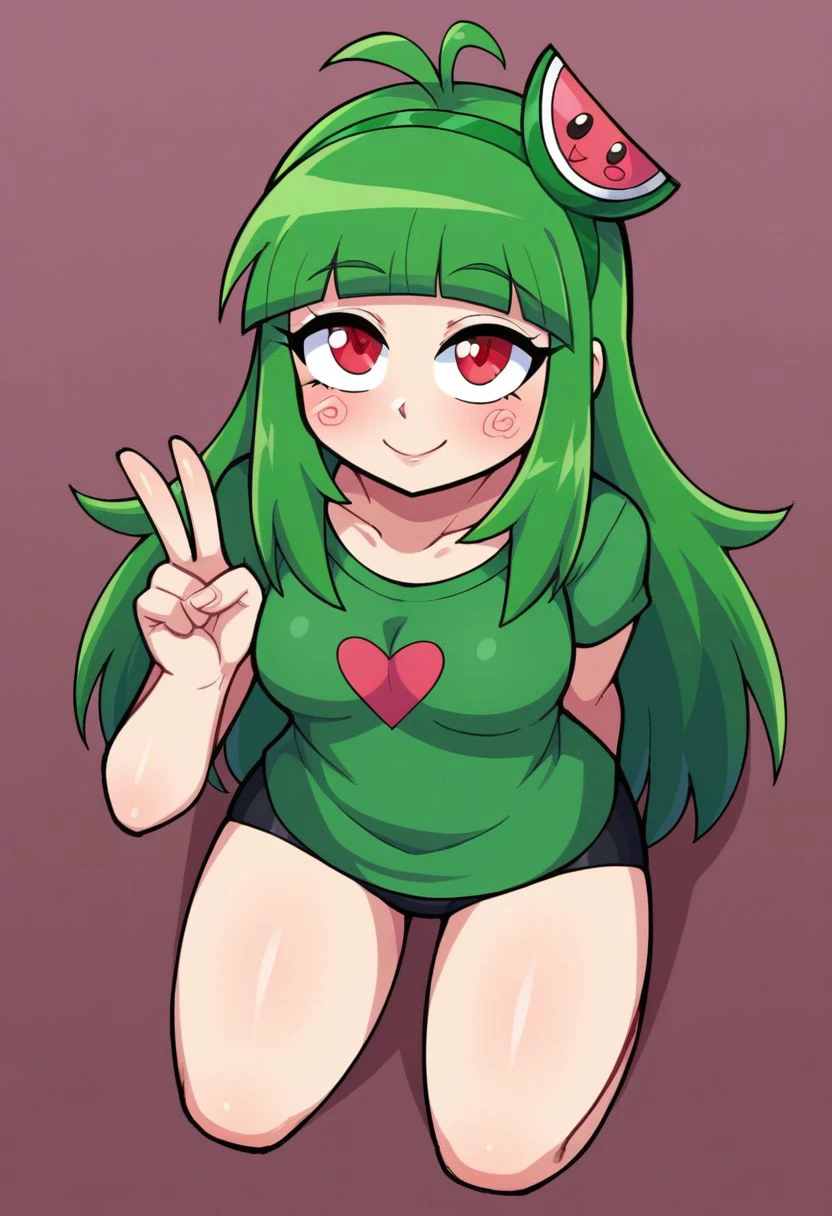 vannamelon, green hair, 1 girl, long hair, solo, fruit, food, red eyes