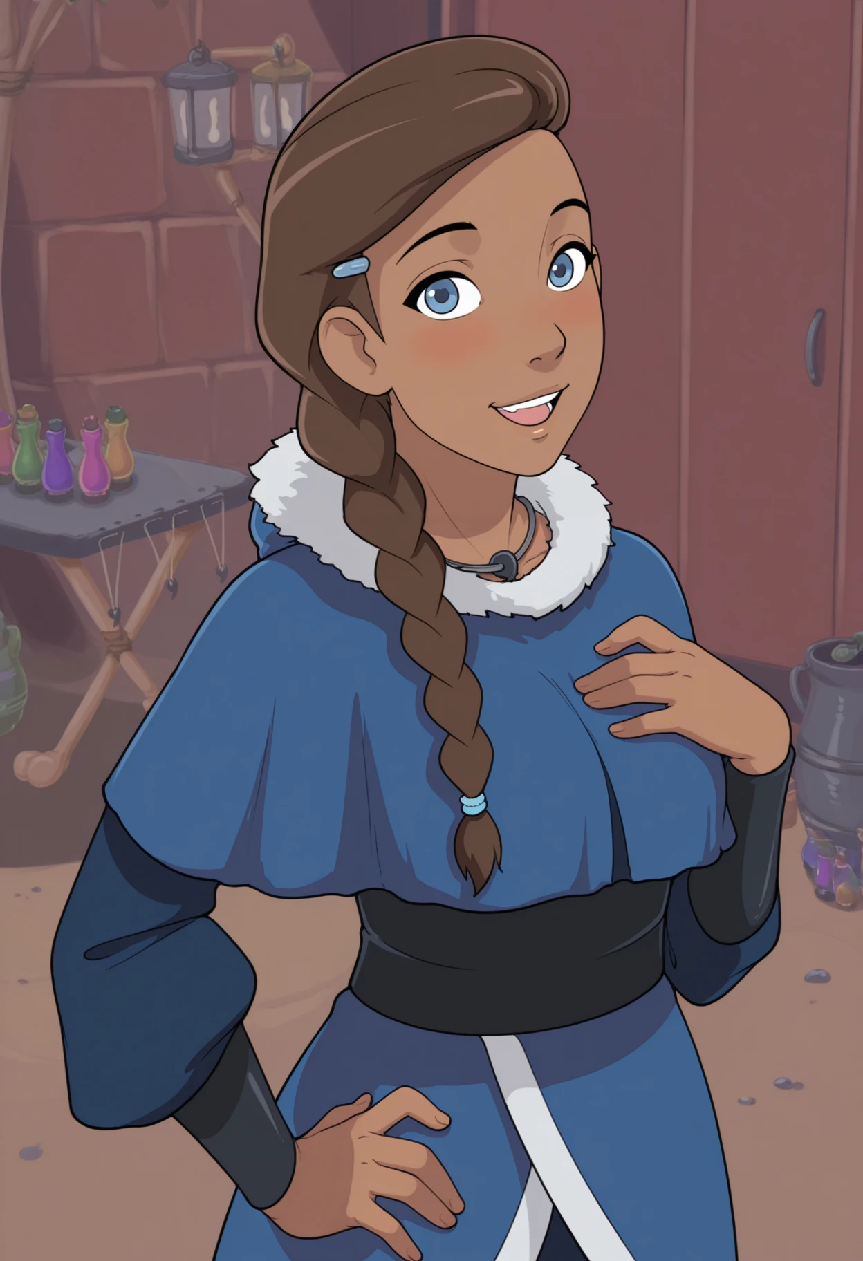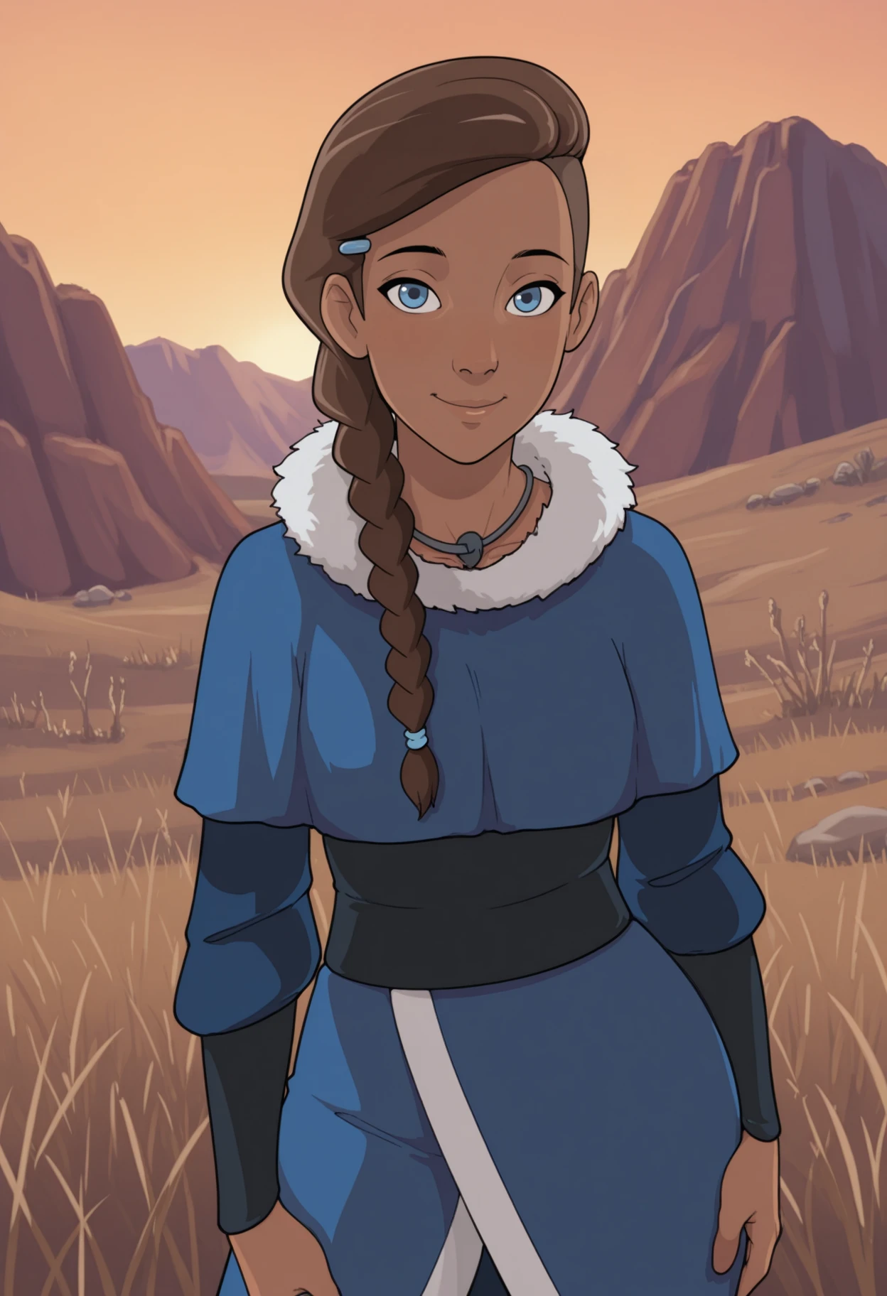 1girl, solo, dark skin, dark-skinned female, blue eyes, brown hair, long hair, braid, single braid, hair over shoulder, asymmetrical hair, hair ornament, hairclip,