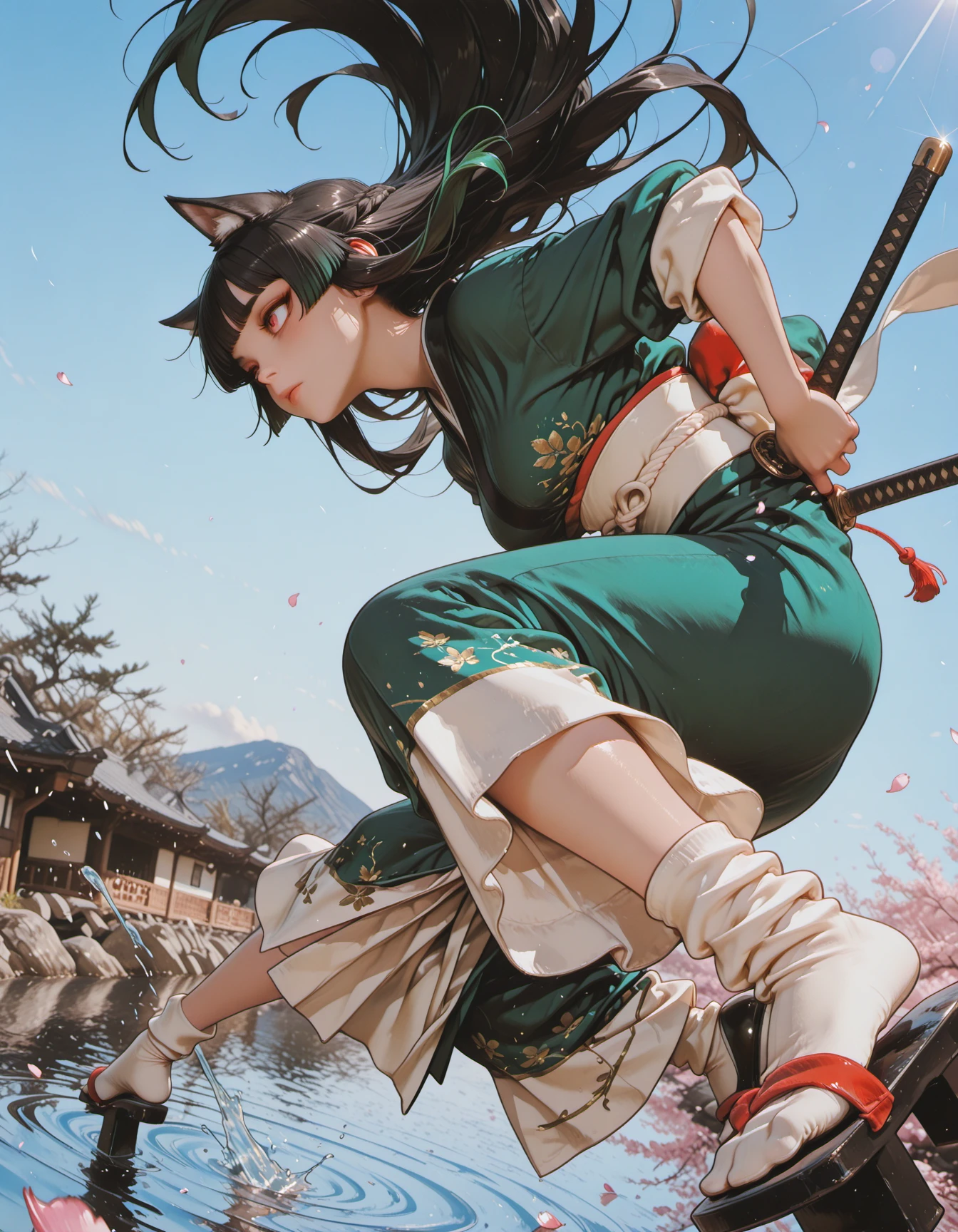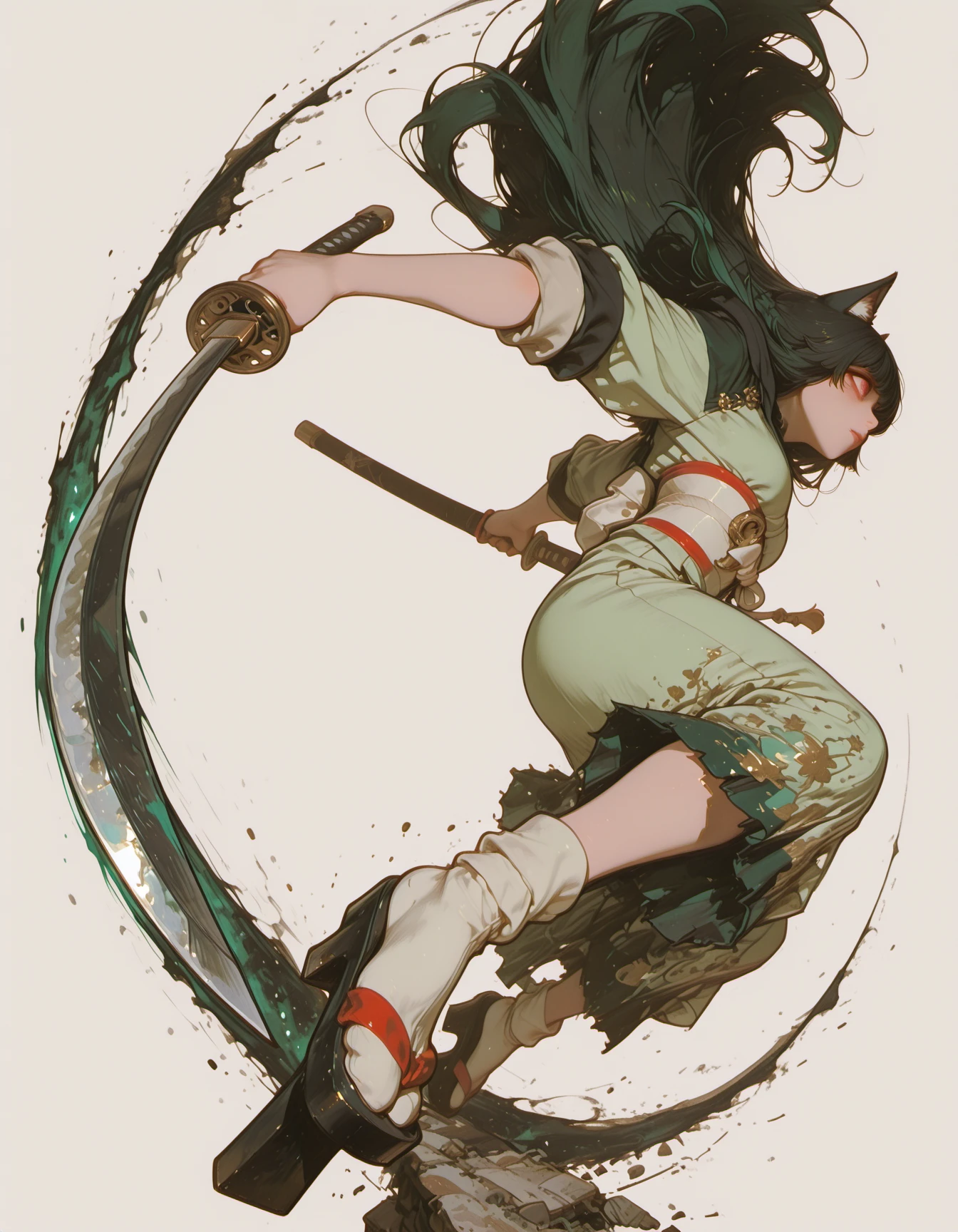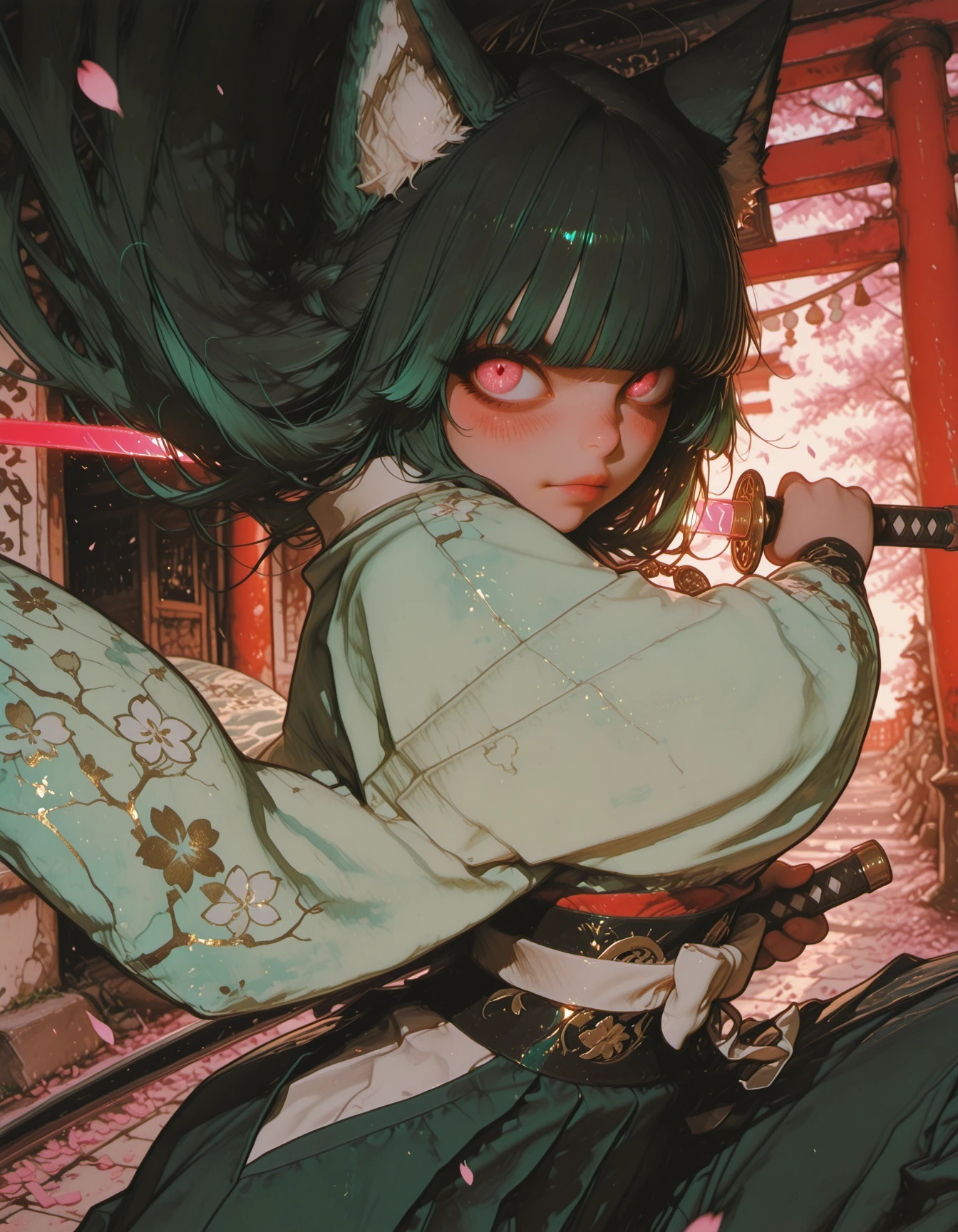 She wears a green floral kimono secured with a vivid red obi, a visual anchor that contrasts her otherwise subdued palette. Her katana is always within reach, handled not as a weapon of aggression, but as an extension of her will.
