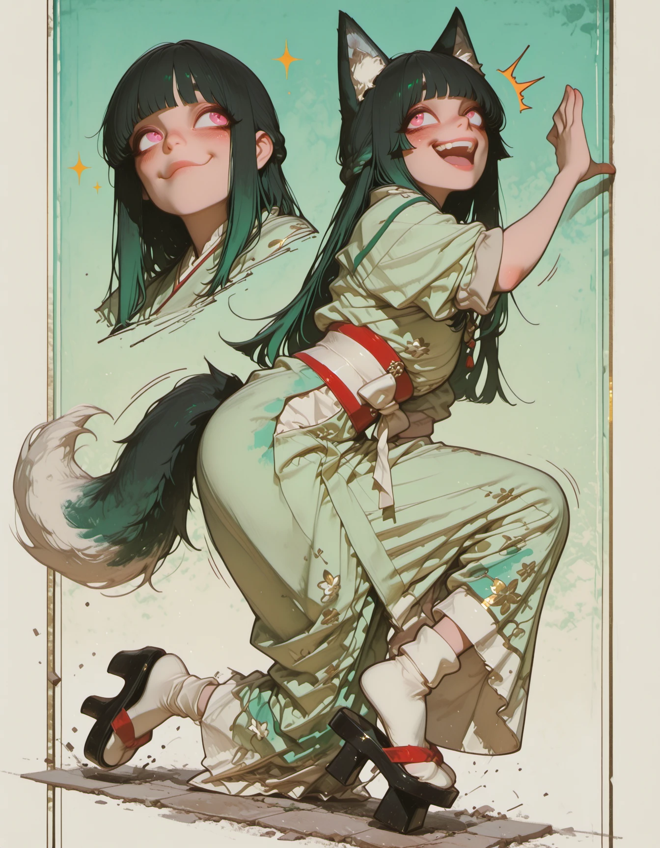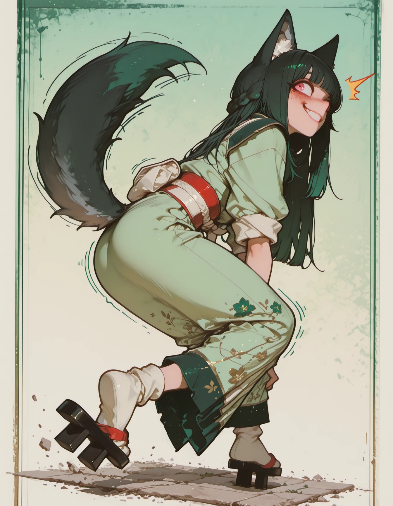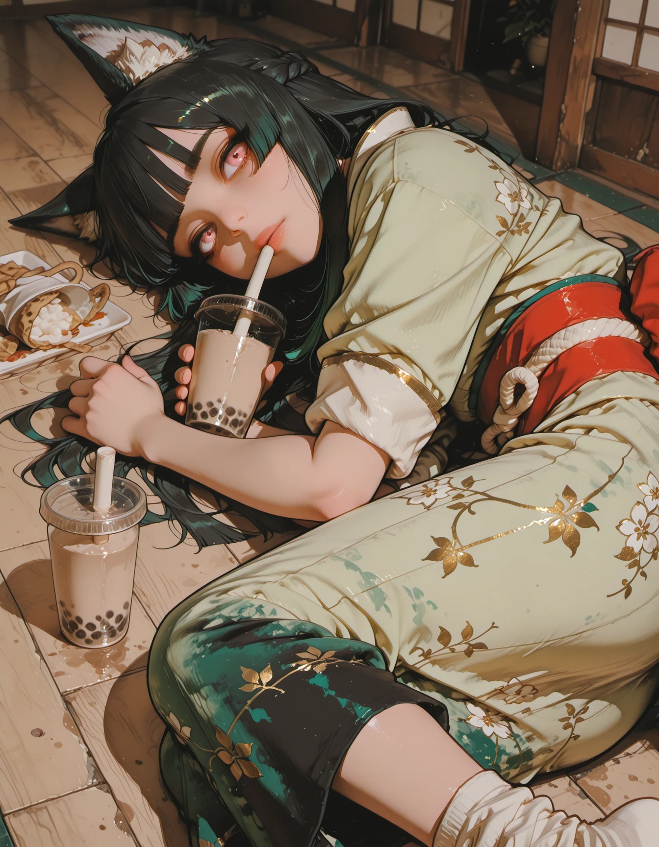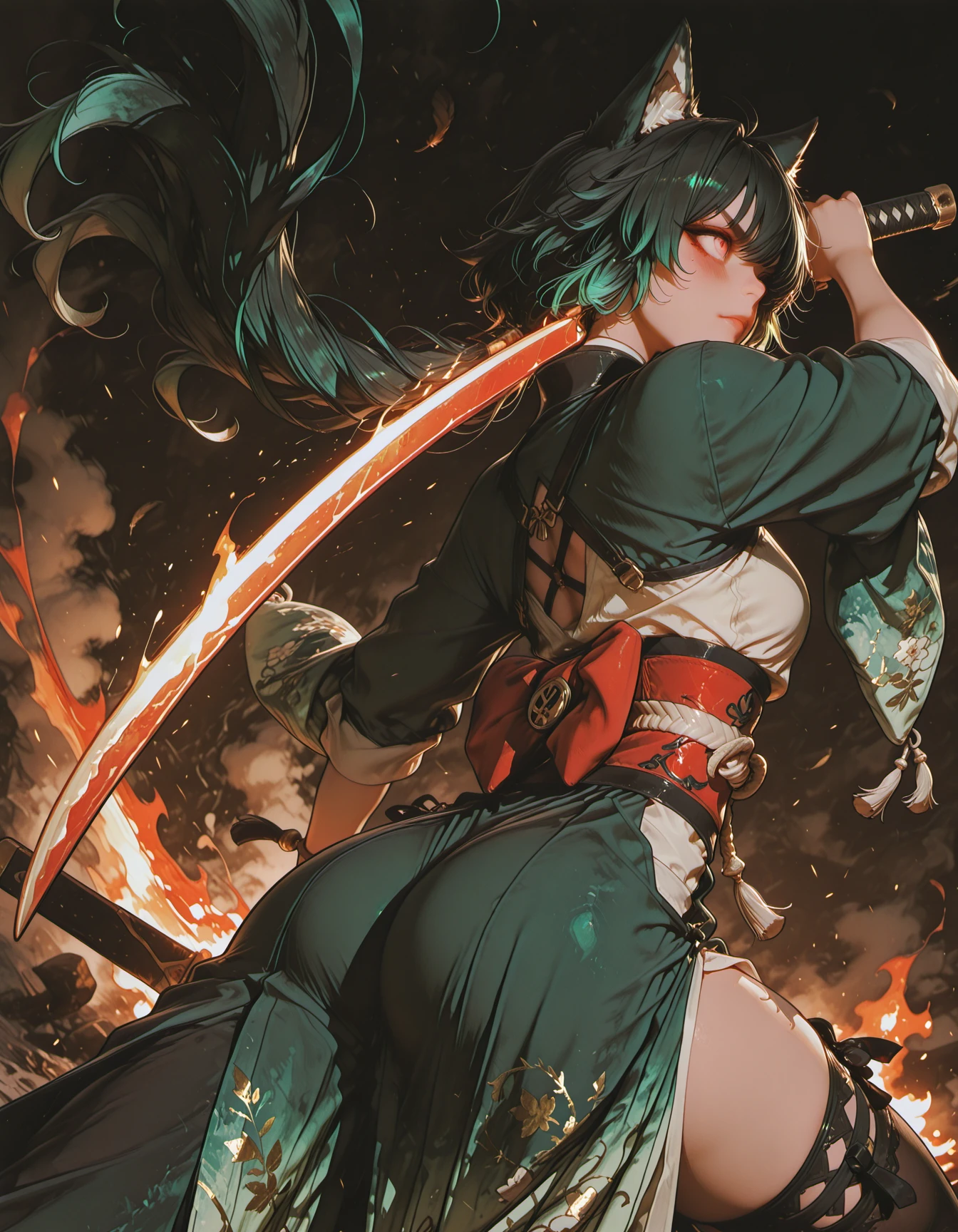 She wears a green floral kimono secured with a vivid red obi, a visual anchor that contrasts her otherwise subdued palette. Her katana is always within reach, handled not as a weapon of aggression, but as an extension of her will.