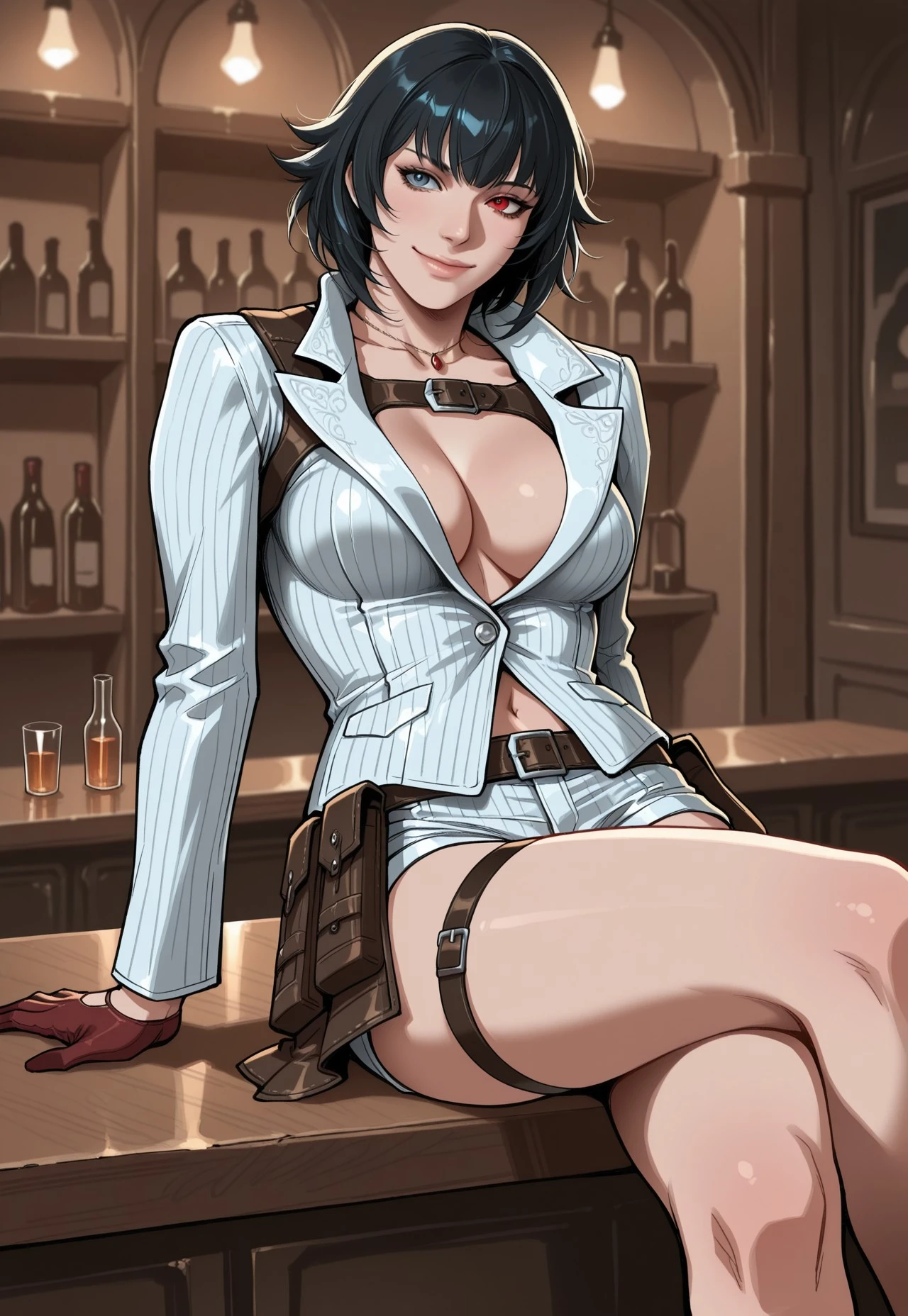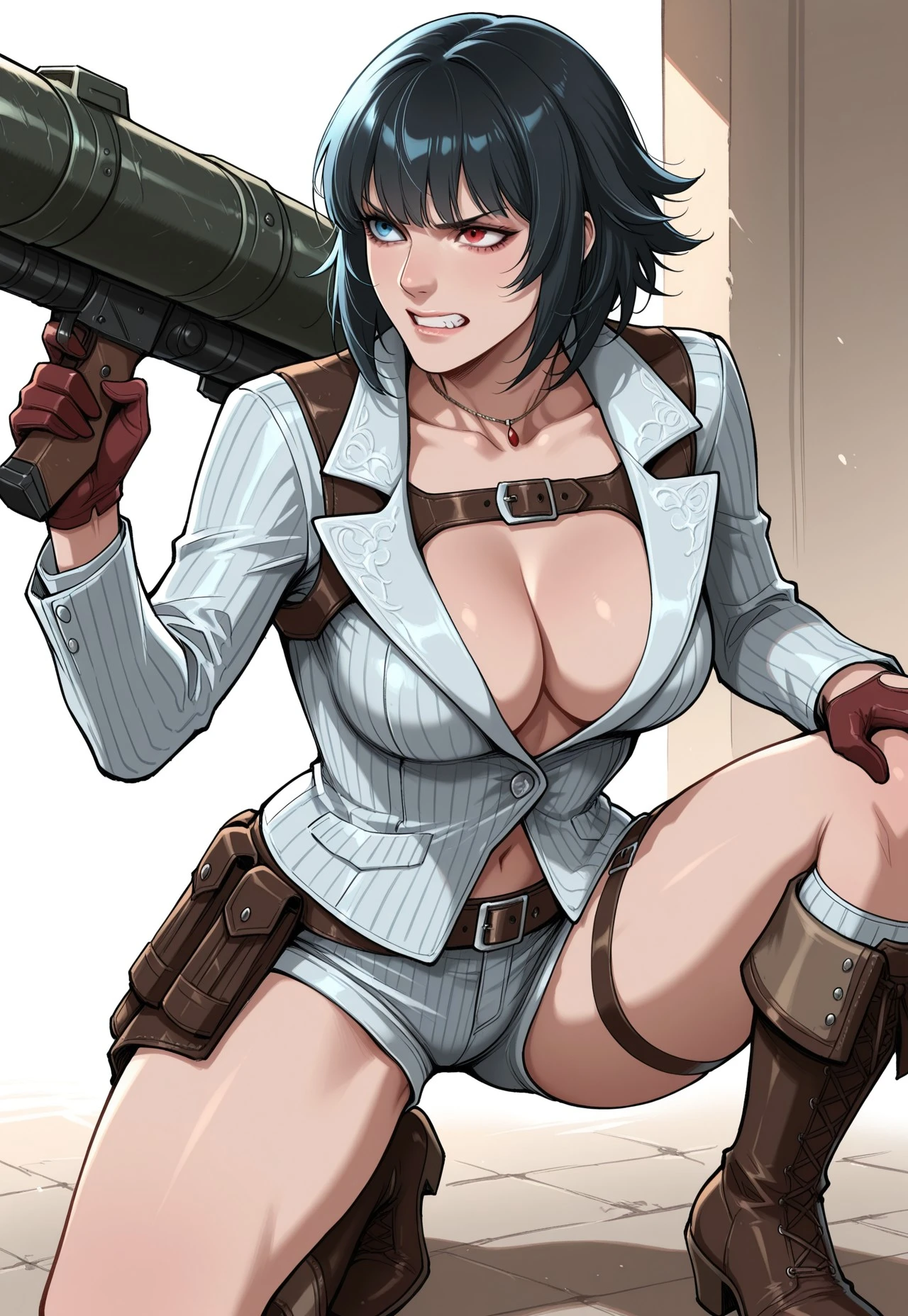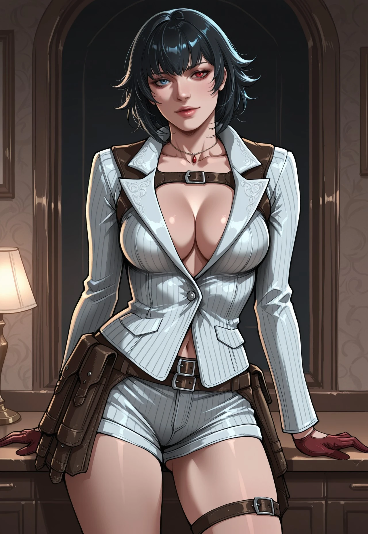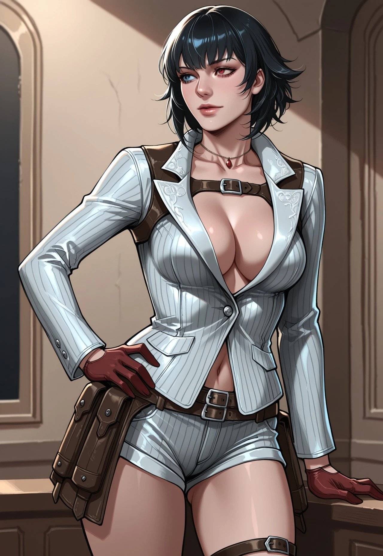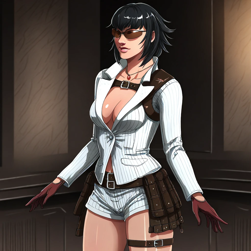 • Suit jacket, cleavage, short shorts, skirt, necklace, belt, harness, gloves, thigh strap, knee boots,