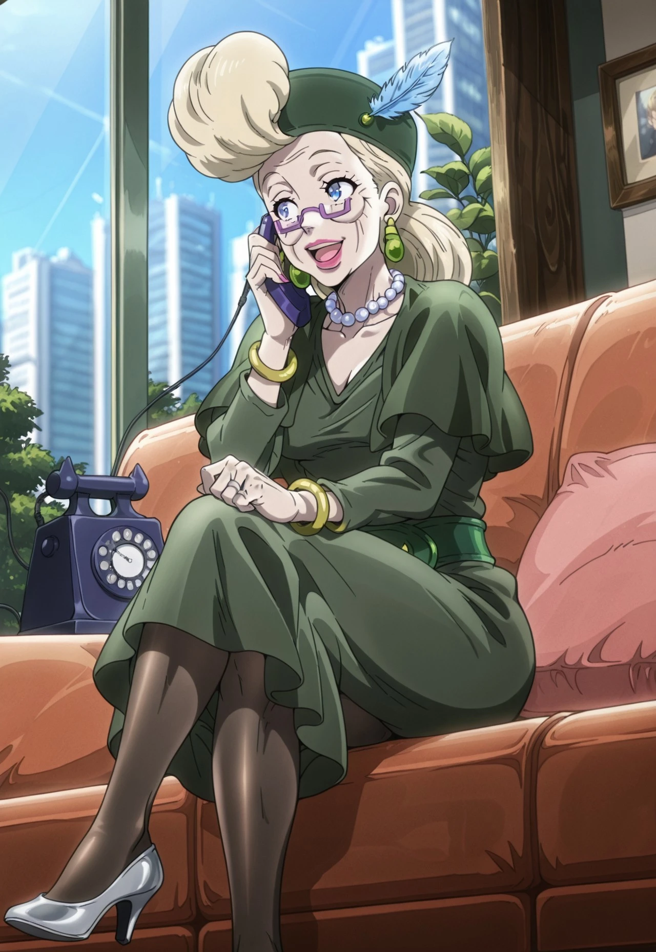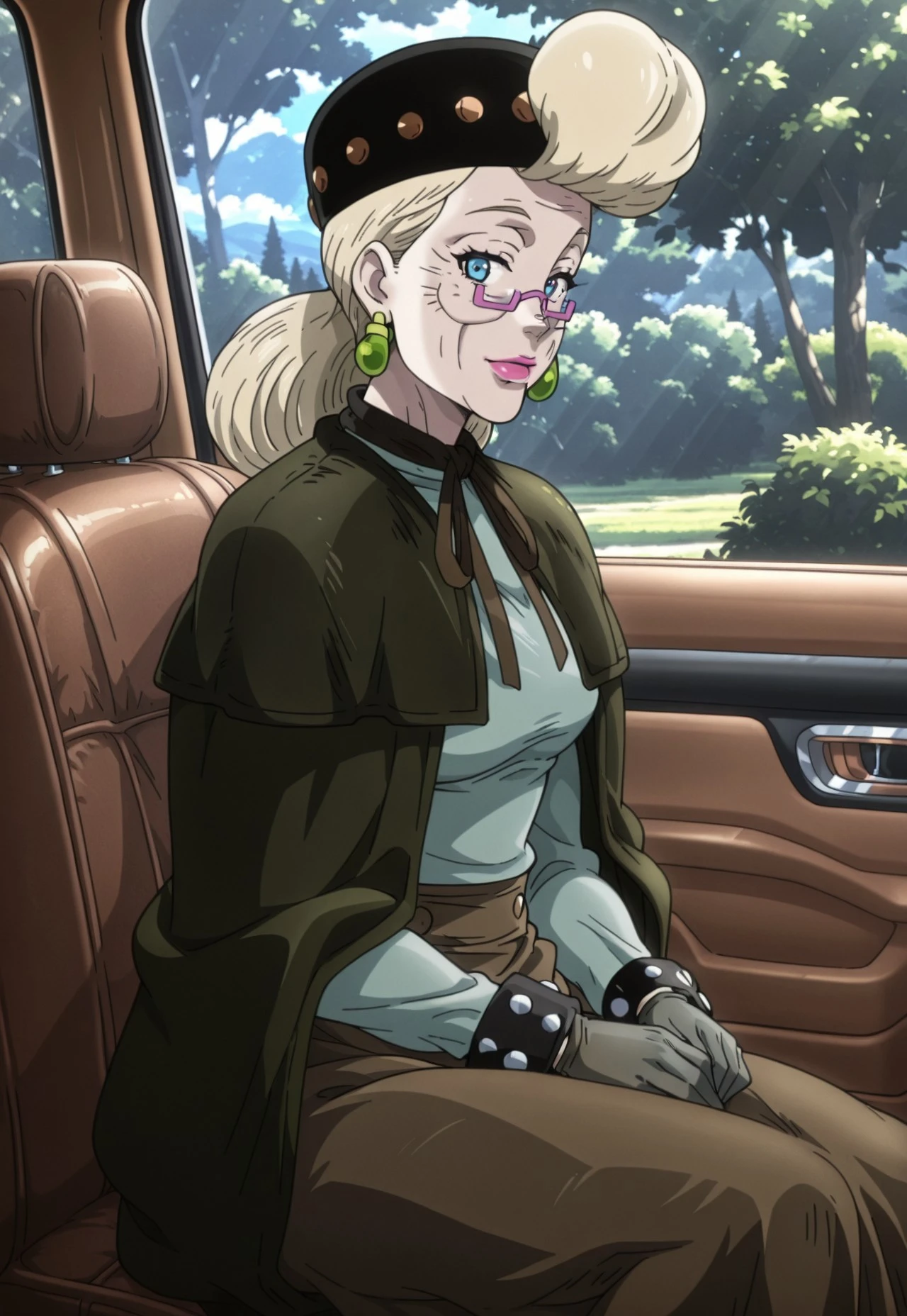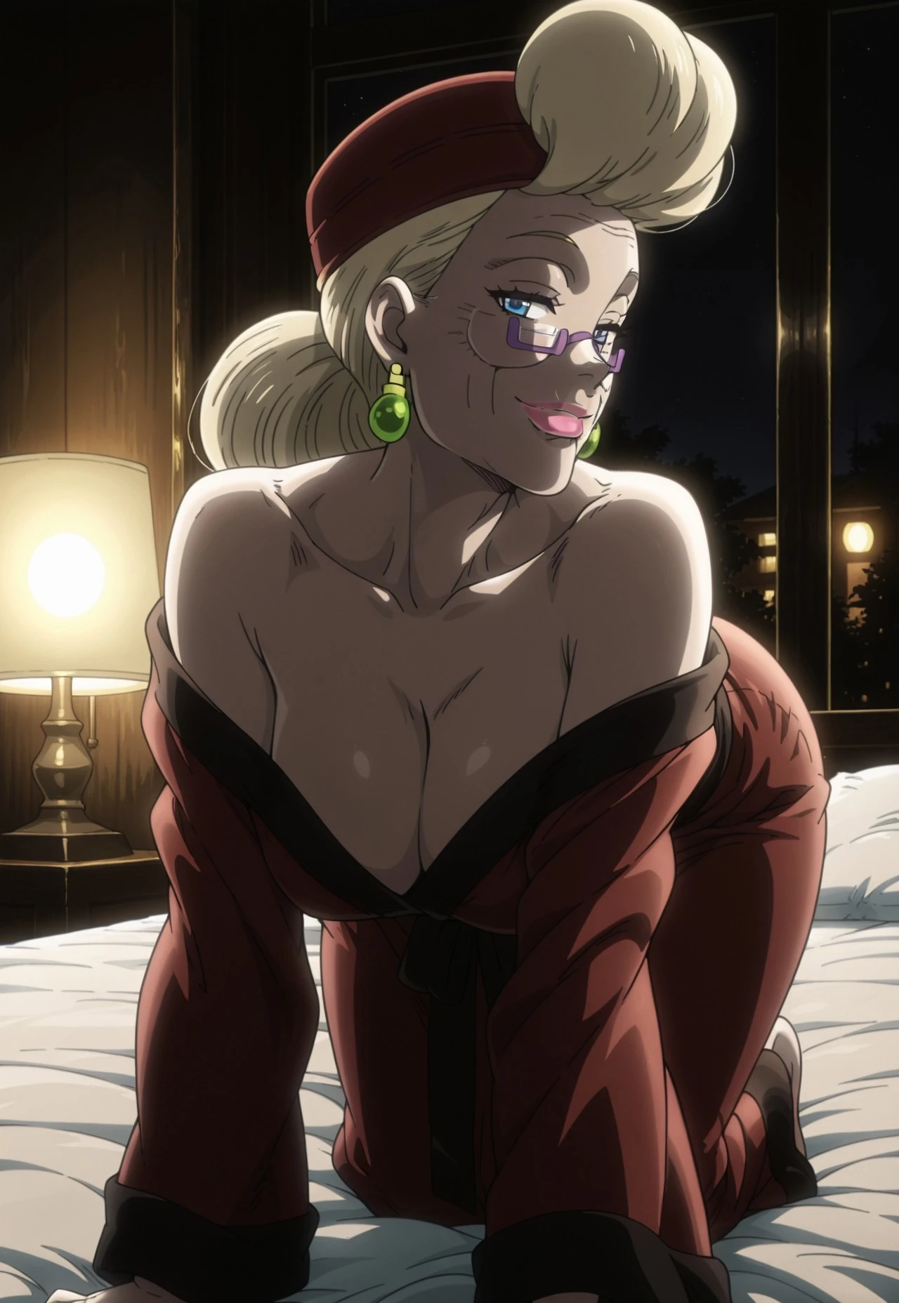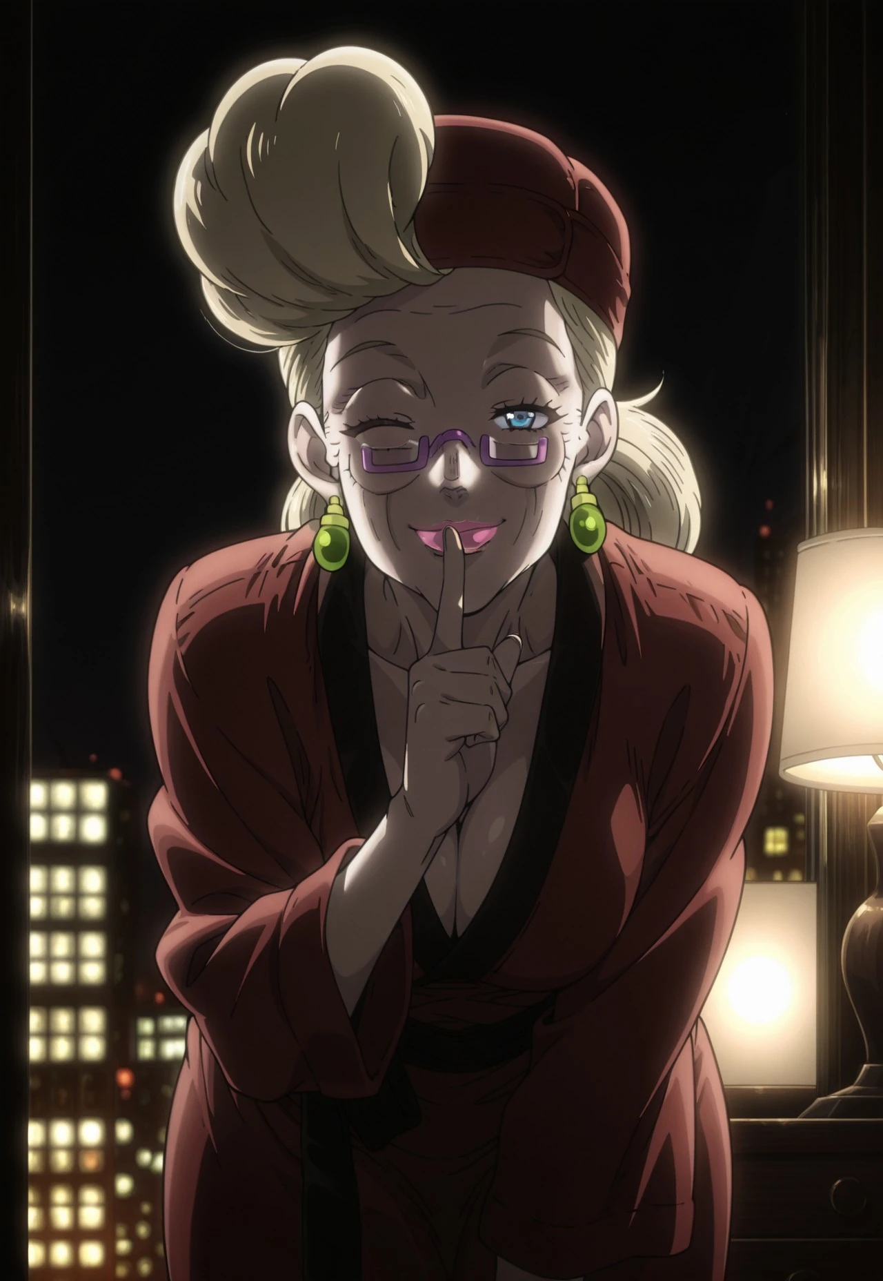 Blonde Hair, Blue Eyes, Pink Lipstick, Purple Glasses, Green Earrings, MatureOutfit 1 (Illustrious)
