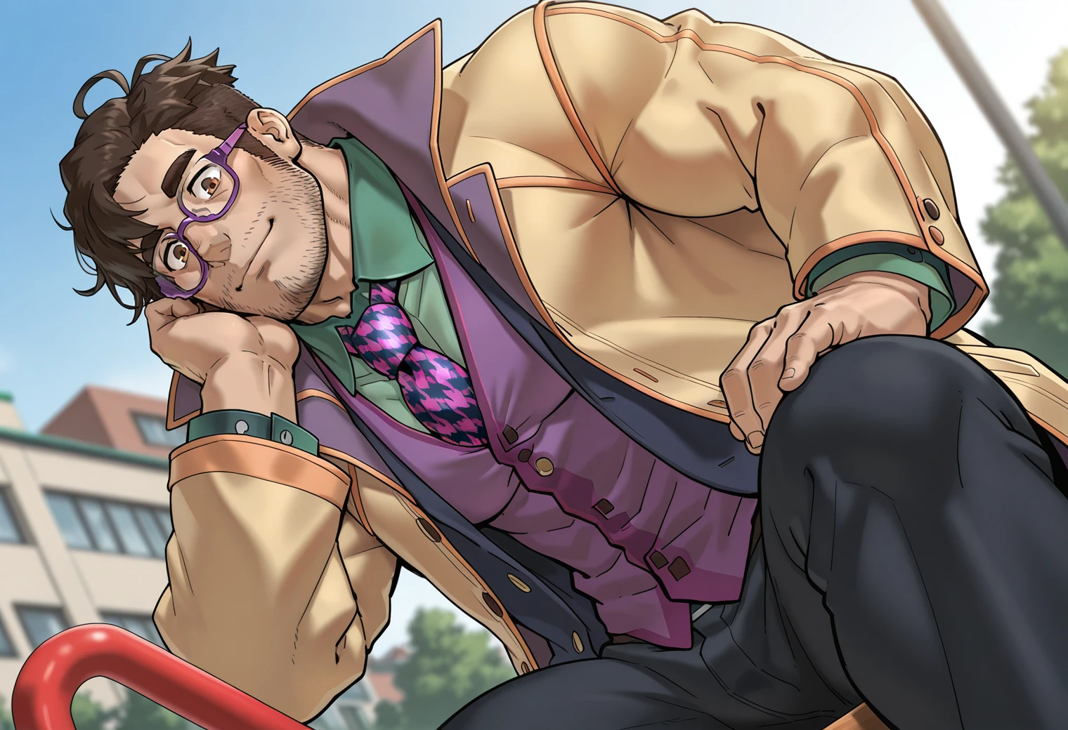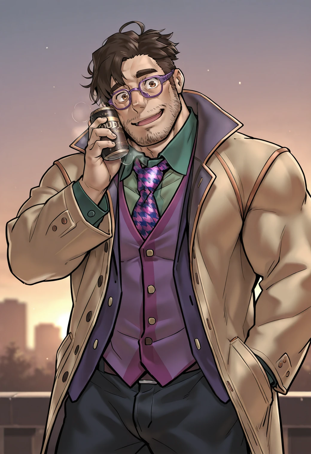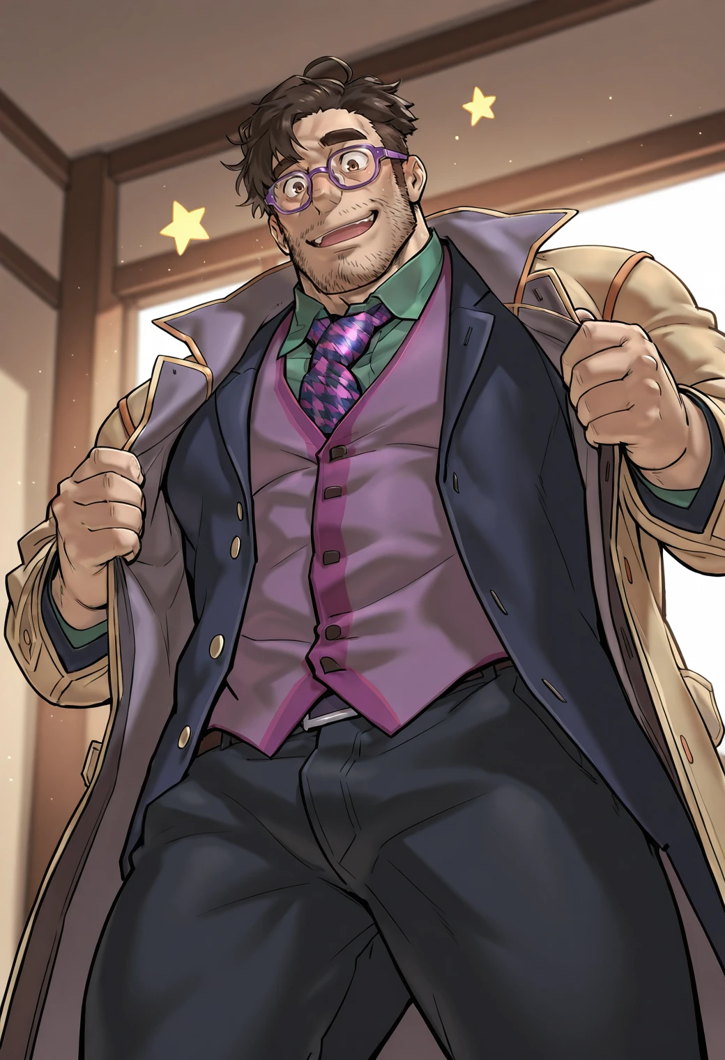 facial hair, beard stubble, collared coat, , purple vest, green shirt, black pants, houndstooth necktie, purple-framed eyewear