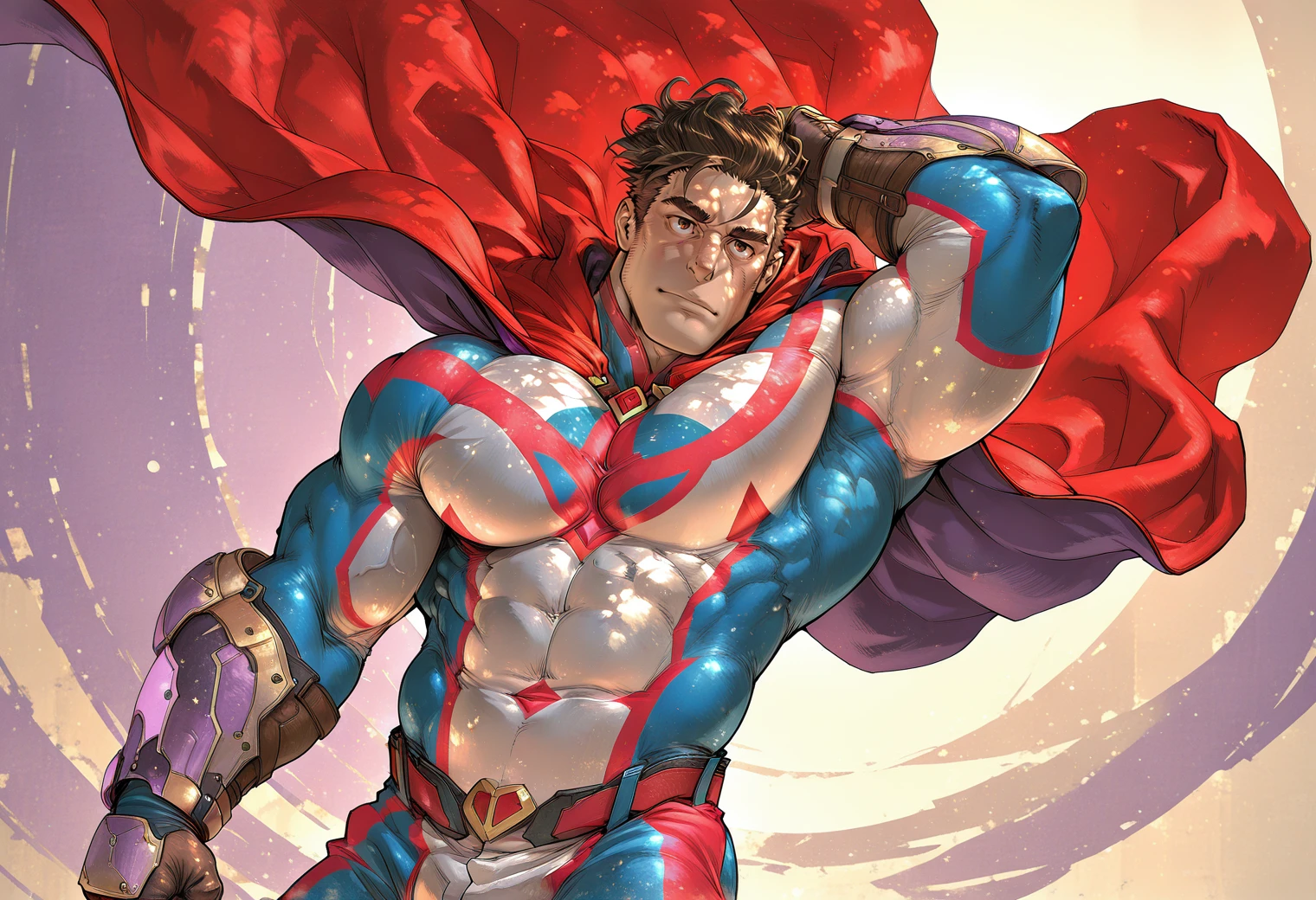 narihito_bodysuit, hair slicked back, red cape, gloves, arm guards