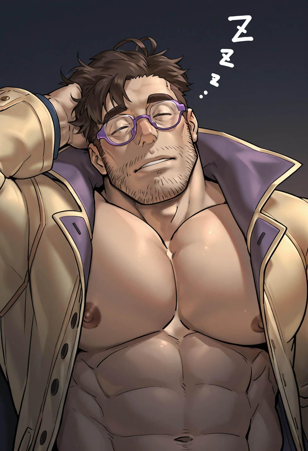 facial hair, beard stubble, collared coat, open jacket, purple vest, green shirt, black pants, houndstooth necktie, purple-framed eyewearHero