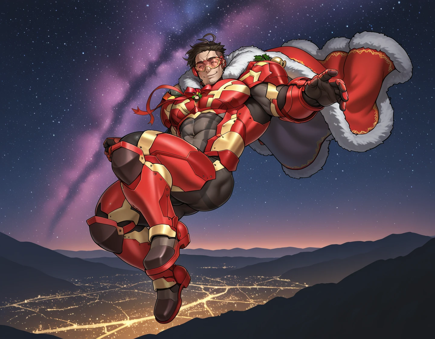 narihito_power_armor, facial hair, goatee stubble, goggles, earpiece, fur-trimmed cape, jingle bell, red ribbon, holly, gauntlets, skin tightDescription