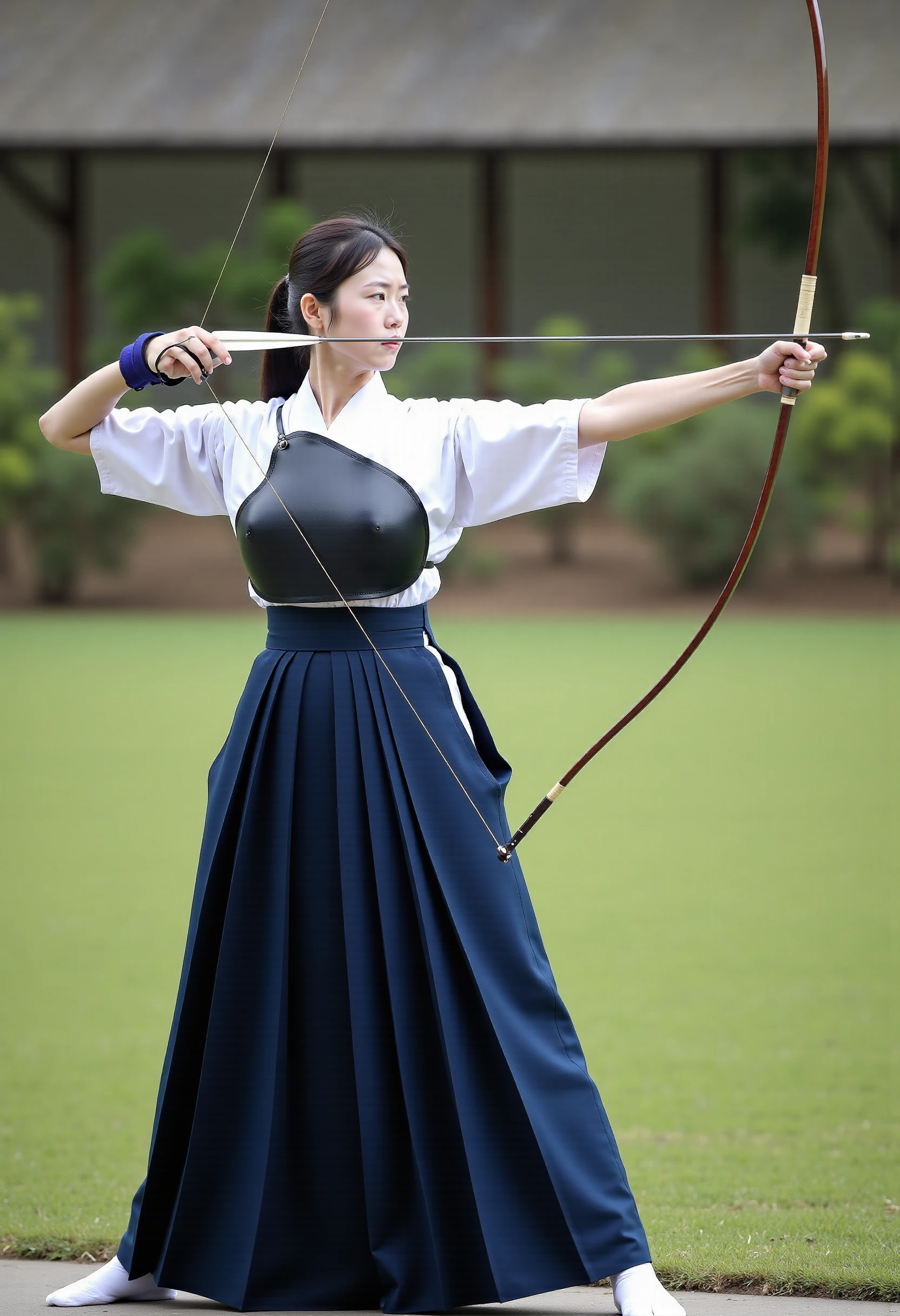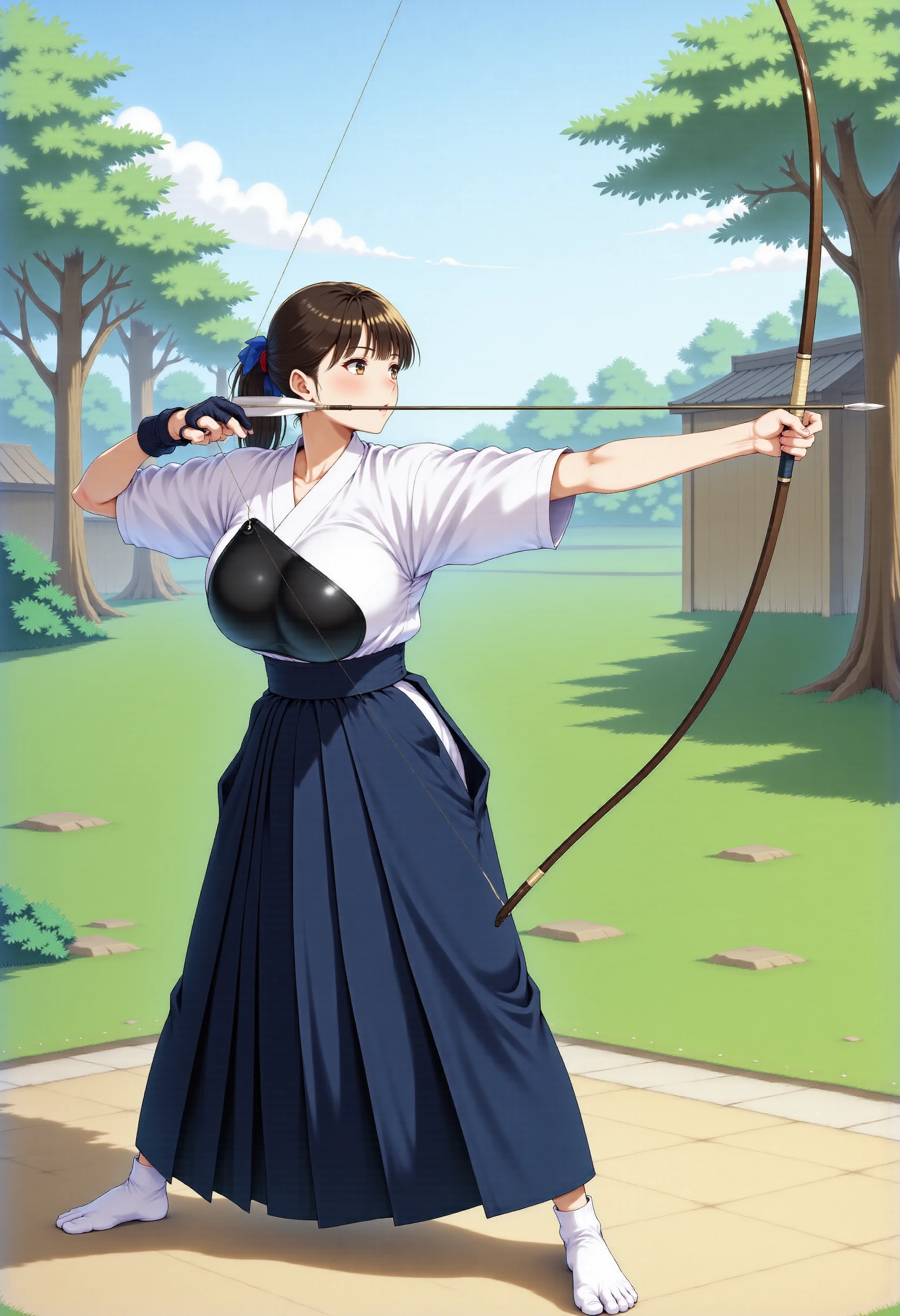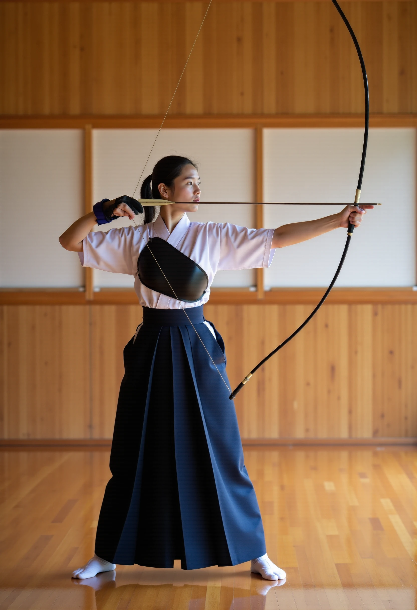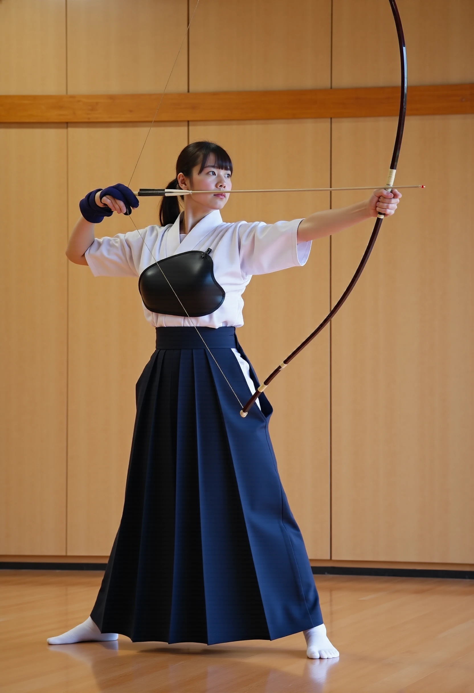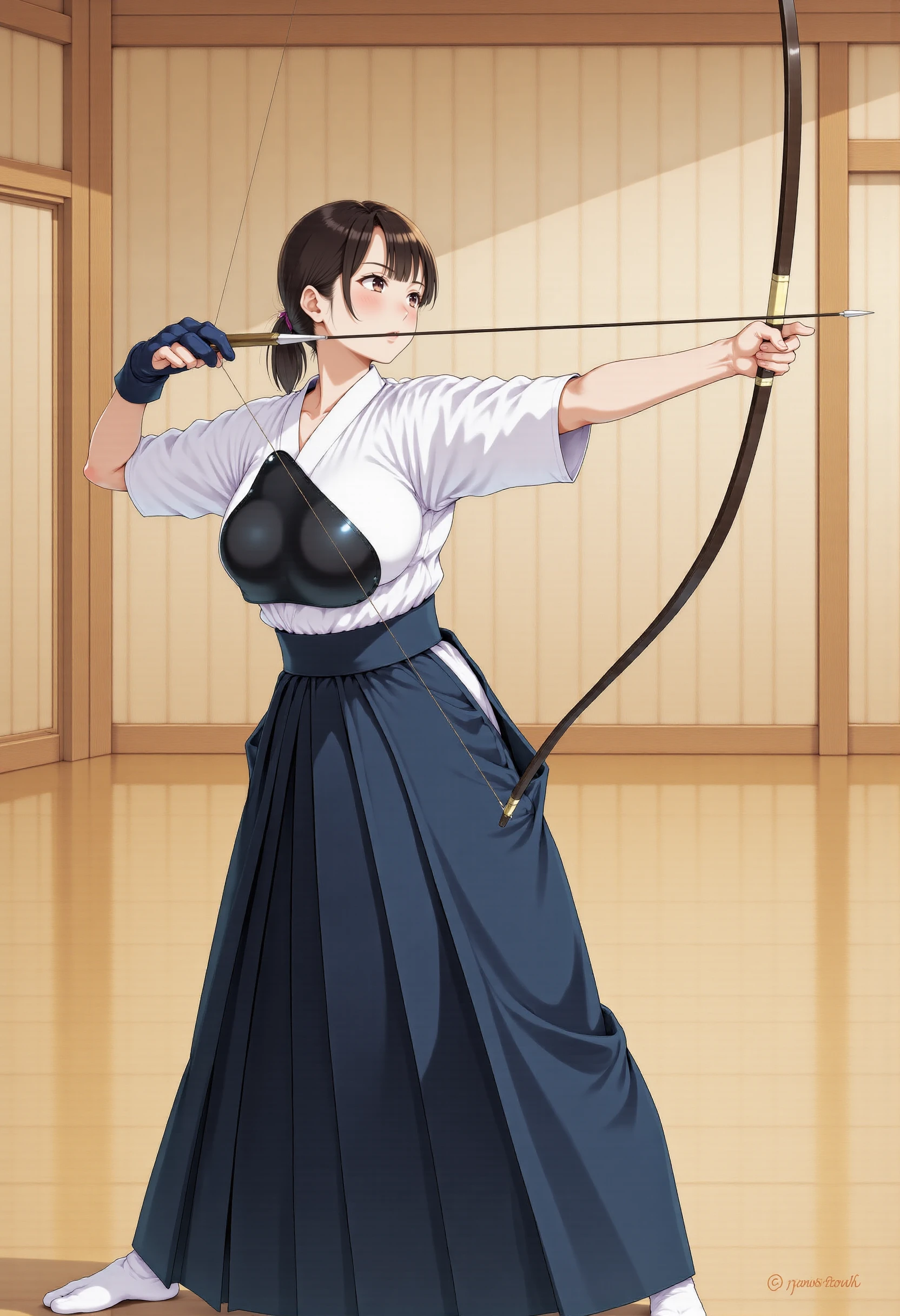 Trigger words : kyudo-aiming,aiming,arrow (projectile),bow (weapon),drawing bow,holding arrow,holding bow (weapon),partially fingerless gloves,yugake