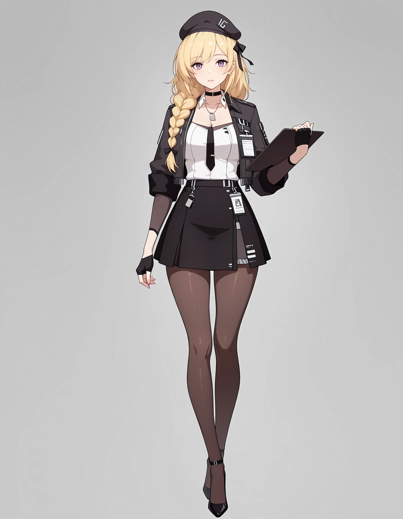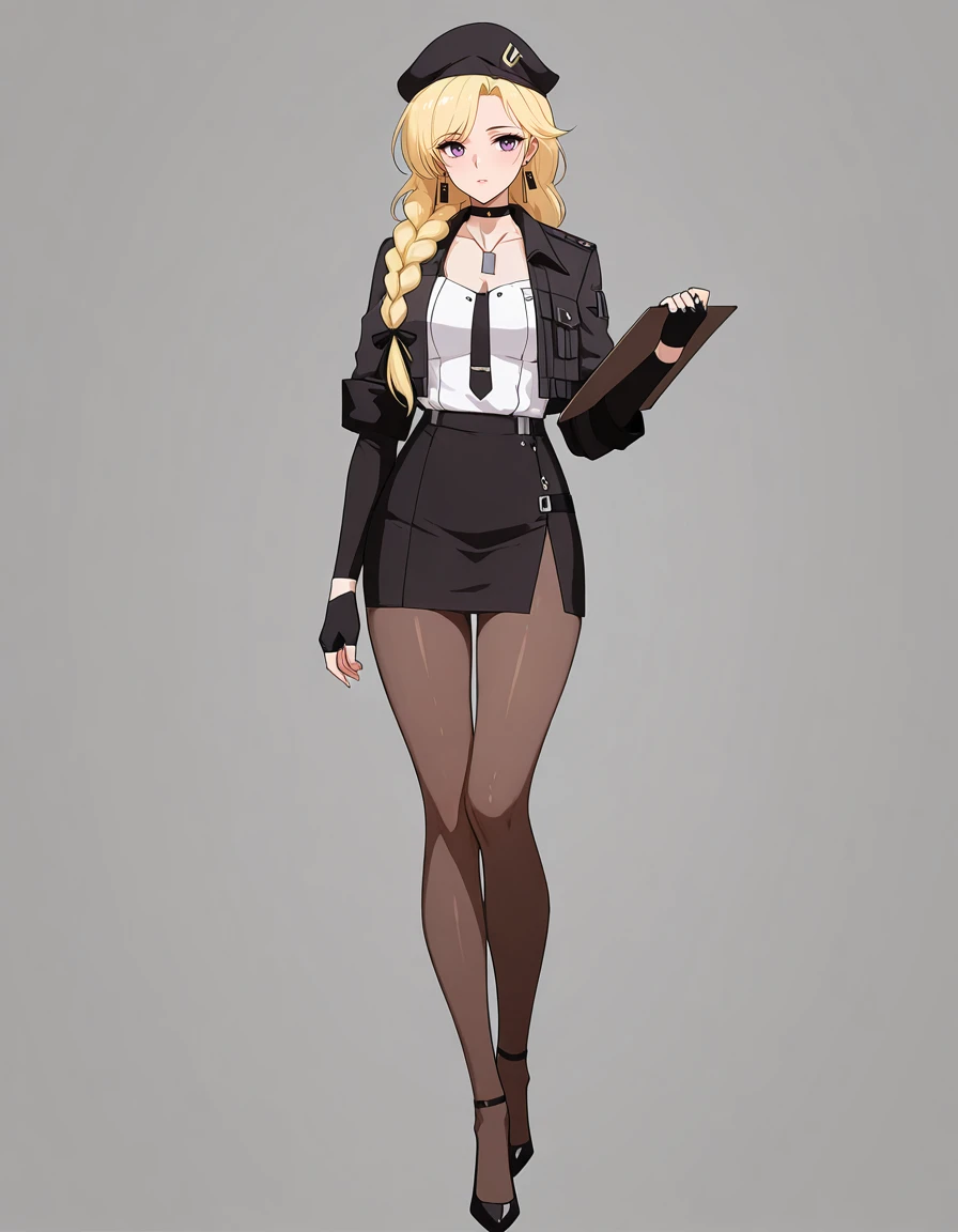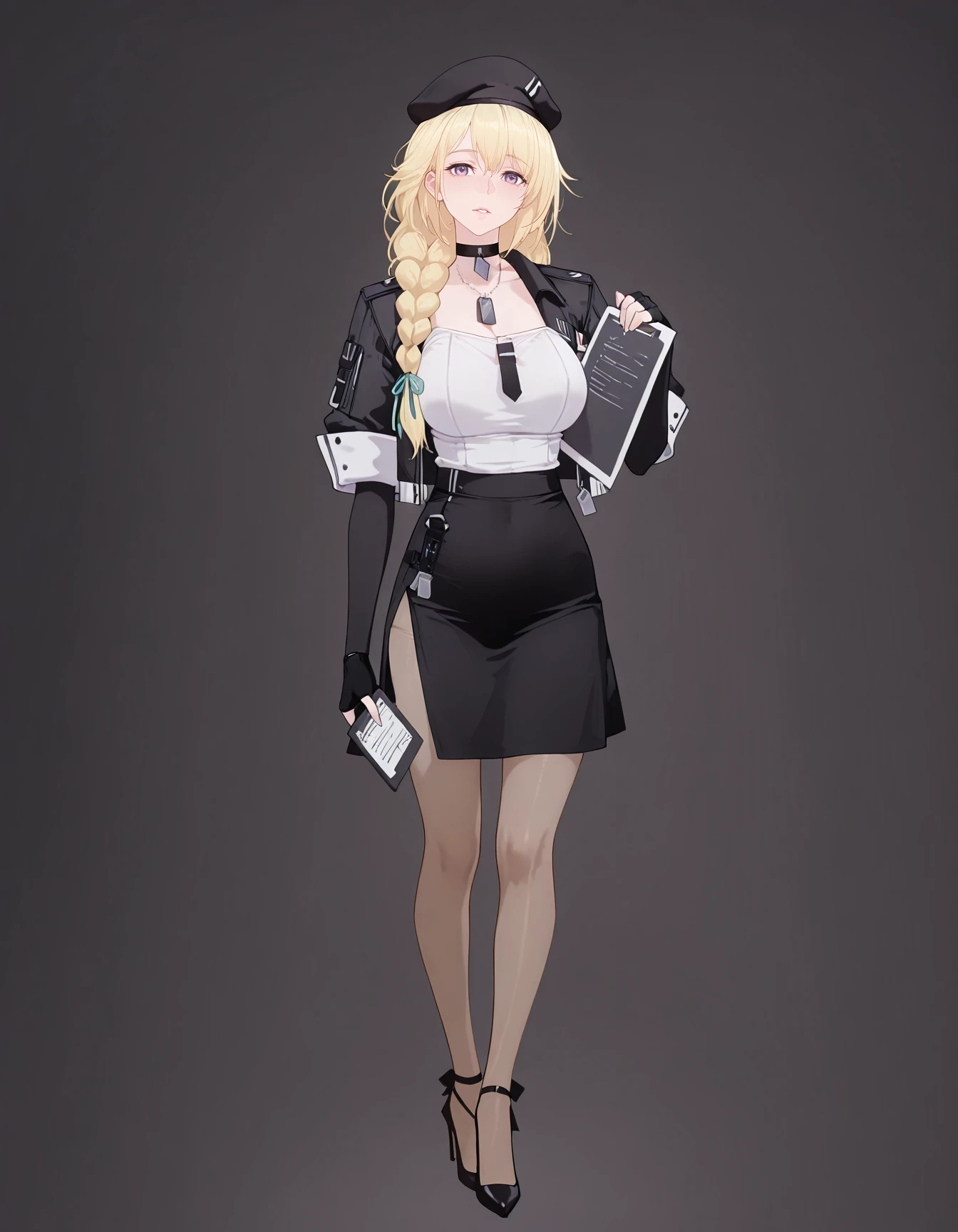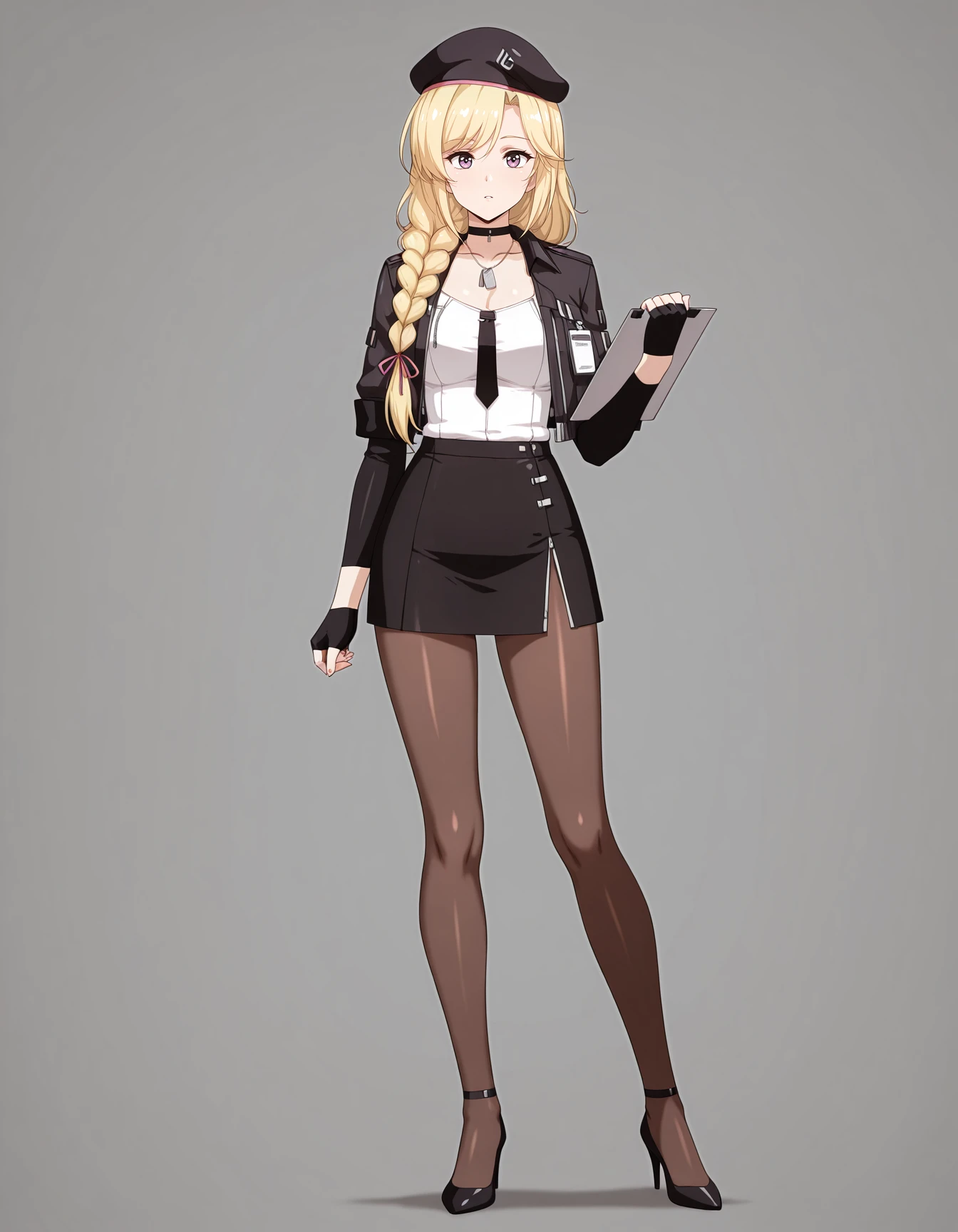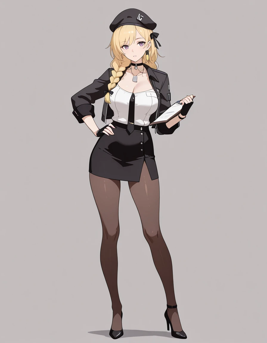 maipgrsailika,1girl,mature female,(aged_up:1.5),solo,long_hair,blonde_hair,twin_braids,hair_ribbon,purple_eyes,beret,black_headwear,choker,detached_collar,dog_tags,white_shirt,open_jacket,black_jacket,long_sleeves,black_necktie,fingerless_gloves,black_gloves,black_skirt,brown_pantyhose,high_heels,black_footwear,holding_clipboard