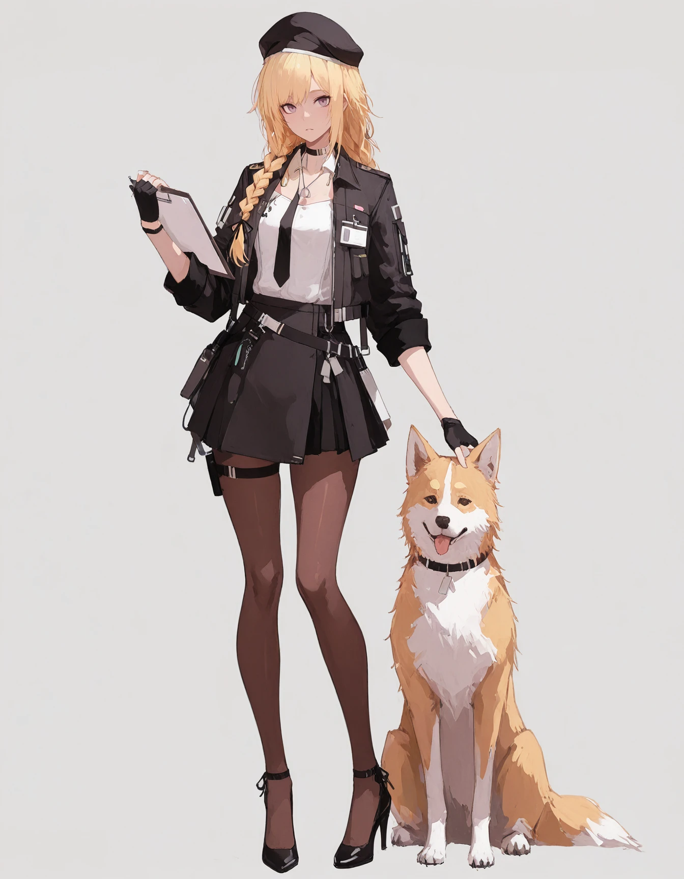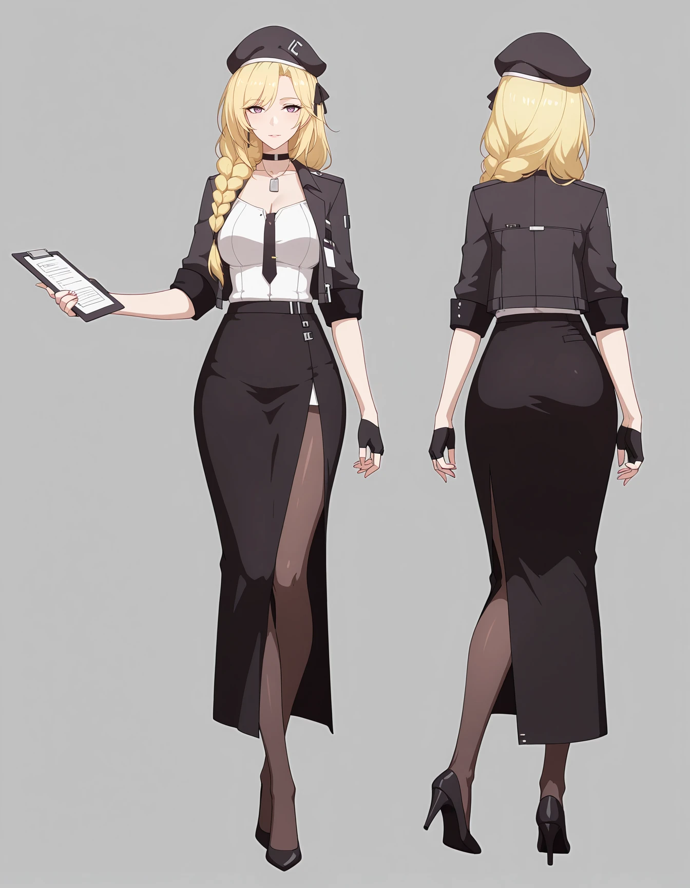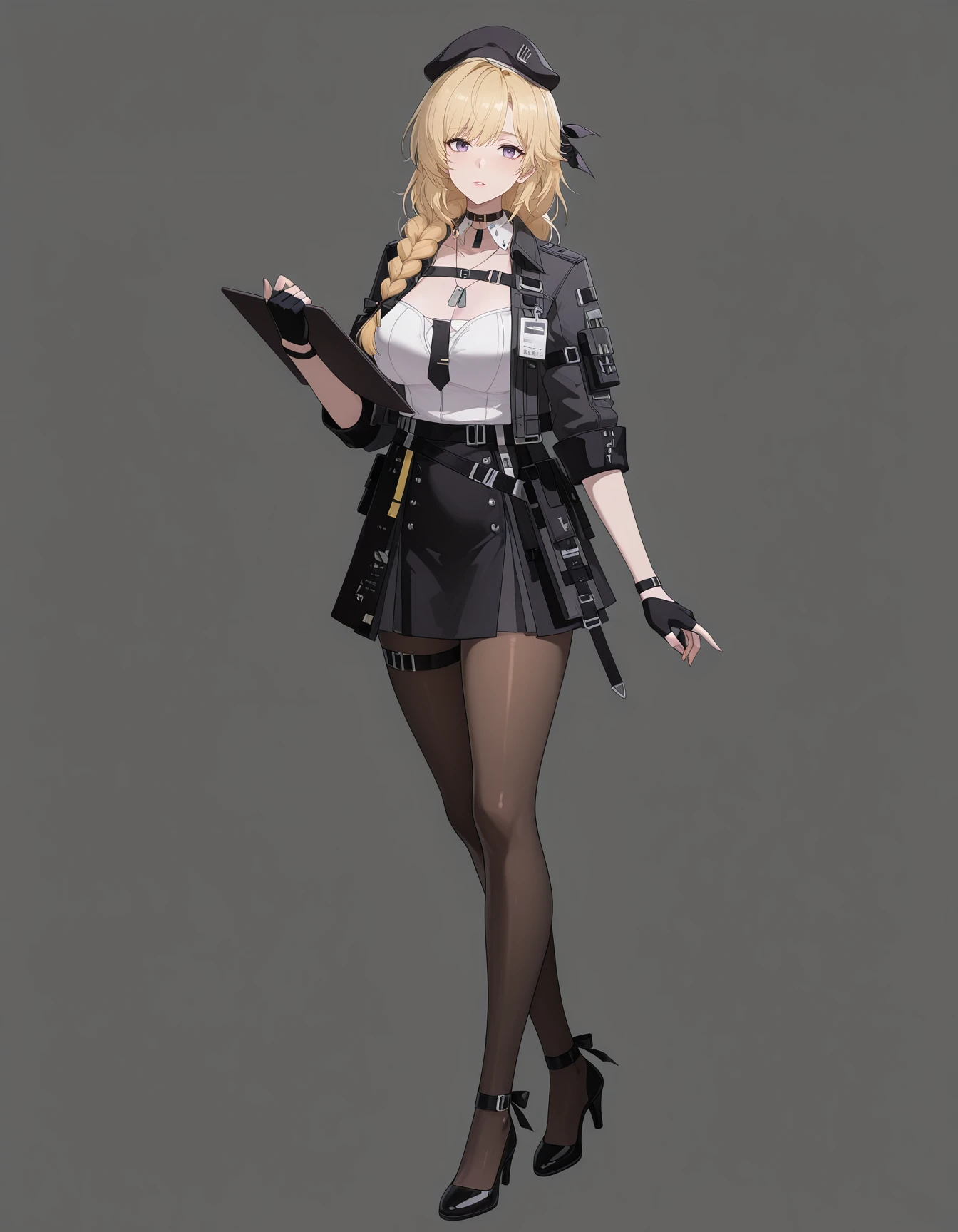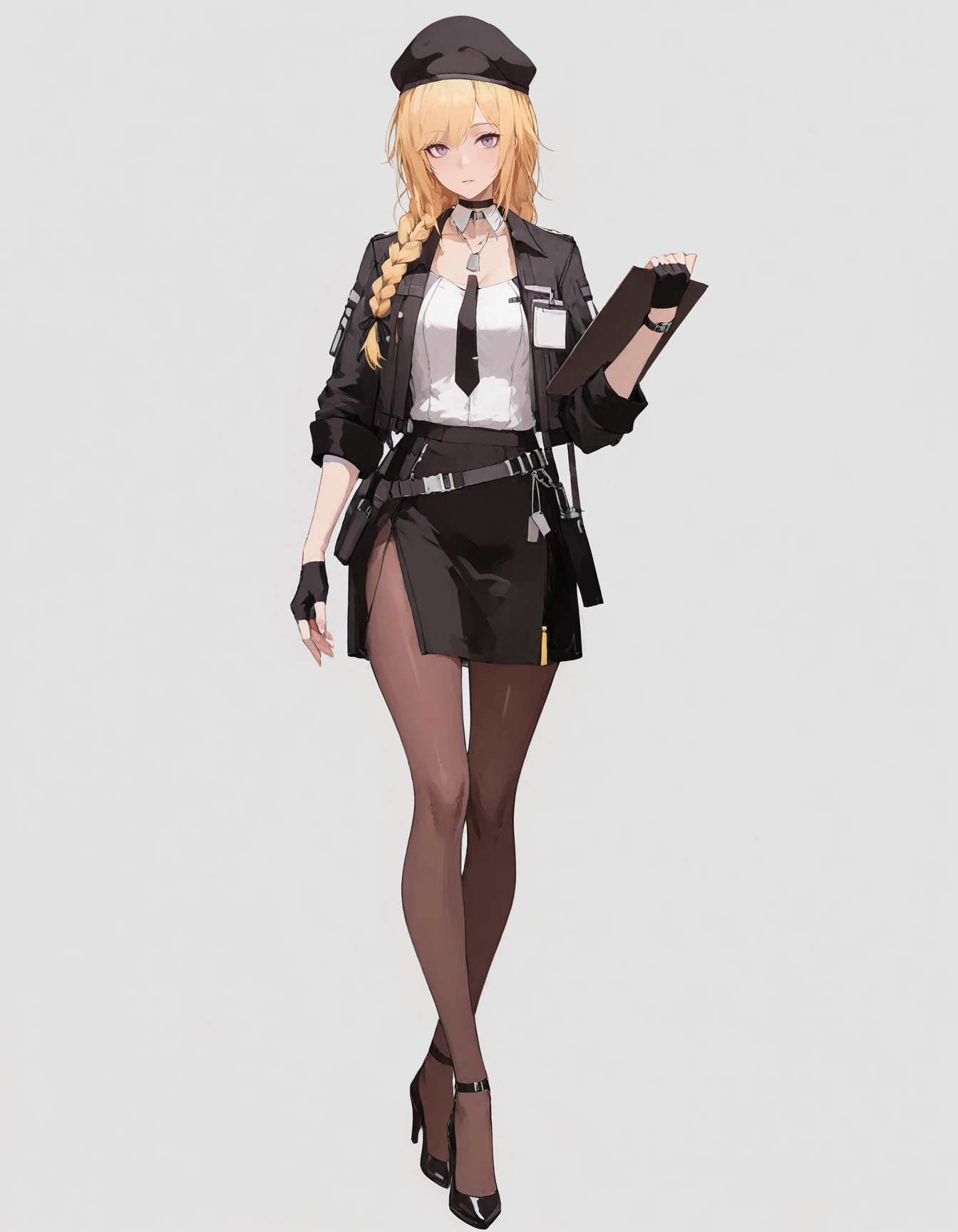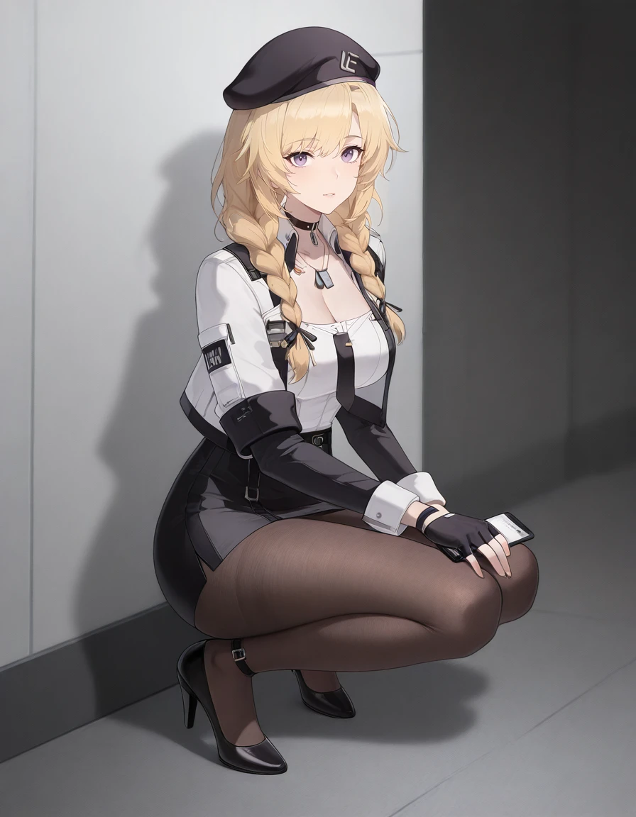maipgrsailika,1girl,mature female,(aged_up:1.5),solo,long_hair,blonde_hair,twin_braids,hair_ribbon,purple_eyes,beret,black_headwear,choker,detached_collar,dog_tags,white_shirt,open_jacket,black_jacket,long_sleeves,black_necktie,fingerless_gloves,black_gloves,black_skirt,brown_pantyhose,high_heels,black_footwear,holding_clipboard