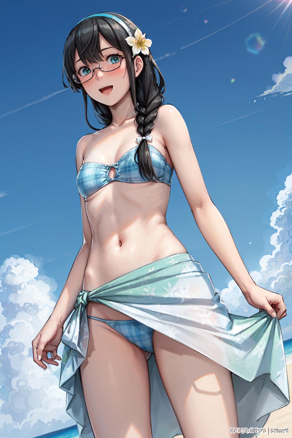 plaid bikini, bandeau, aqua bikini, strapless bikini, collarbone, bare shoulders, bare arms,