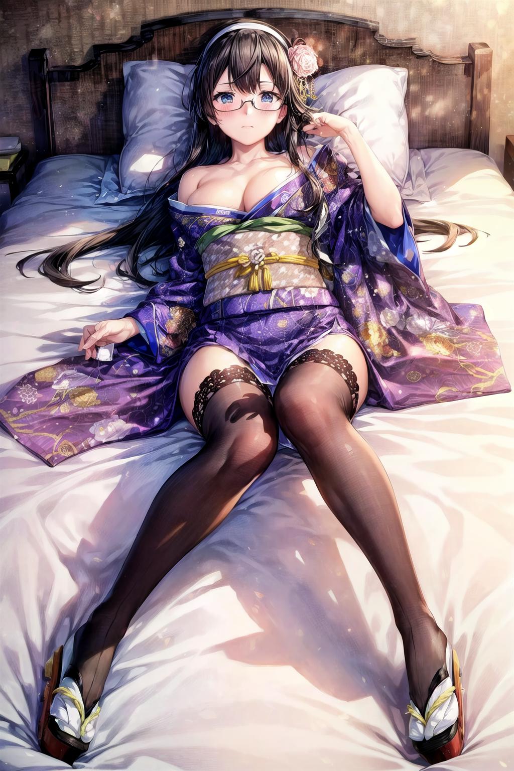 white thighhighs, tabi, sandals,Purple Kimono (Kai)