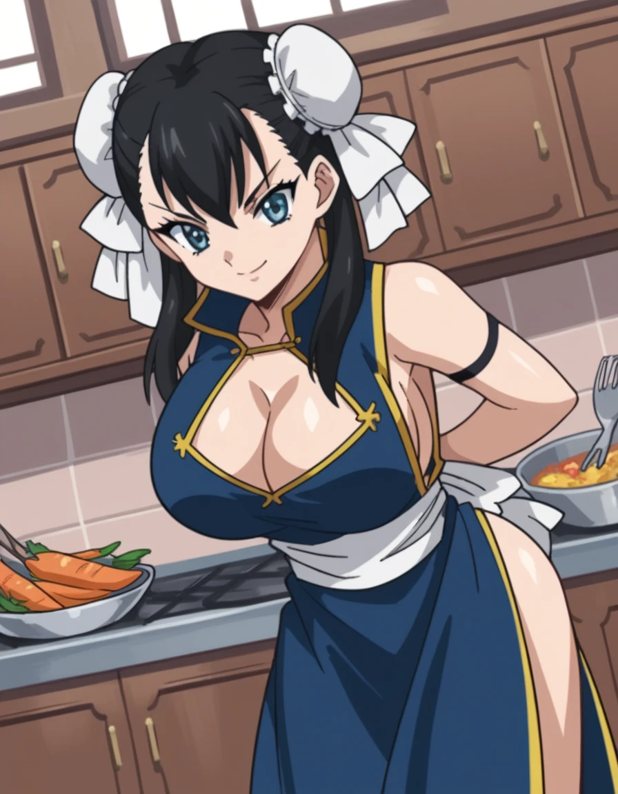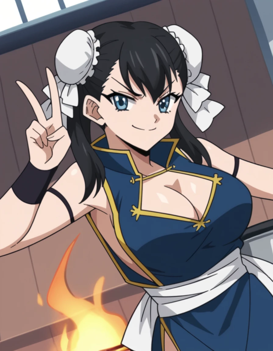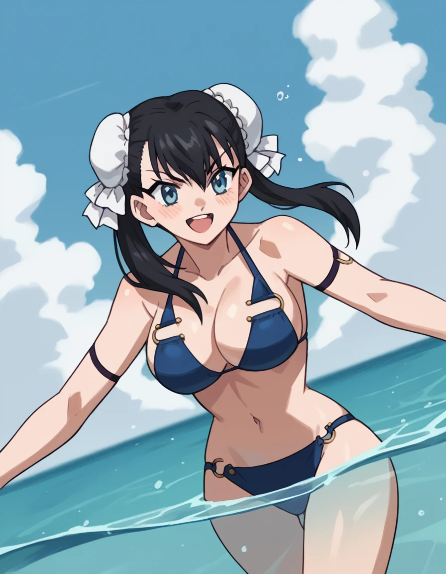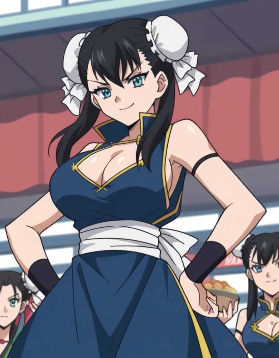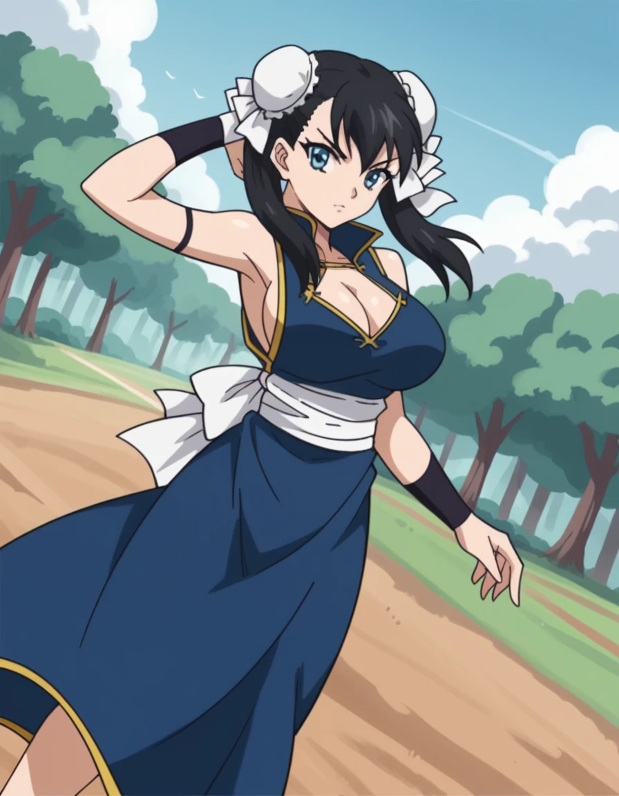 xuelan, blue eyes, black hair, hair bun, double bun, bun cover, large breasts