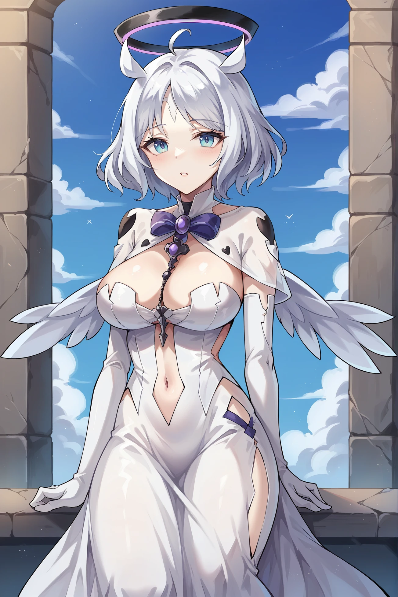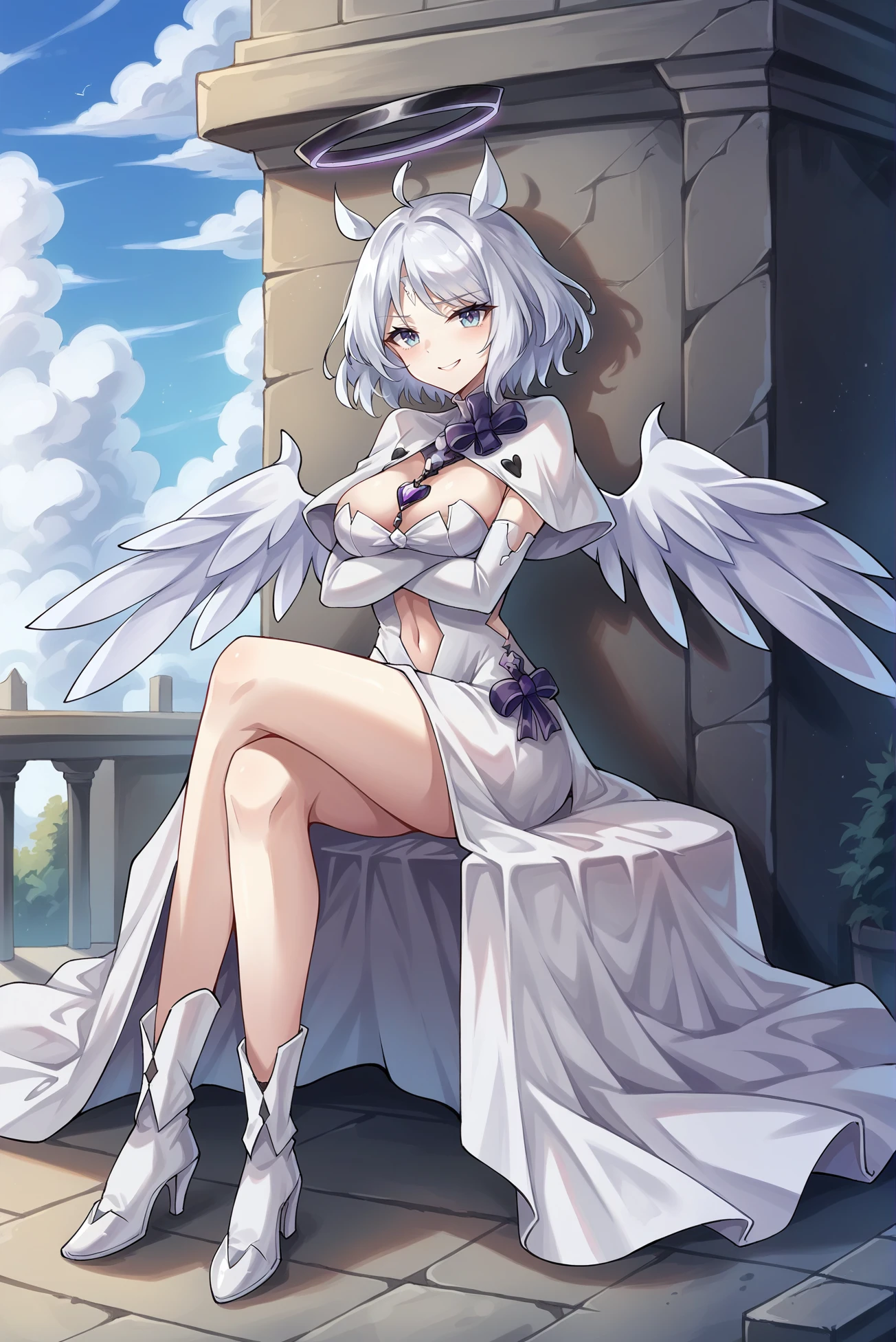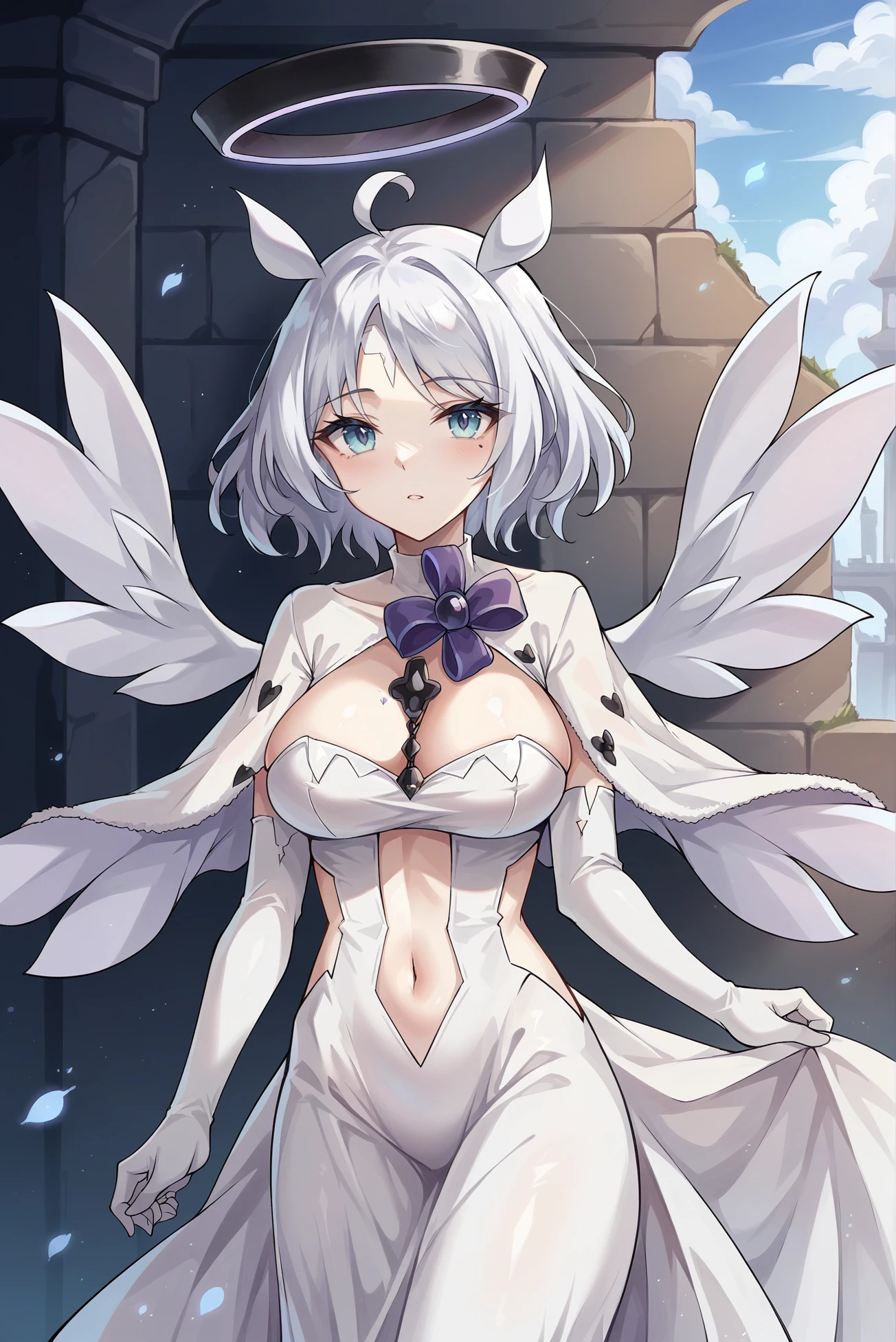 Character: white hair, short hair, forehead mark, wings, mechanical halo, animal ears