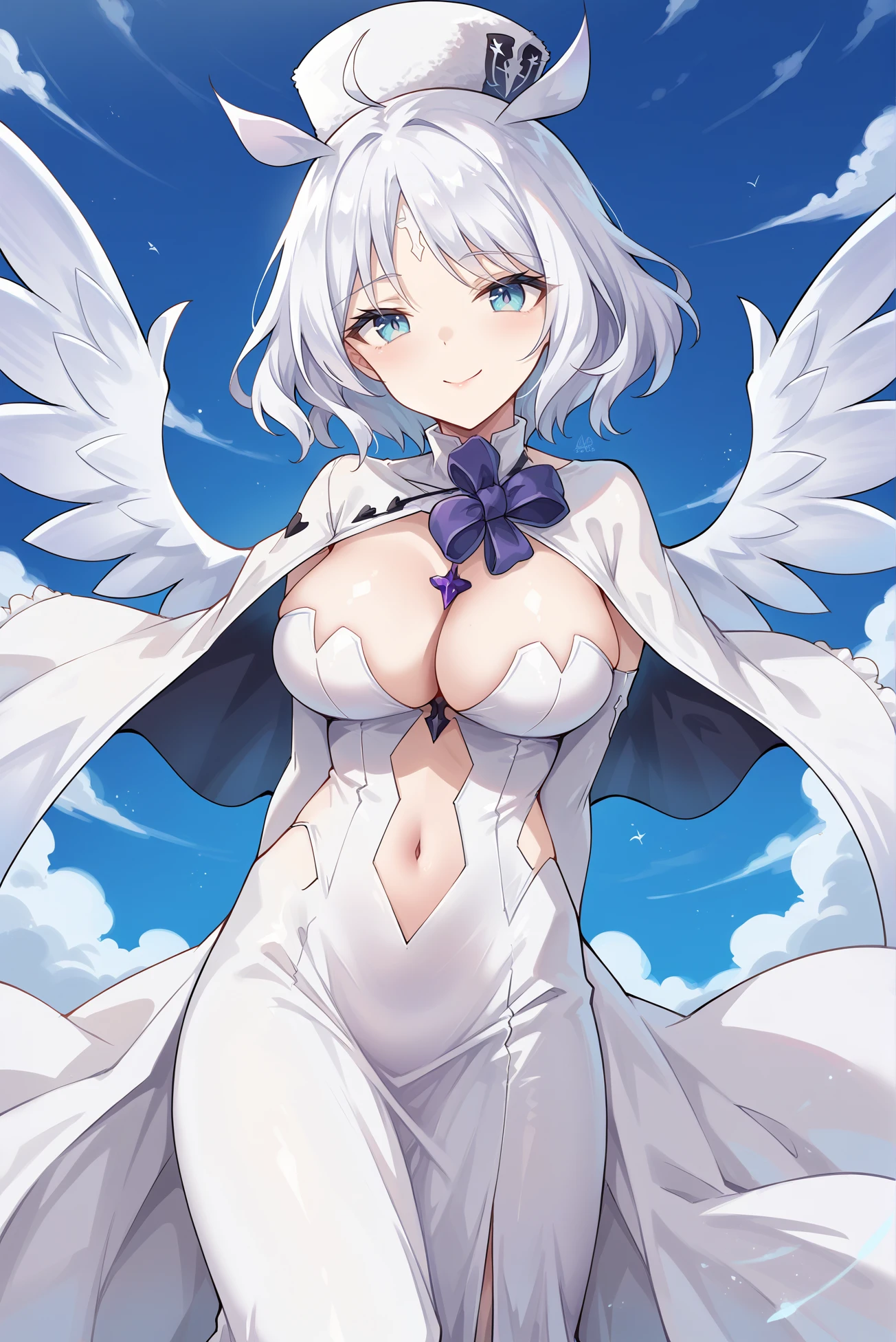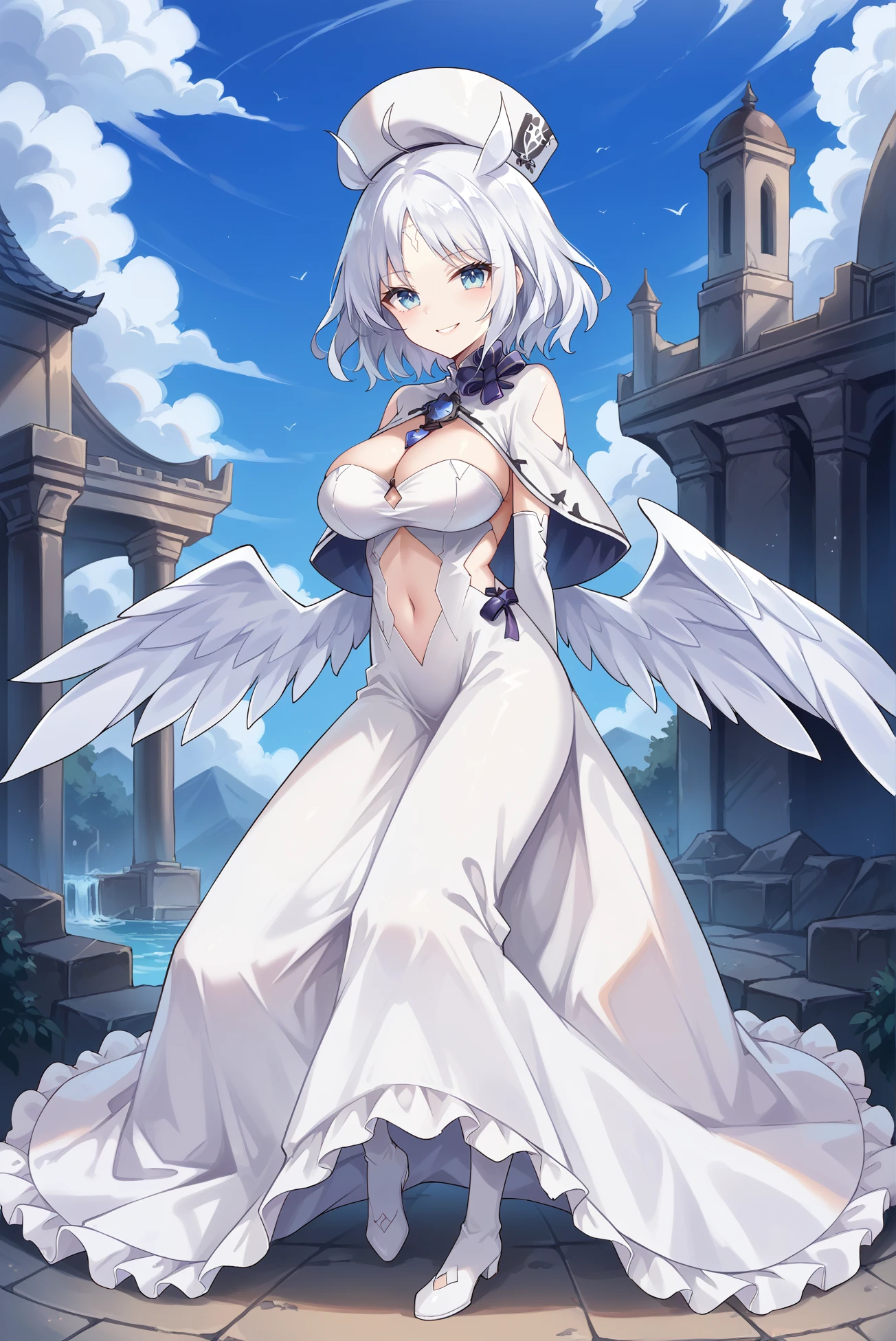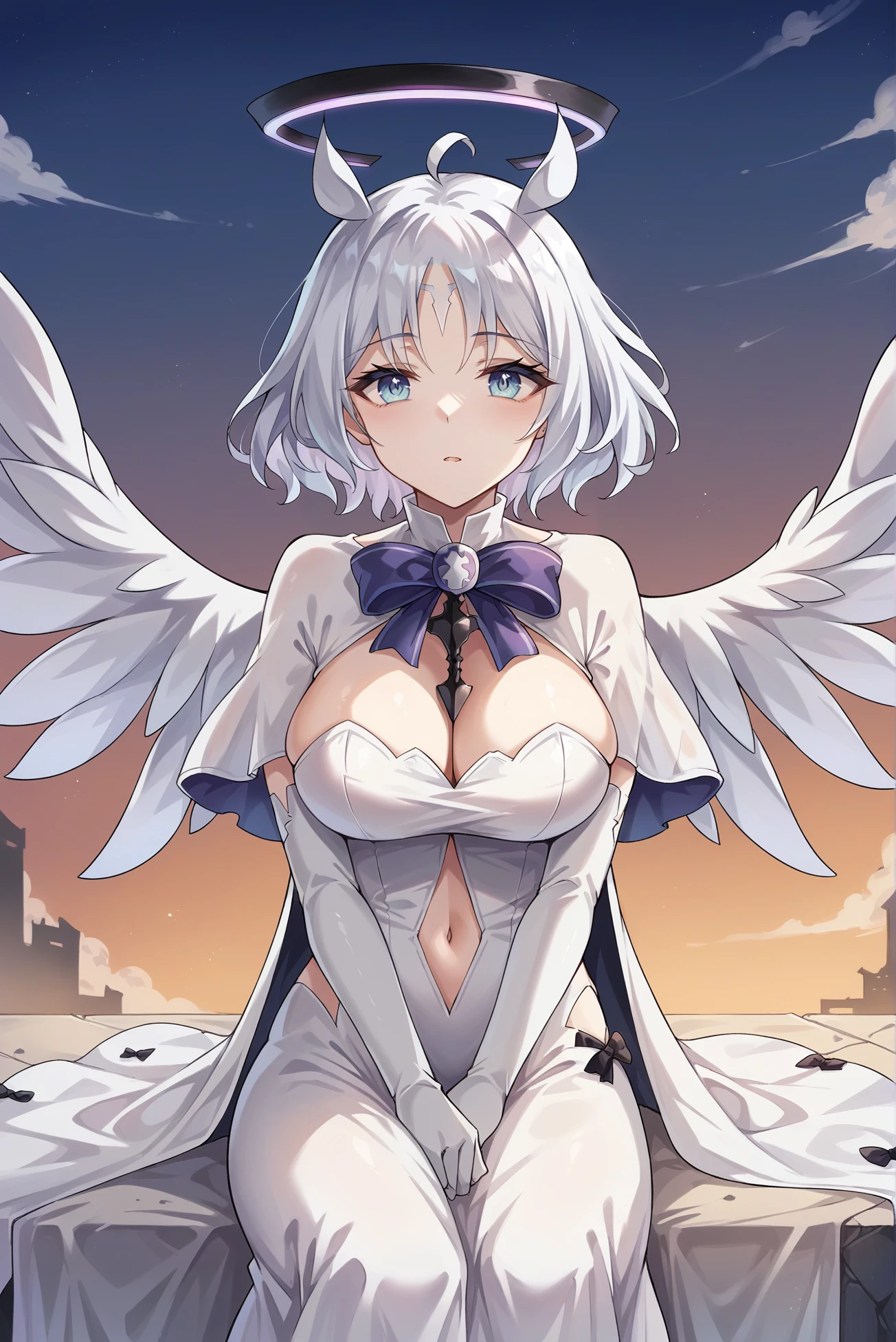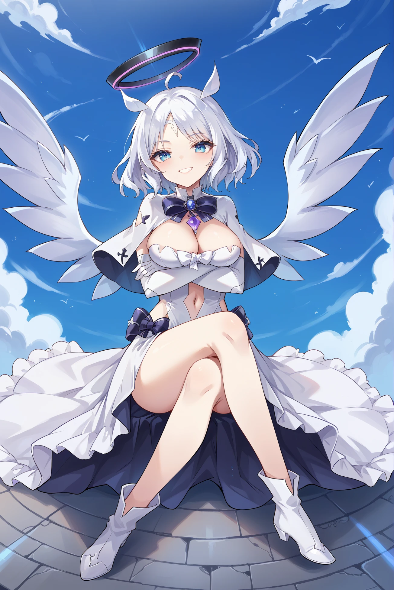 Character: white hair, short hair, forehead mark, wings, mechanical halo, animal ears
