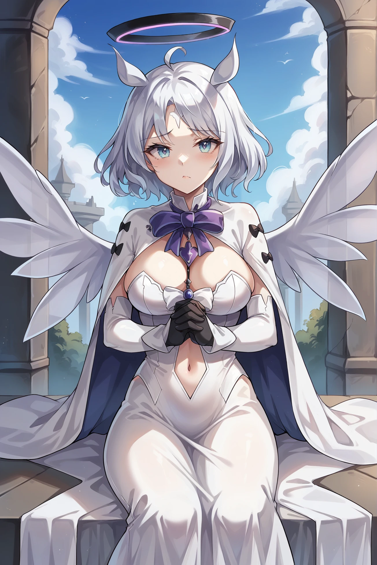 Outfit: white capelet, white dress, long dress, cleavage, clothing cutout, white elbow gloves, cleavage cutout