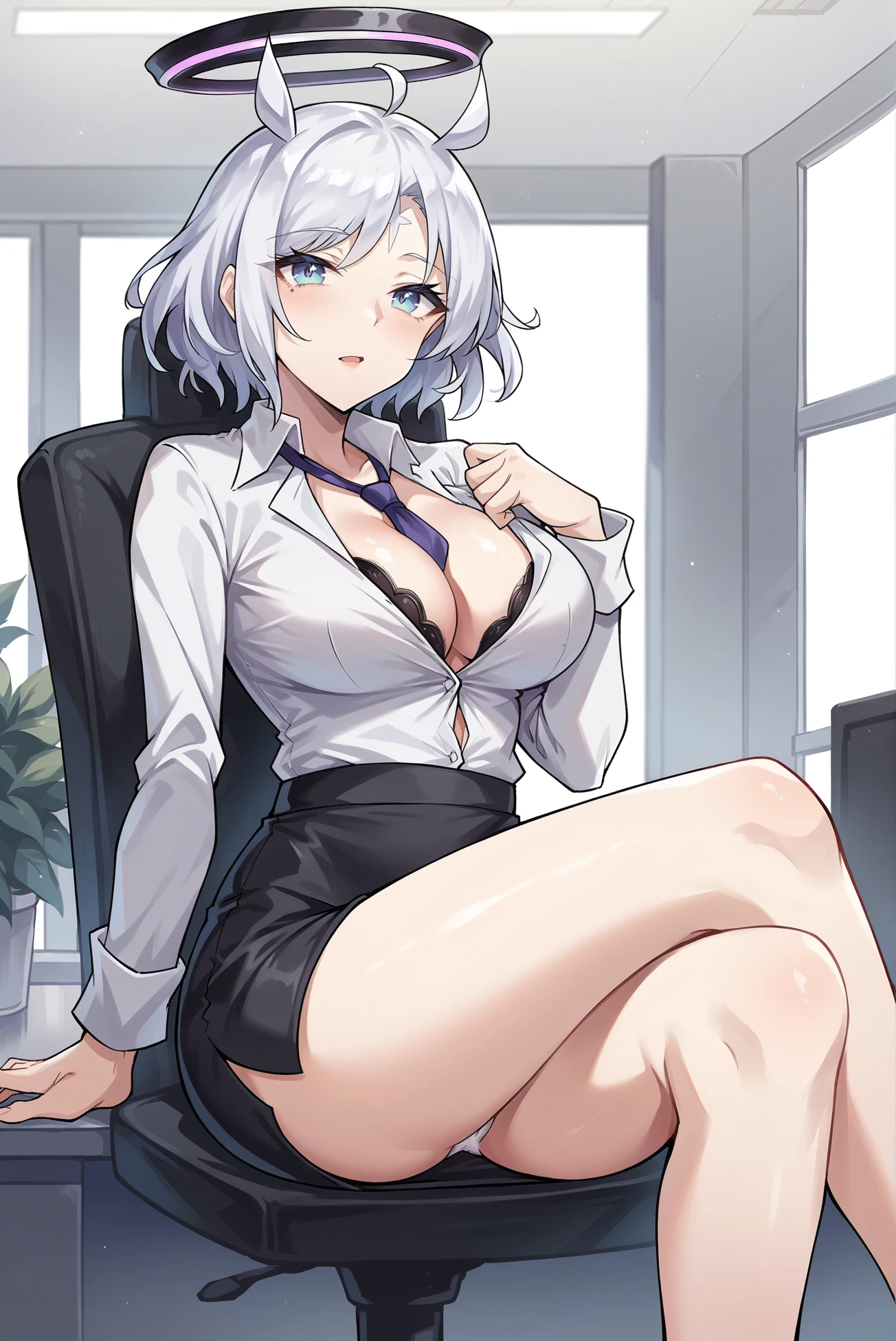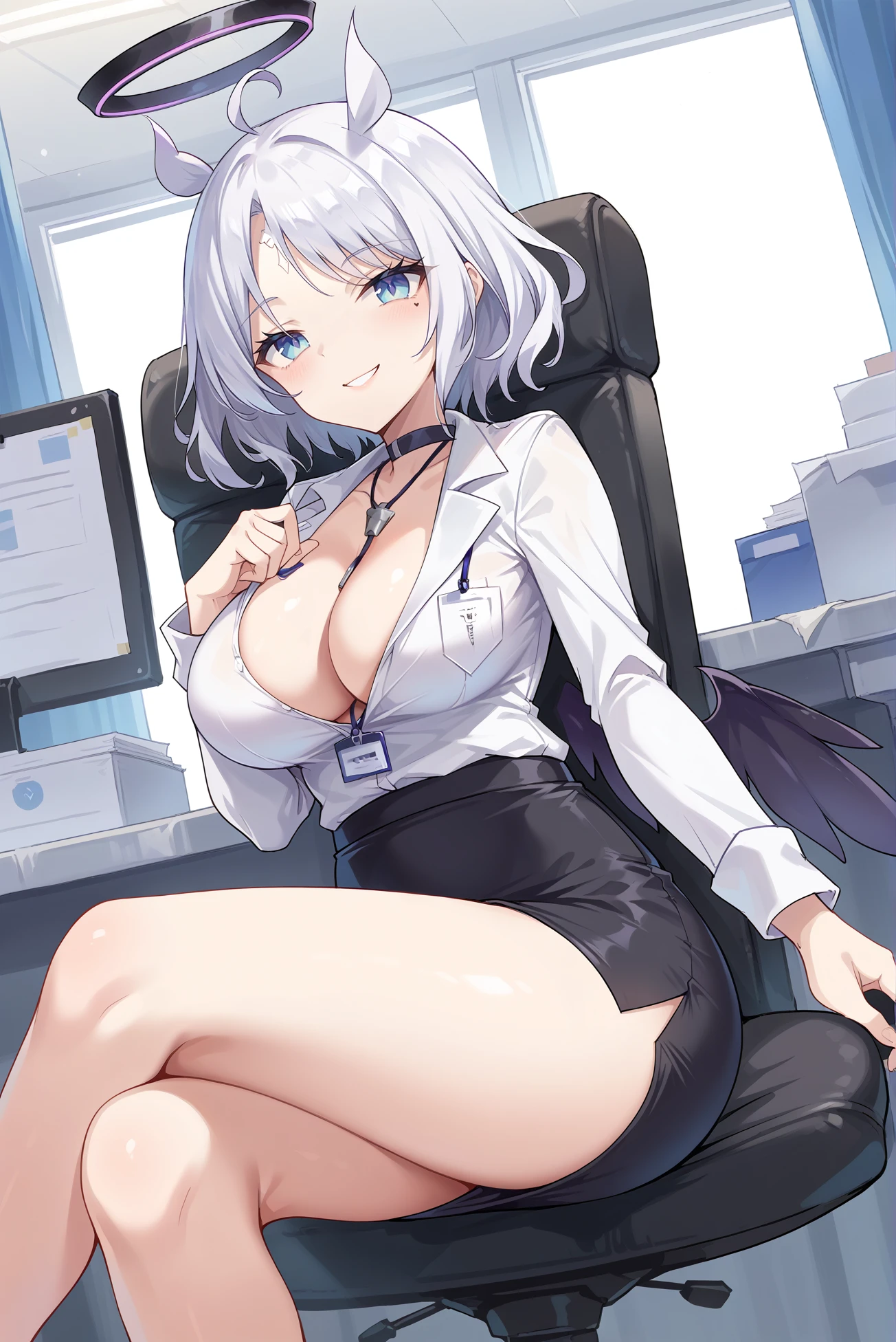 Character: grey hair, medium hair, forehead mark, ahoge, angel wings, animal ears