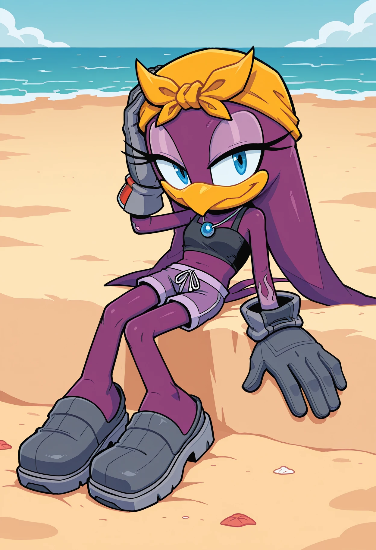 Beach signature clothing: orange bandana, pendant, purple shorts, black crop top, grey gloves, grey footwear