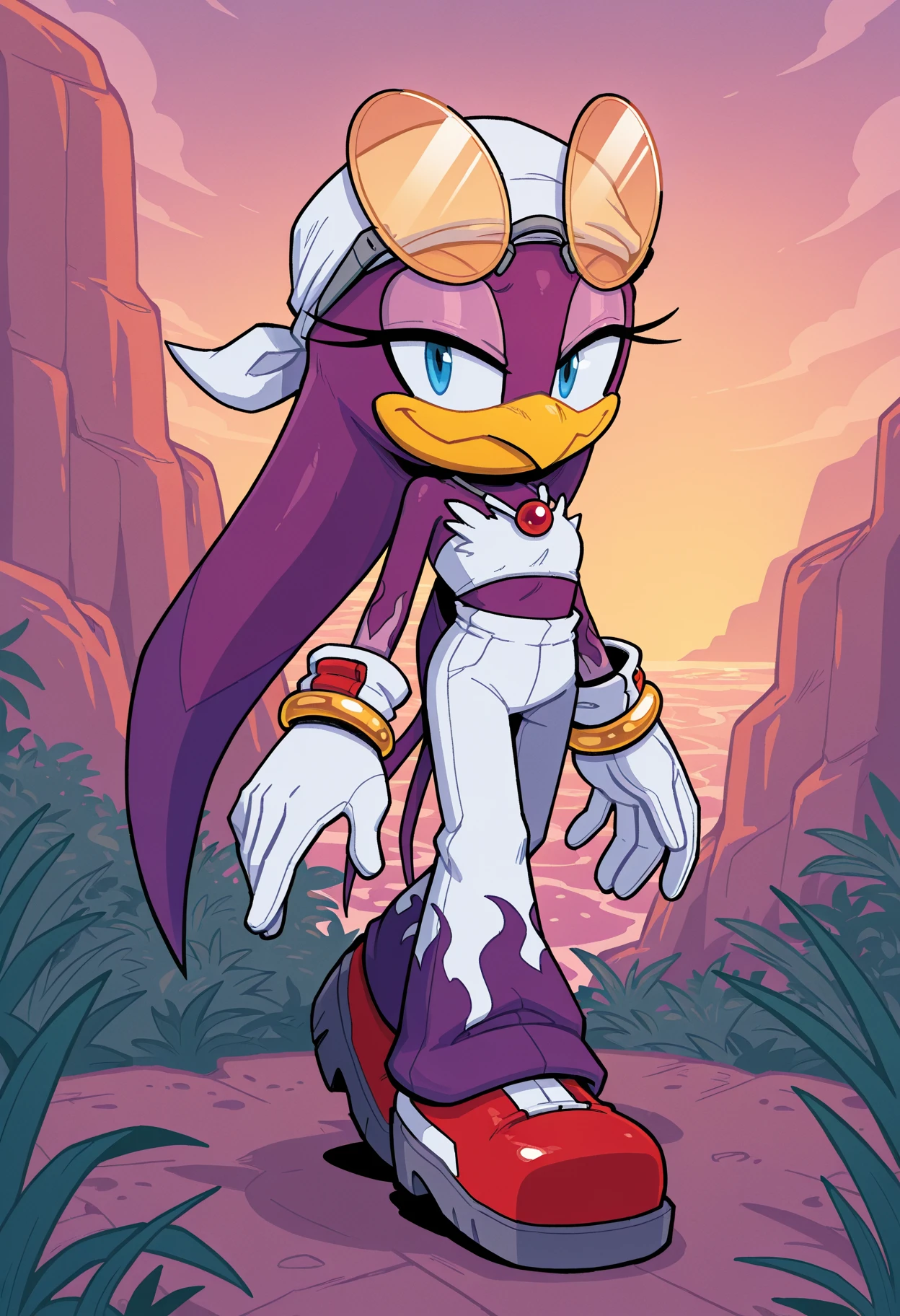 fur-trimmed shirt, white pants, bell-bottoms, white bandana, white gloves, red shoes, eyewear on head, red gemstone, necklace, gold bracelet
