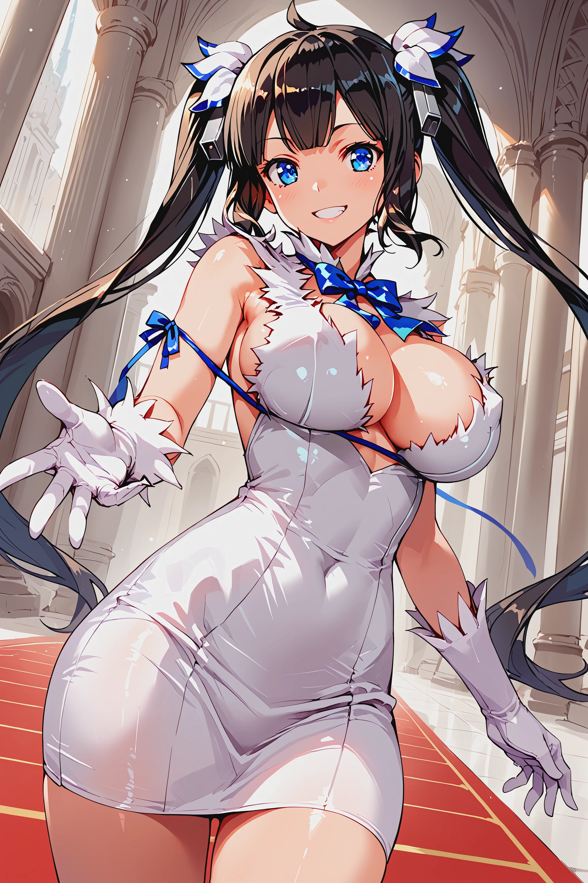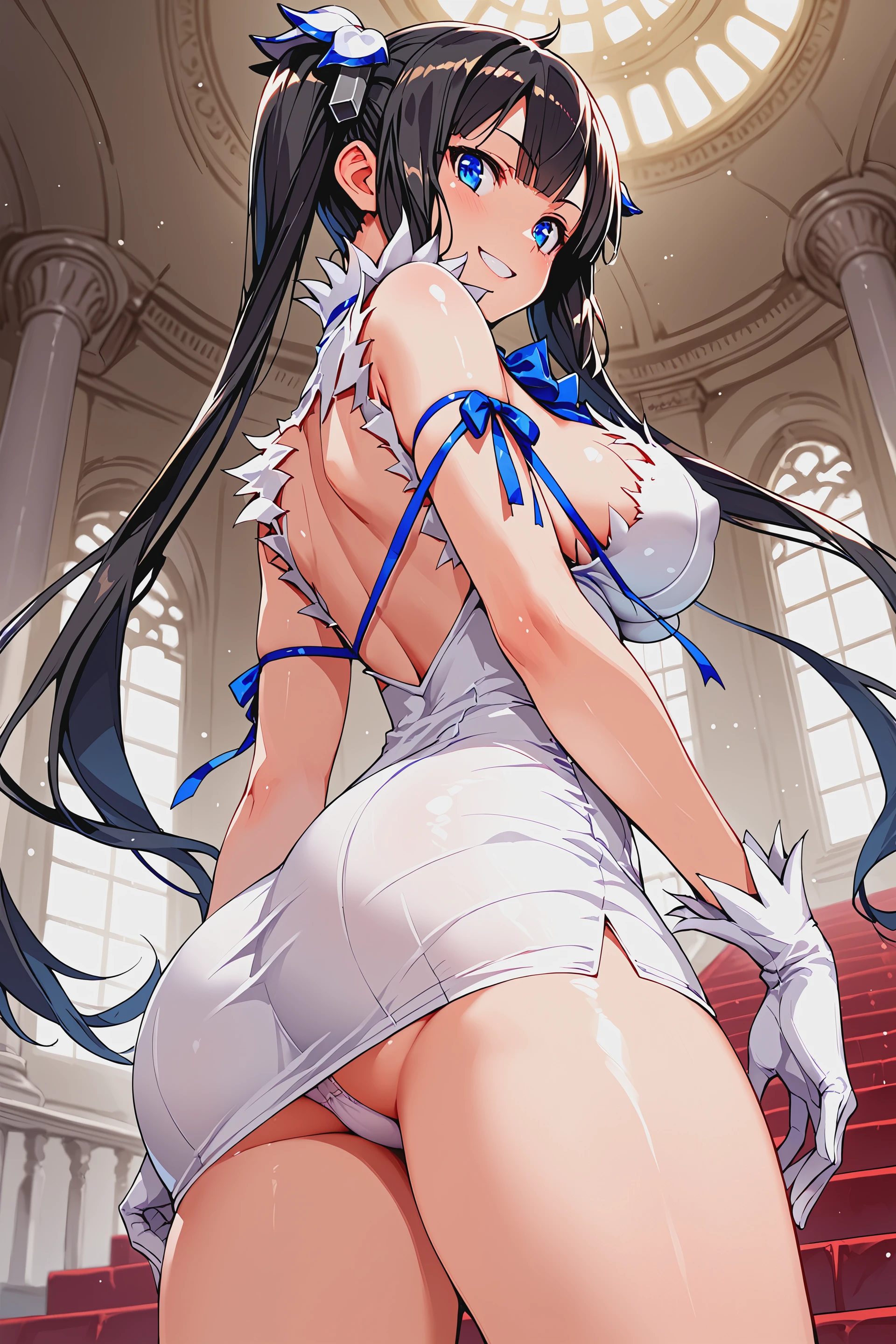 Trigger words: ceiiai hestia danmachi, long hair, twintails, black hair, blue eyes, rei no himo, hair ribbon, hair ornament,blue bowtie, white dress, cleavage, sleeveless, white gloves, blue ribbon, arm ribbon, barefoot