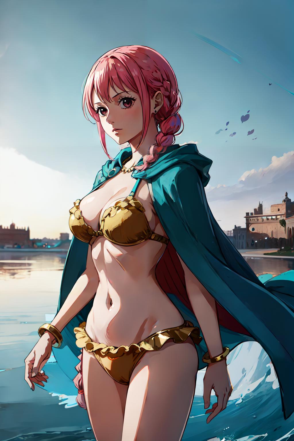 📌Prompt:Rebecca_onepiece, braid pink hair, twin braids, blue cape, sword, weapon, bikini armor, cloak, brown gloves