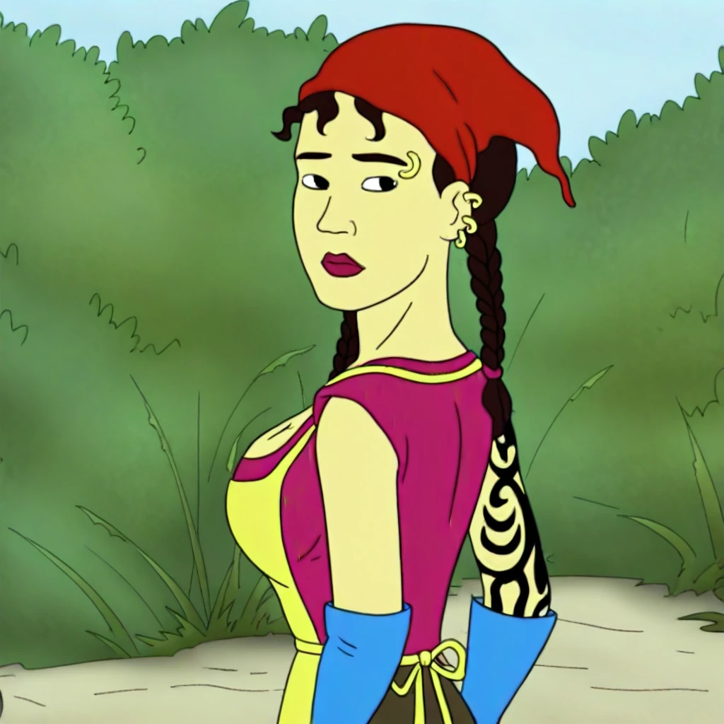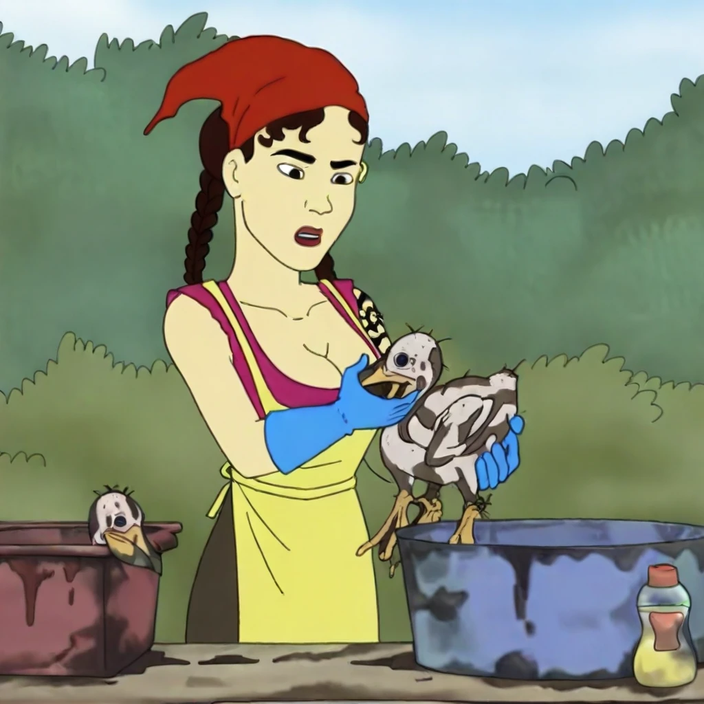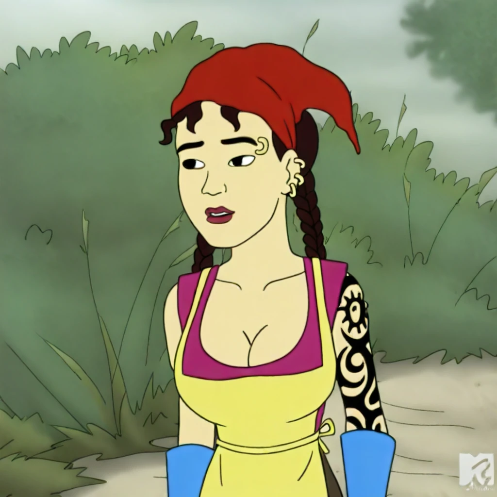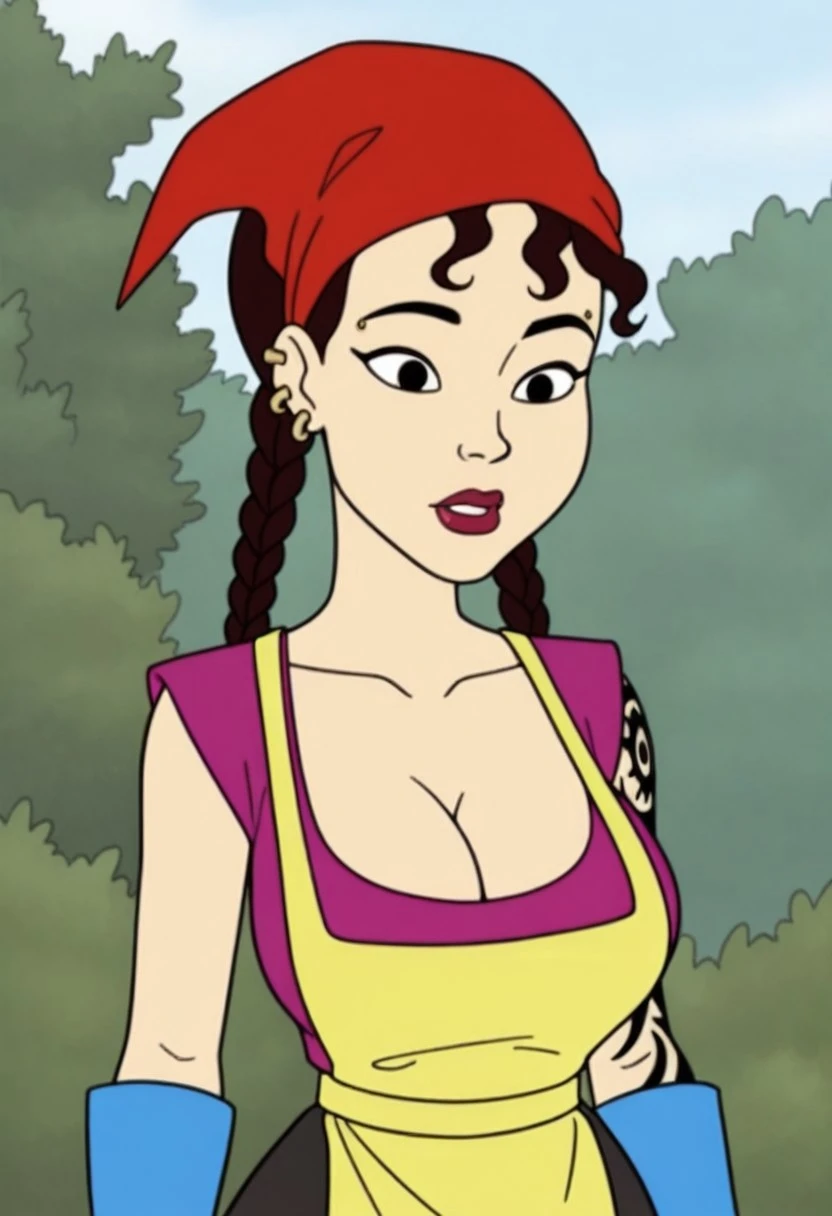 Maya, Maya Kanigher, 1girl, solo, bandana, red bandana, braid, twin braids, apron, yellow apron, low cut shirt, purple shirt, gloves, blue gloves, elbow gloves, tattoo, earrings, piercing, jewelry, cleavage, breasts, holding bird, dirty bird, water tub, bottles