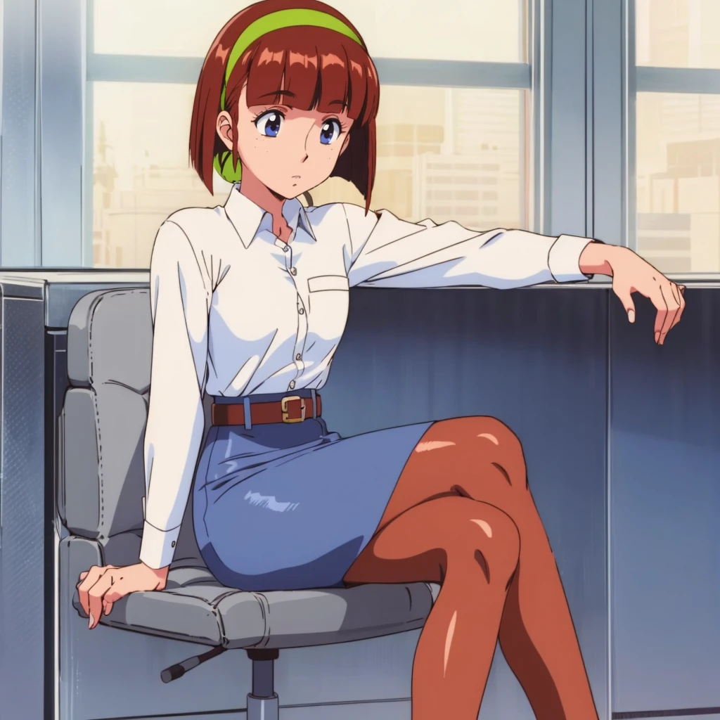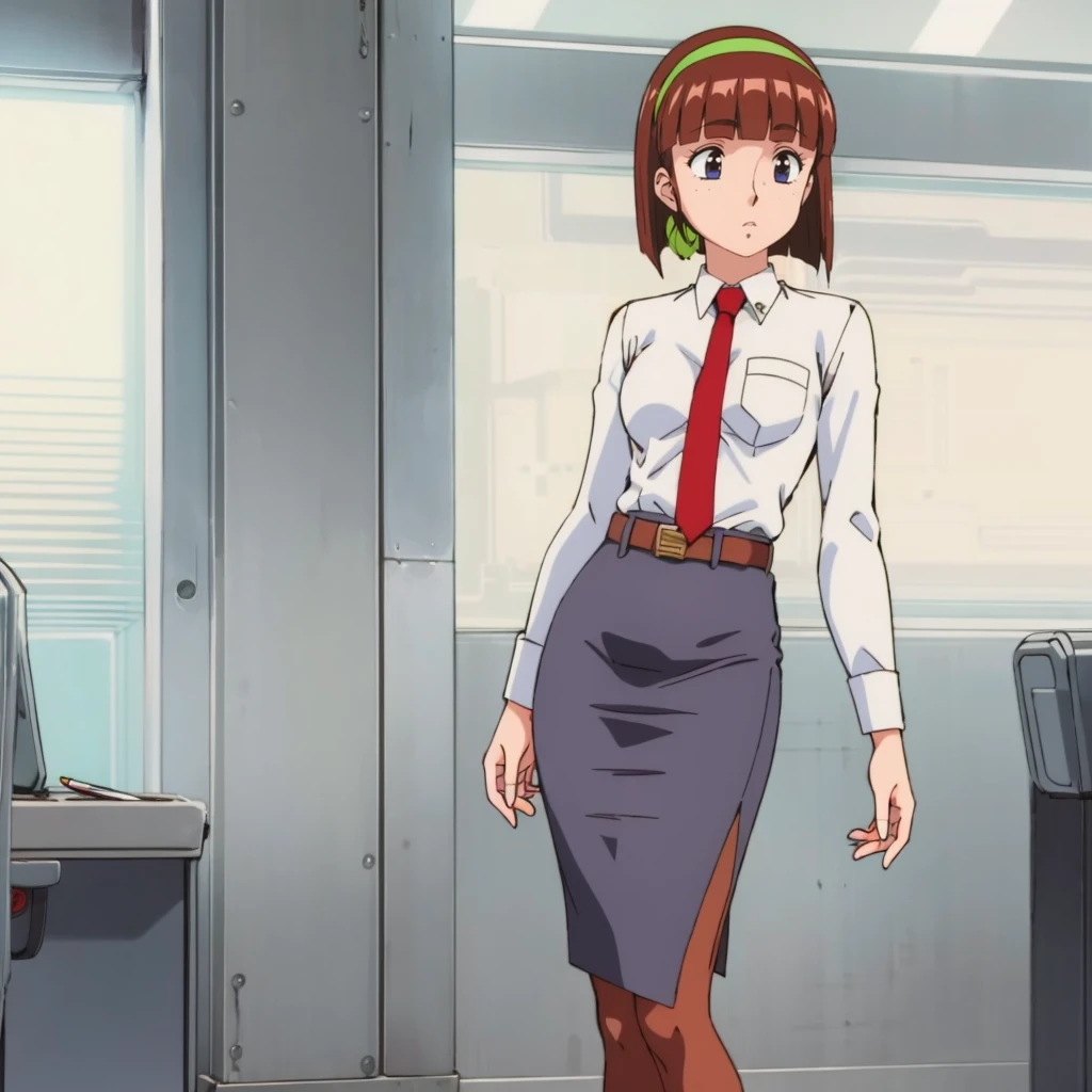 green hairband, white collared shirt,red tie, belt,pencil skirt, pantyhose,