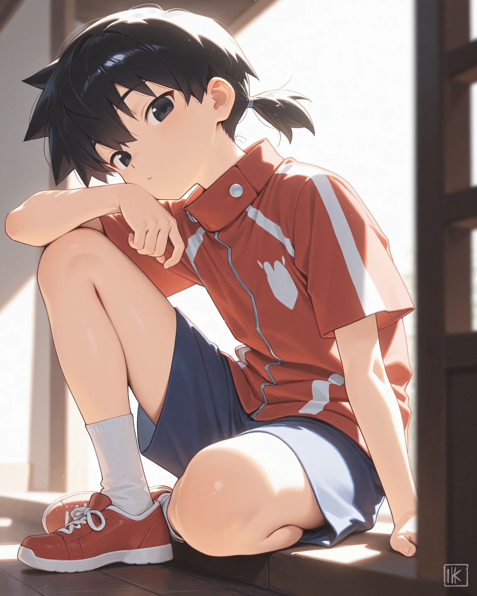 Default outfit: red jacket, short sleeves, white wristwatch, blue shorts, white socks, red shoes