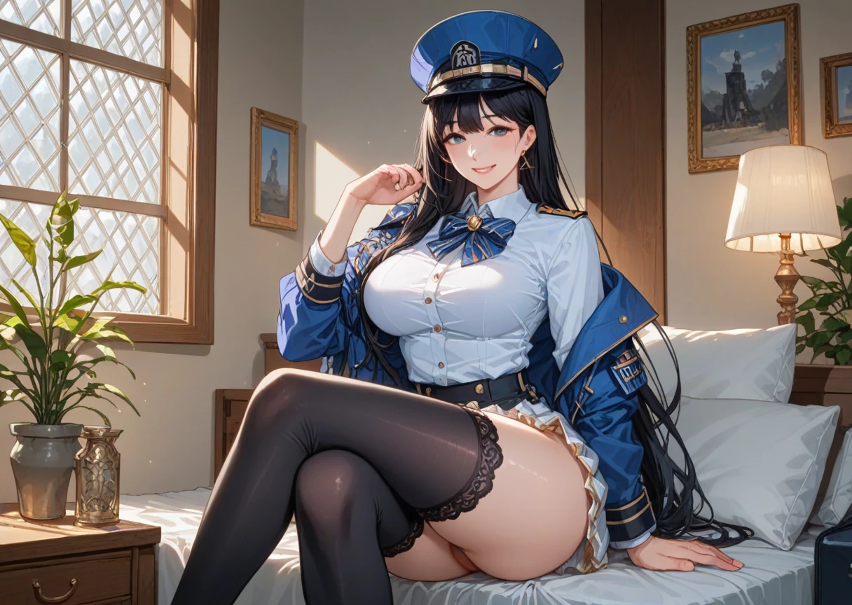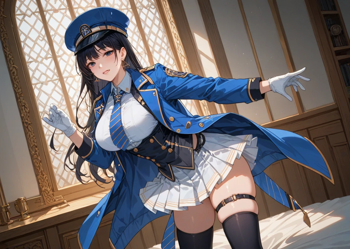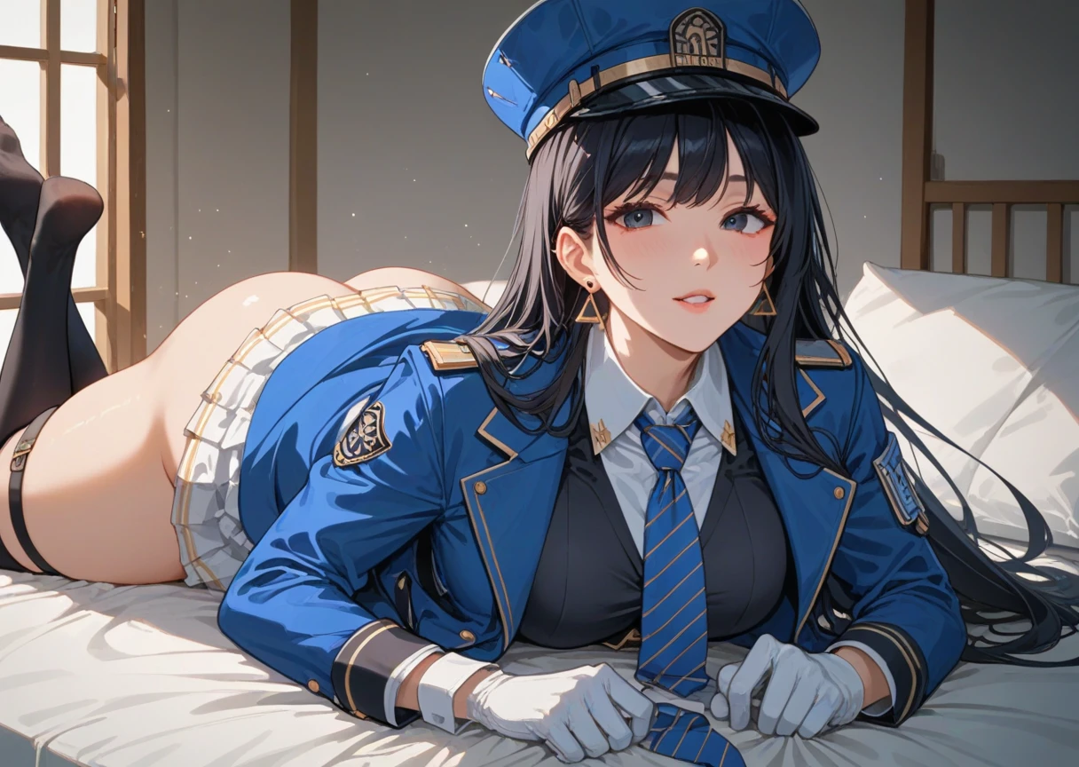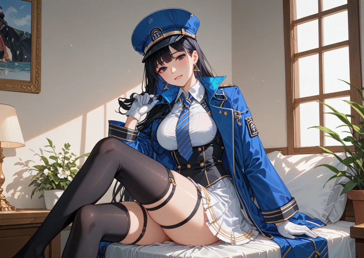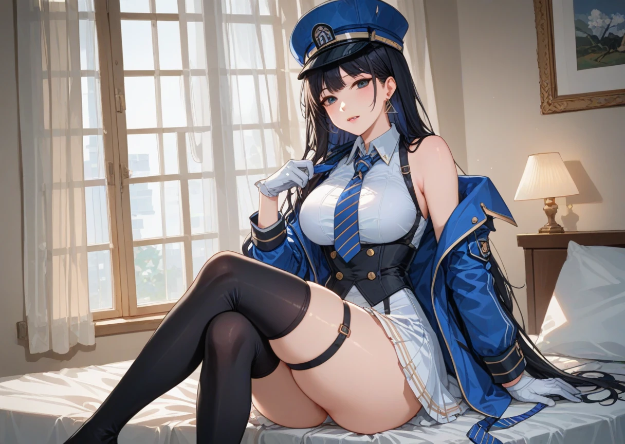 "black hair, hat, necktie, thighhighs, blue necktie, gloves, white gloves, long hair, skirt, black thighhighs, jacket, jacket on shoulder, white skirt, vest, black eyes, uniform, bangs, triangle earrings, collared shirt, blue jacket, parted lips, thigh strap, striped necktie, blue headwear"