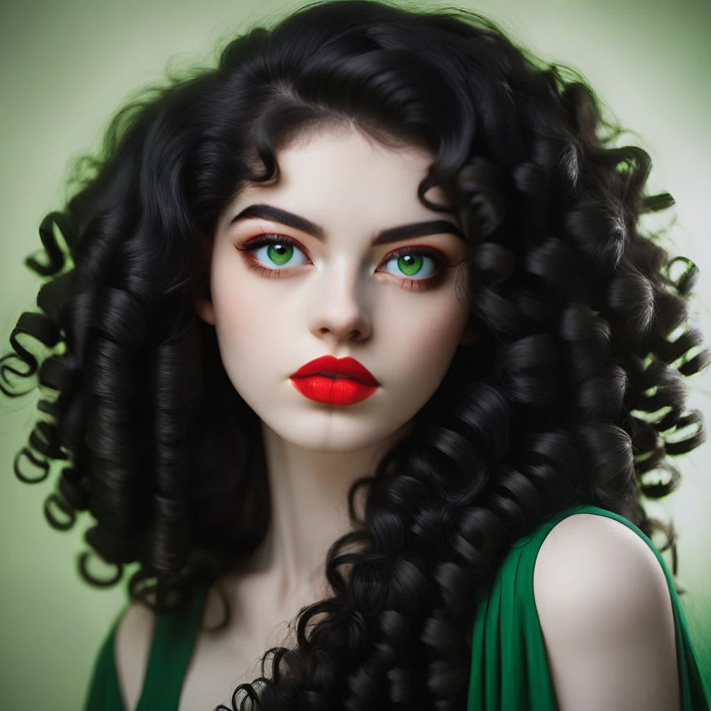 ,black hair, curly hair, pale skin, green eyes, red lips,