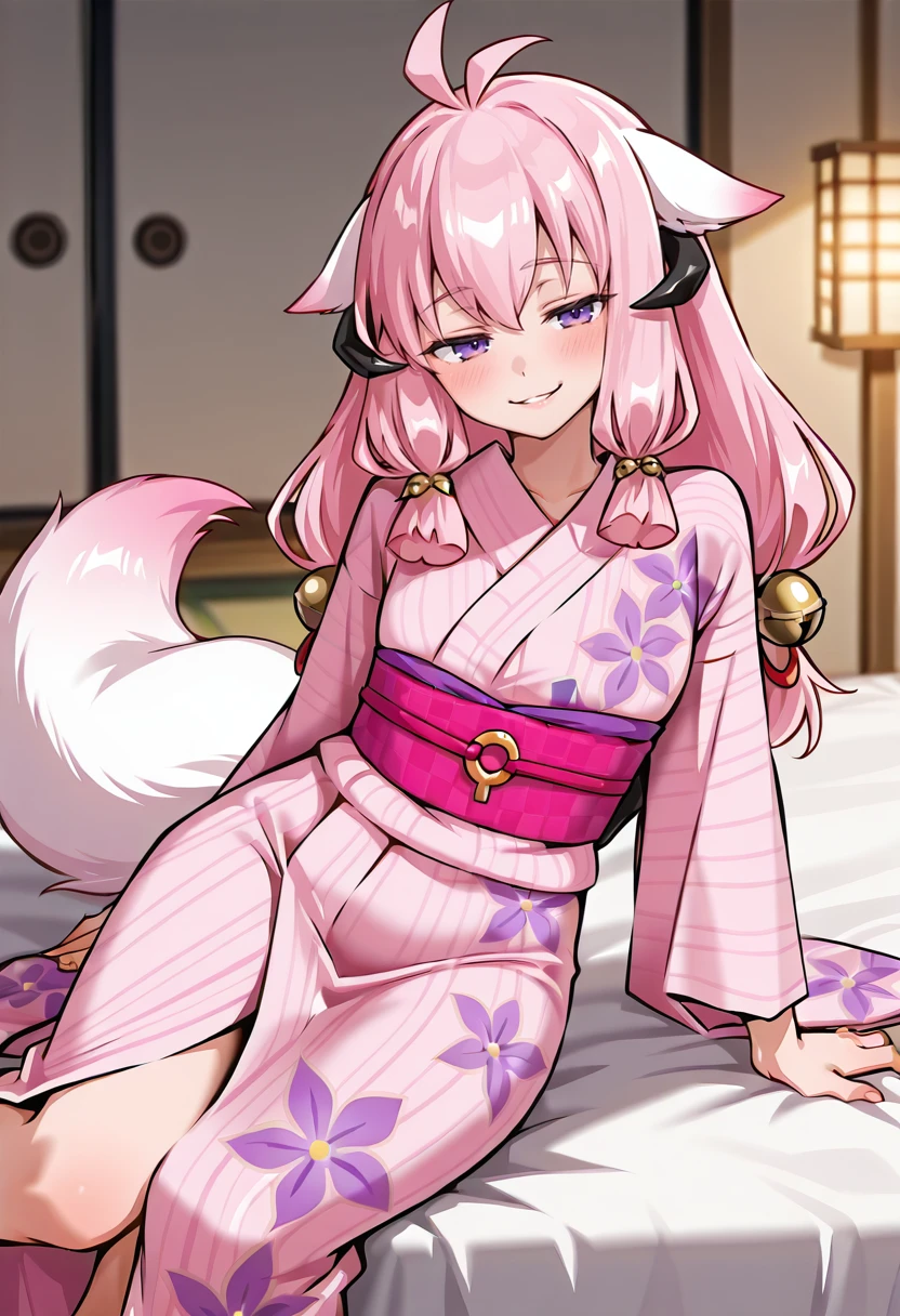 Hina_GoA, aut_fes_ykt, antenna hair, pink hair, twintails, long hair, animal ears, horns, purple eyes, fox tail, white tail, jingle bell, hair bell, pink yukata, purple floral print, pink obi, obidome, zouri