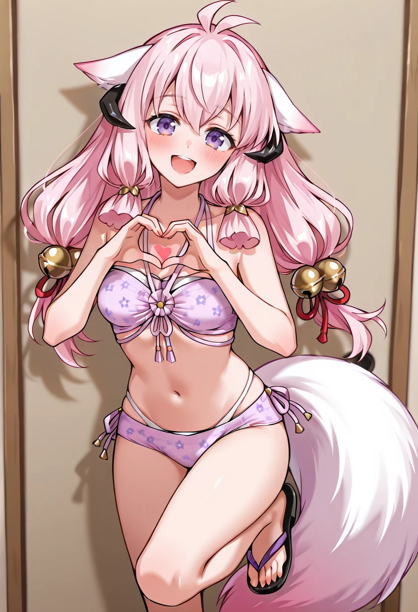 Hina_GoA, base_swim, antenna hair, pink hair, twintails, long hair, animal ears, horns, purple eyes, fox tail, white tail, jingle bell, hair bell, halterneck, pastel purple bikini, floral print bikini, layered bikini, black sandalsDescription