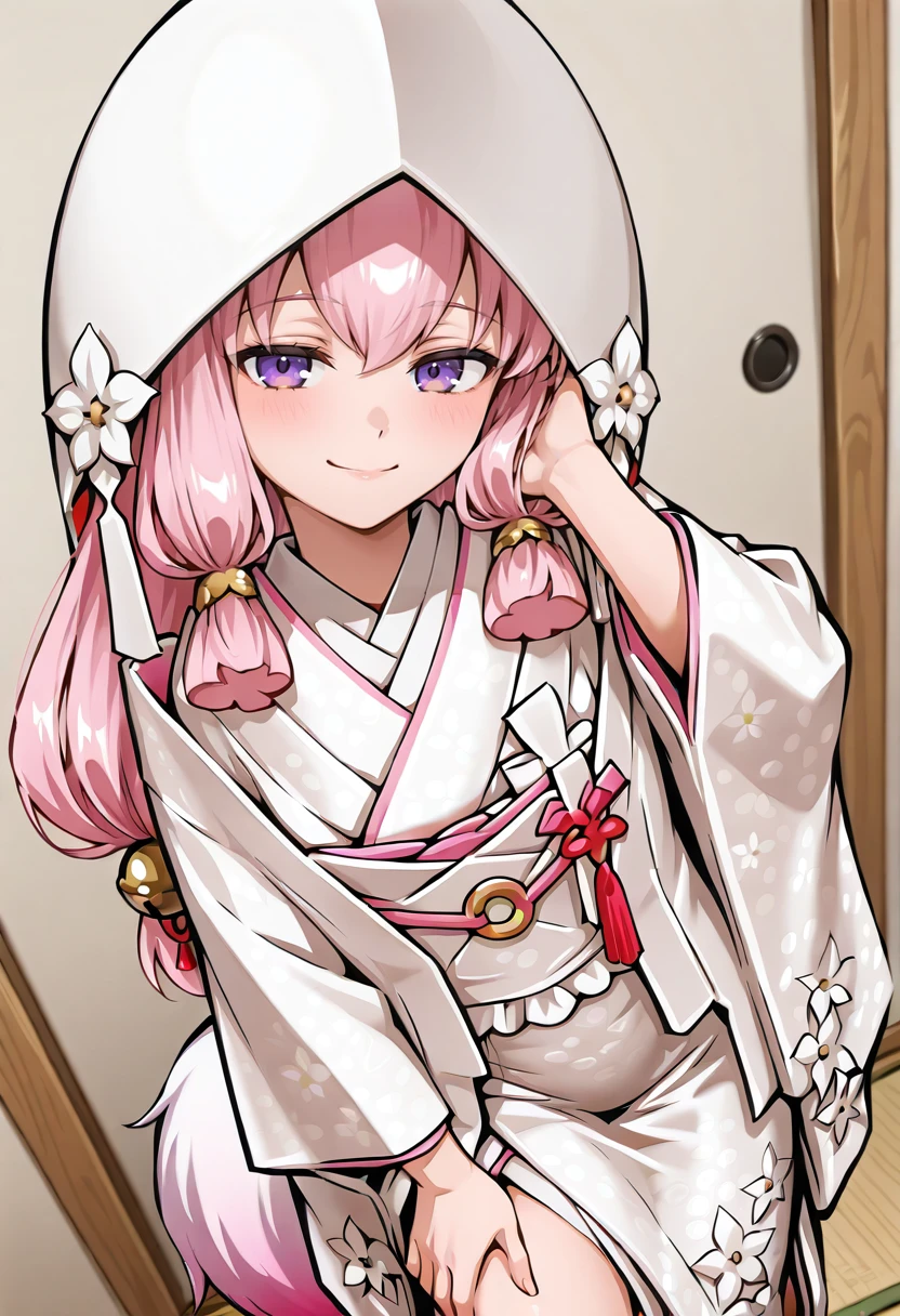 Hina_GoA, goa_uchkk, pink hair, twintails, long hair, purple eyes, fox tail, white tail, jingle bell, hair bell, neck bell, wataboushi, uchikake, obidome, white kimono, pink trim, dress flowers, jasmine (flower)