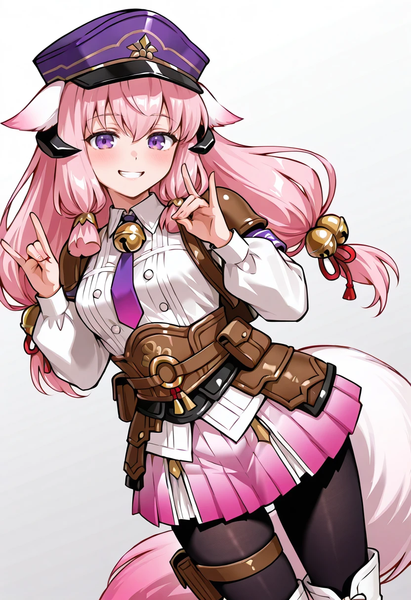 Hina_GoA, SEED_ranger, pink hair, twintails, long hair, animal ears, horns, purple eyes, fox tail, white tail, jingle bell, hair bell, neck bell, peaked hat, purple hat, shoulder armor, white shirt, long sleeves, puffy sleeves, purple armband, backpack, brown belt, belt pouch, kusazuri, pink skirt, black pantyhose, thigh pouch, white boots, jasmine_(flower)