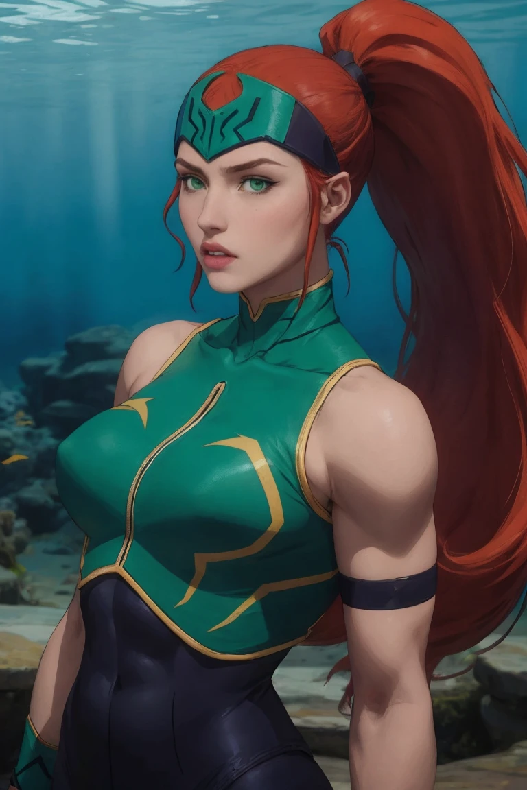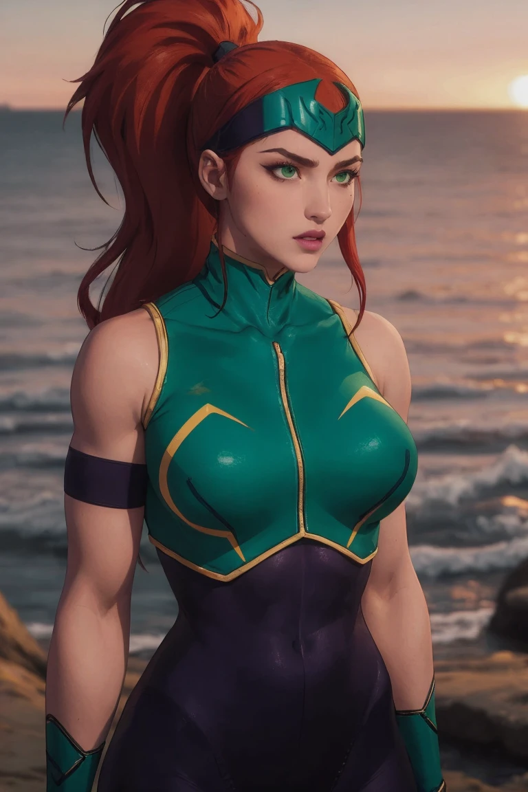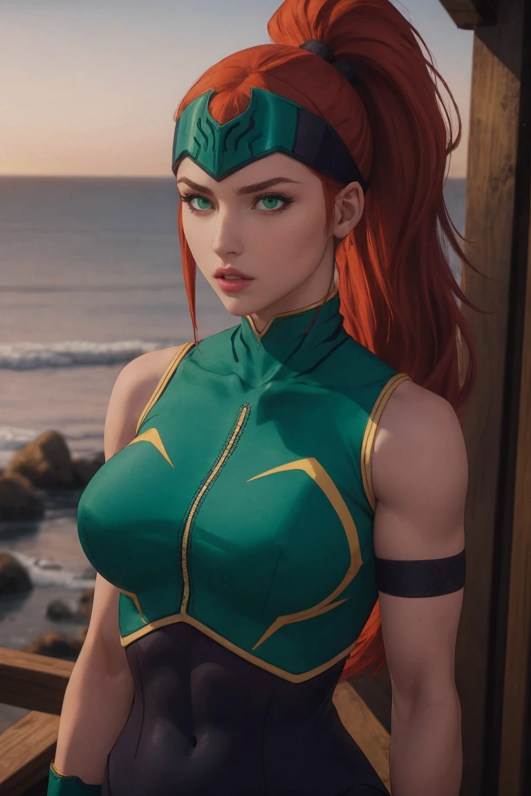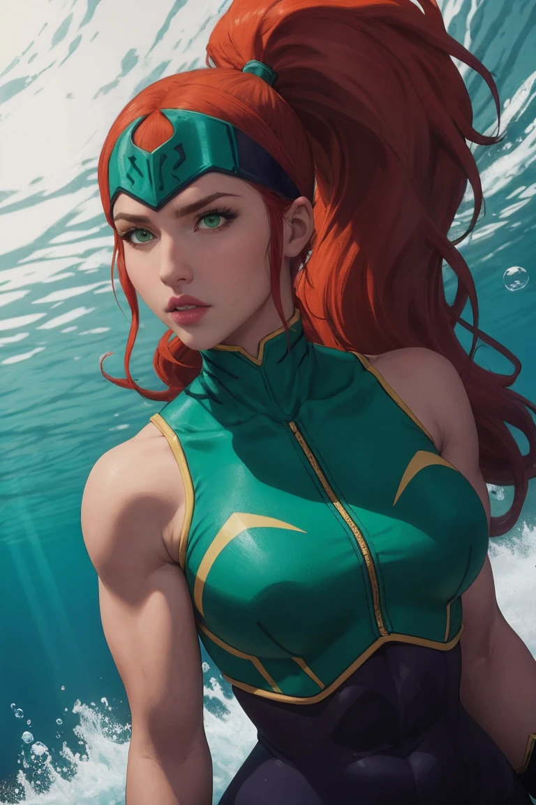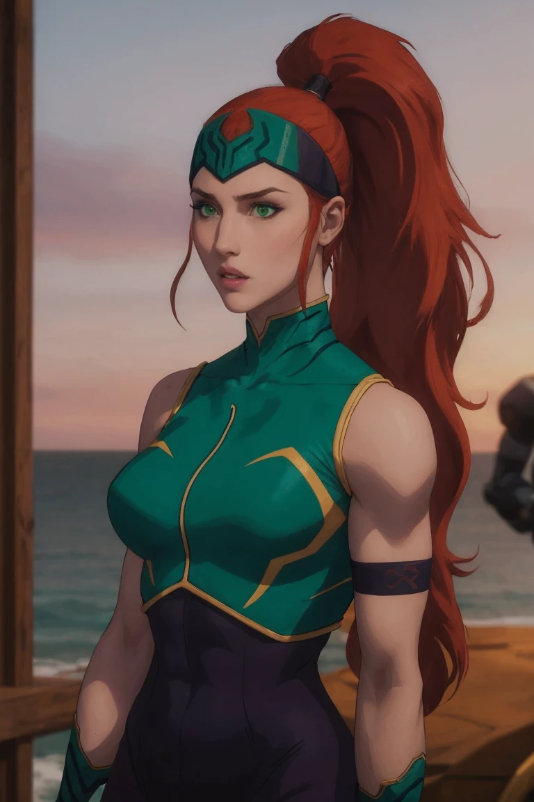 1girl, long hair, red hair, big hair, ponytail, green eyes, very long hair, makeup, headband, forehead protector, lipstick, muscular, lips, helmet, muscular female, large breasts, high ponytail, collarbone, hair pulled back, thighs, eyelashes, eyeshadow,