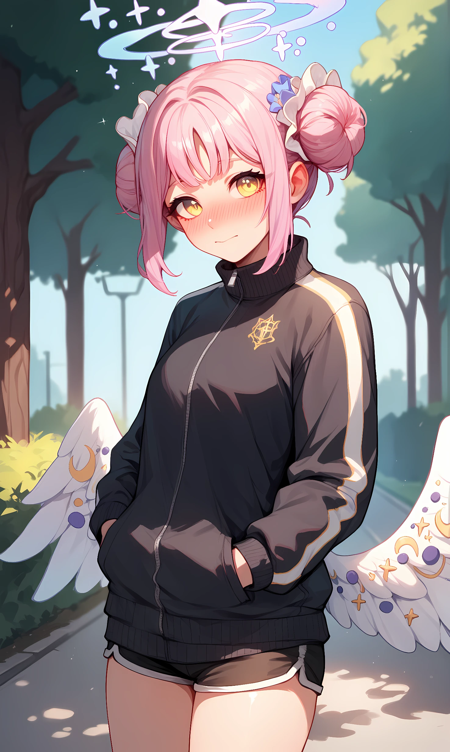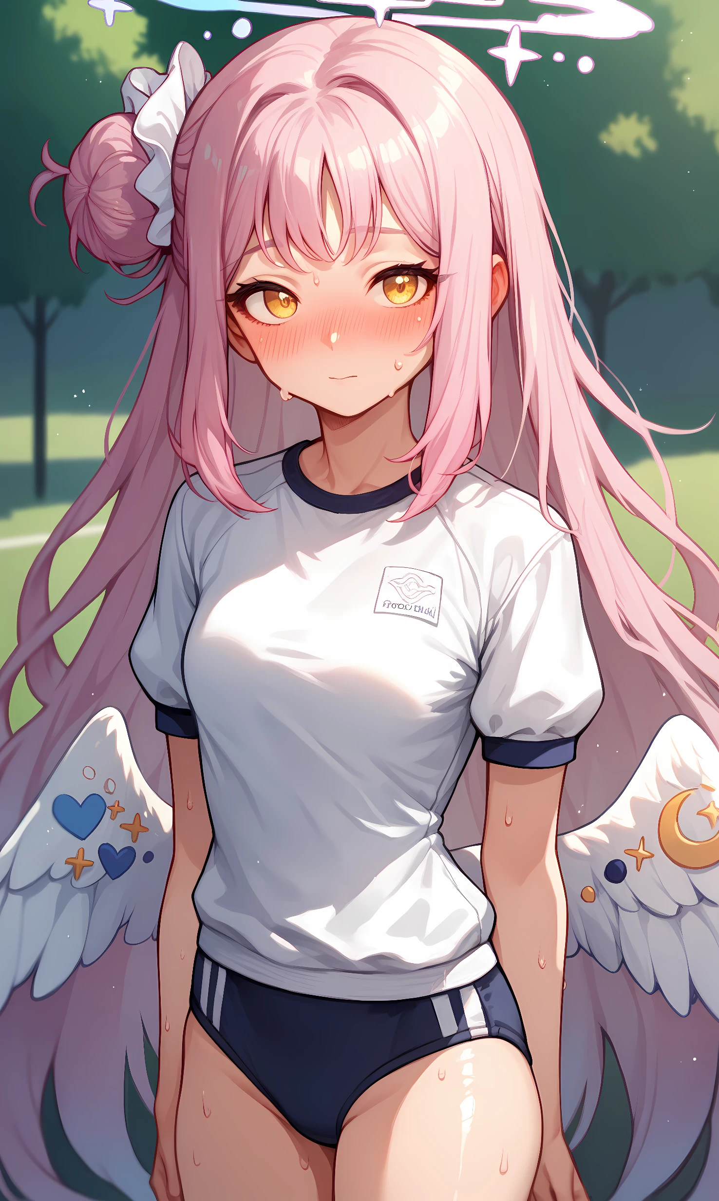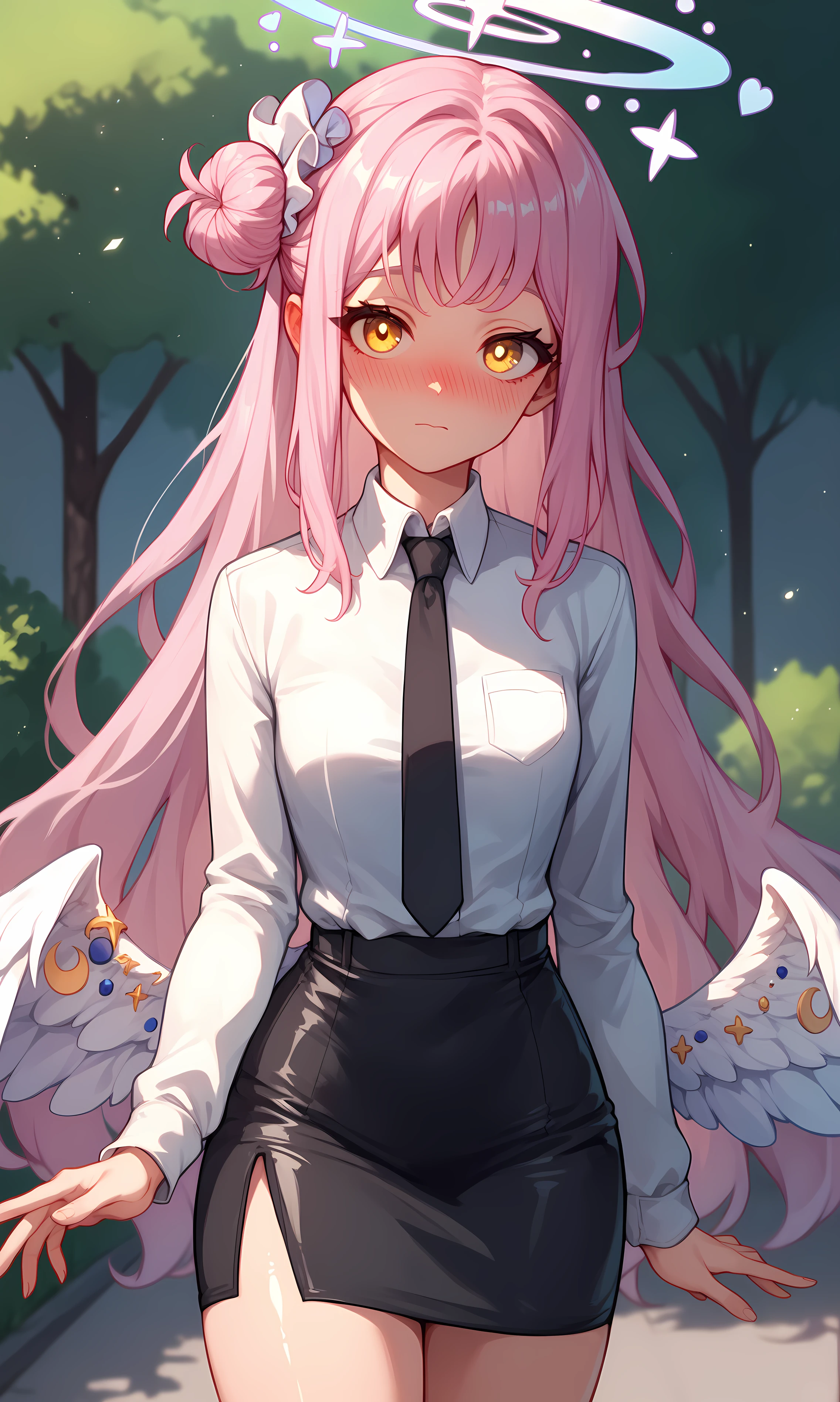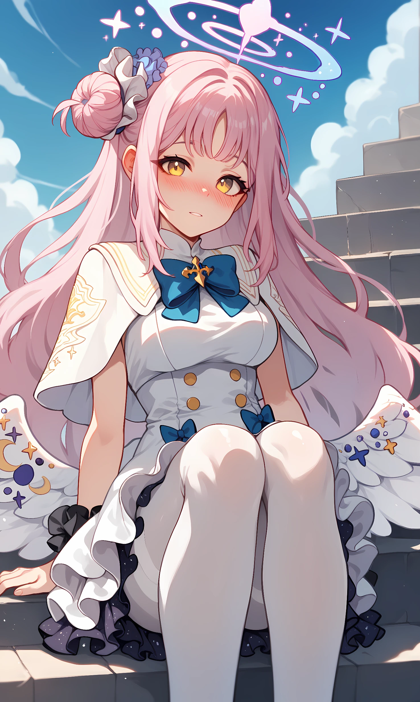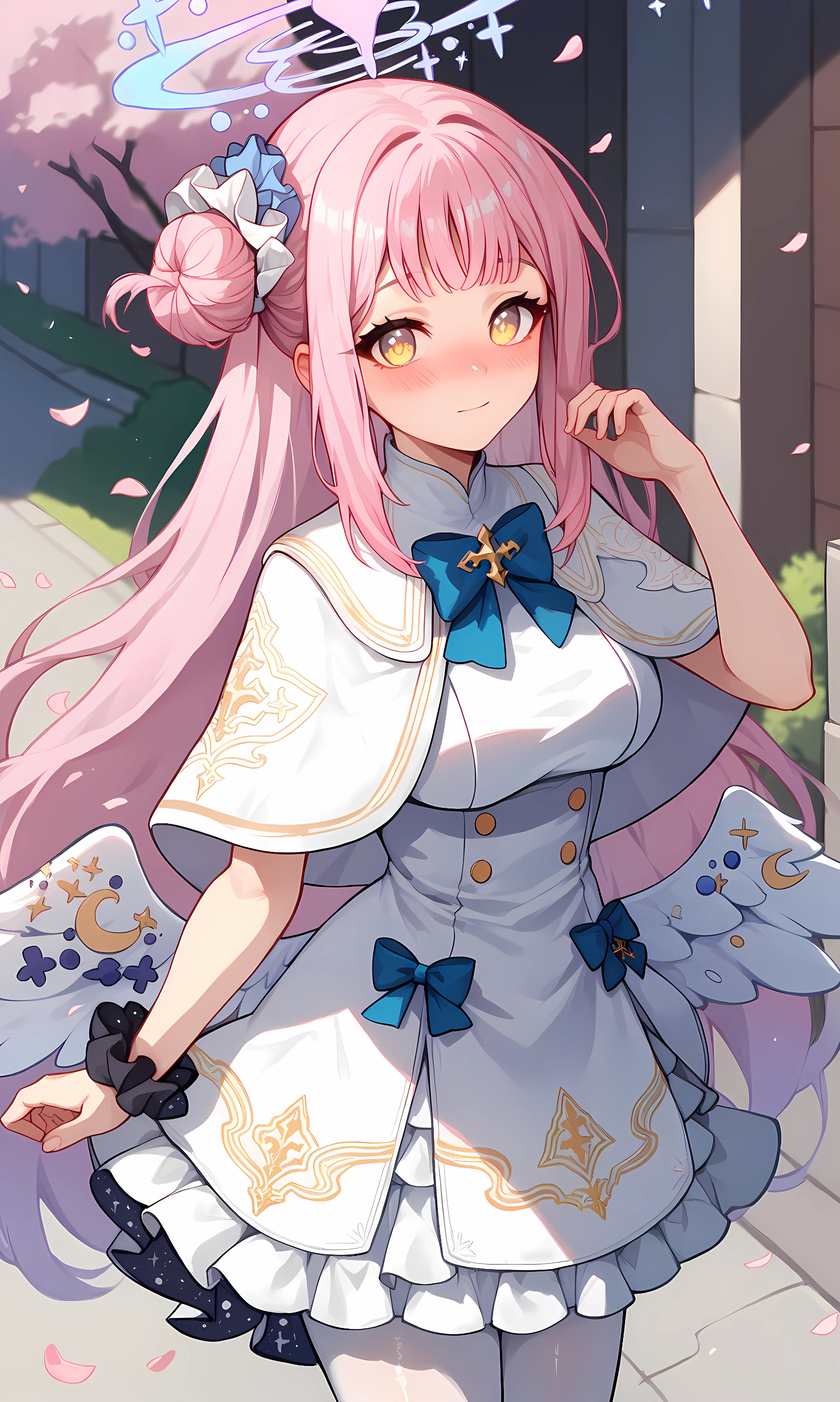 mika, yellow eyes, pink hair, gradient hair, very long hair, side bun, hair ornament, halo, angel wings, low wings