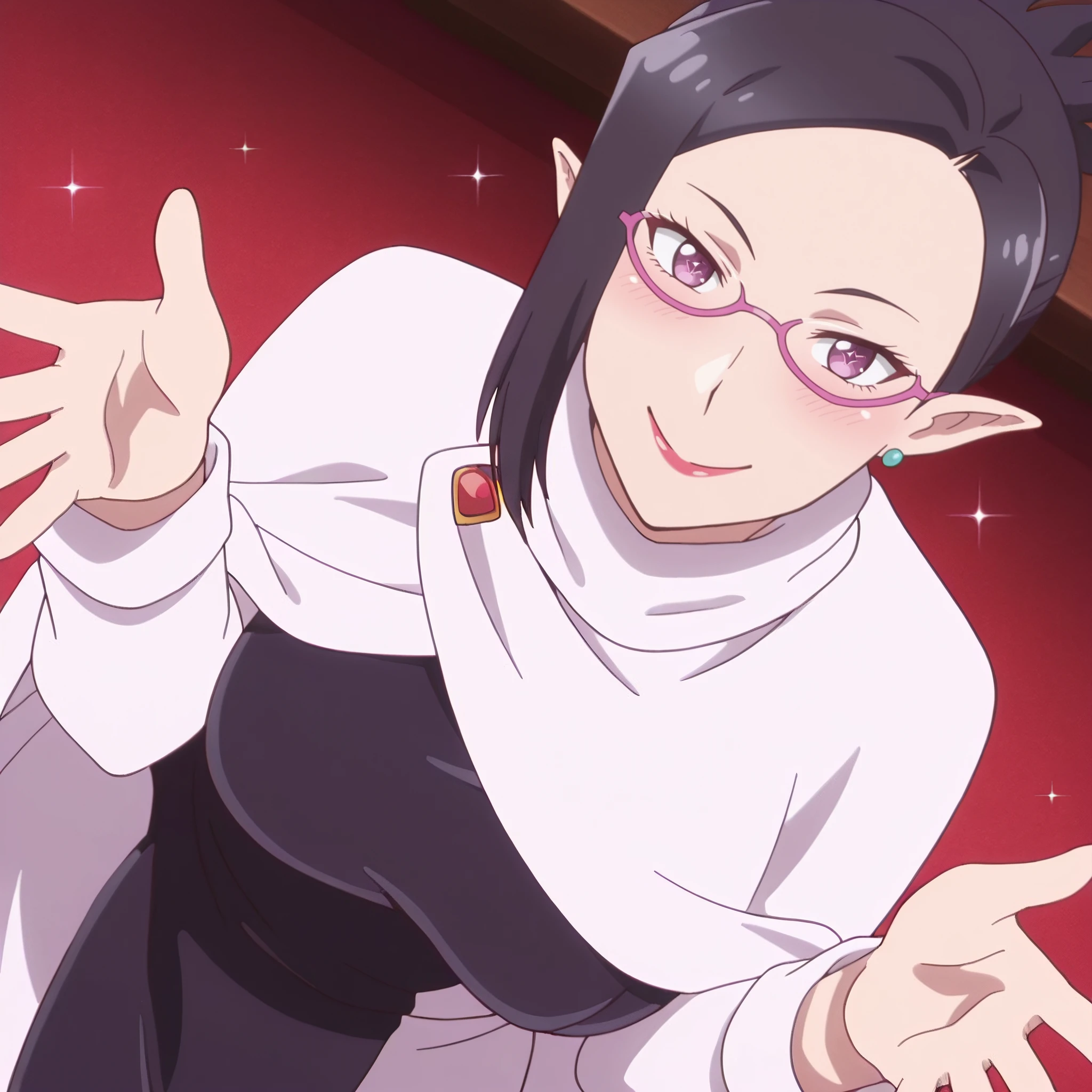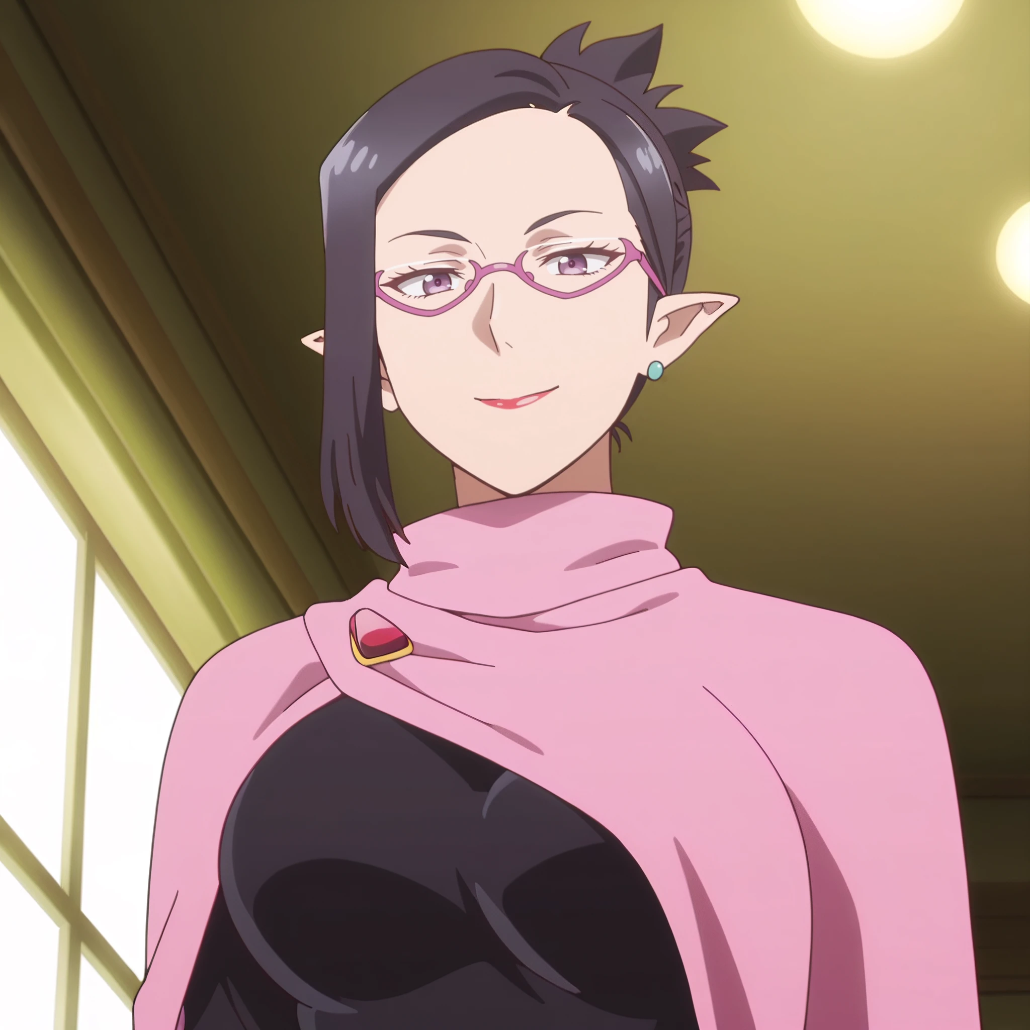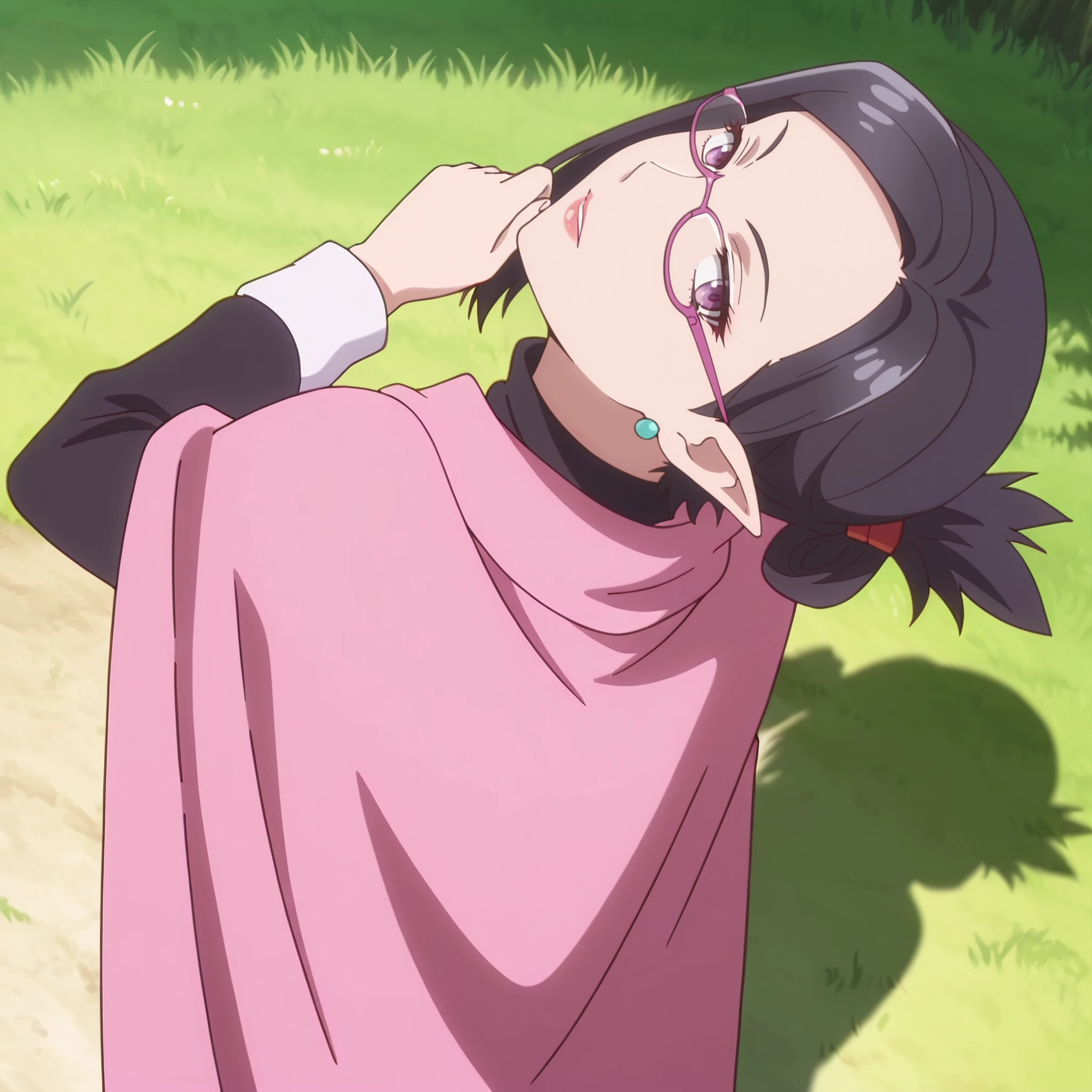 ARTGrenat, glasses, black hair, pointy ears, earrings, short hair, purple eyes, black-framed eyewear,