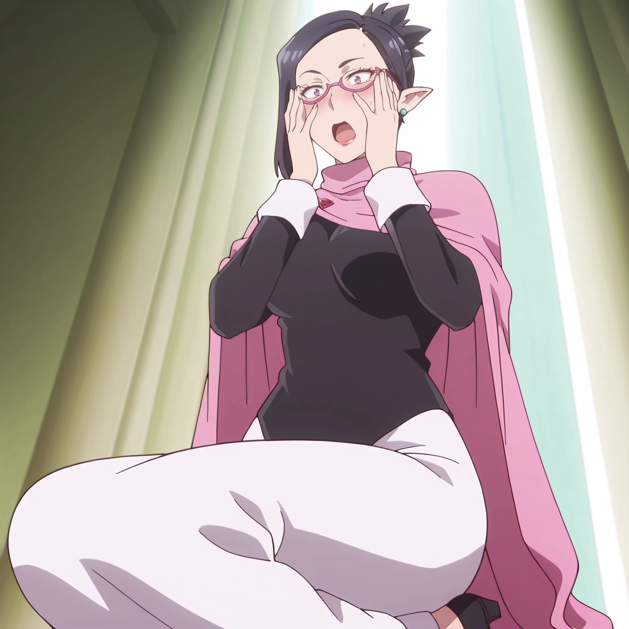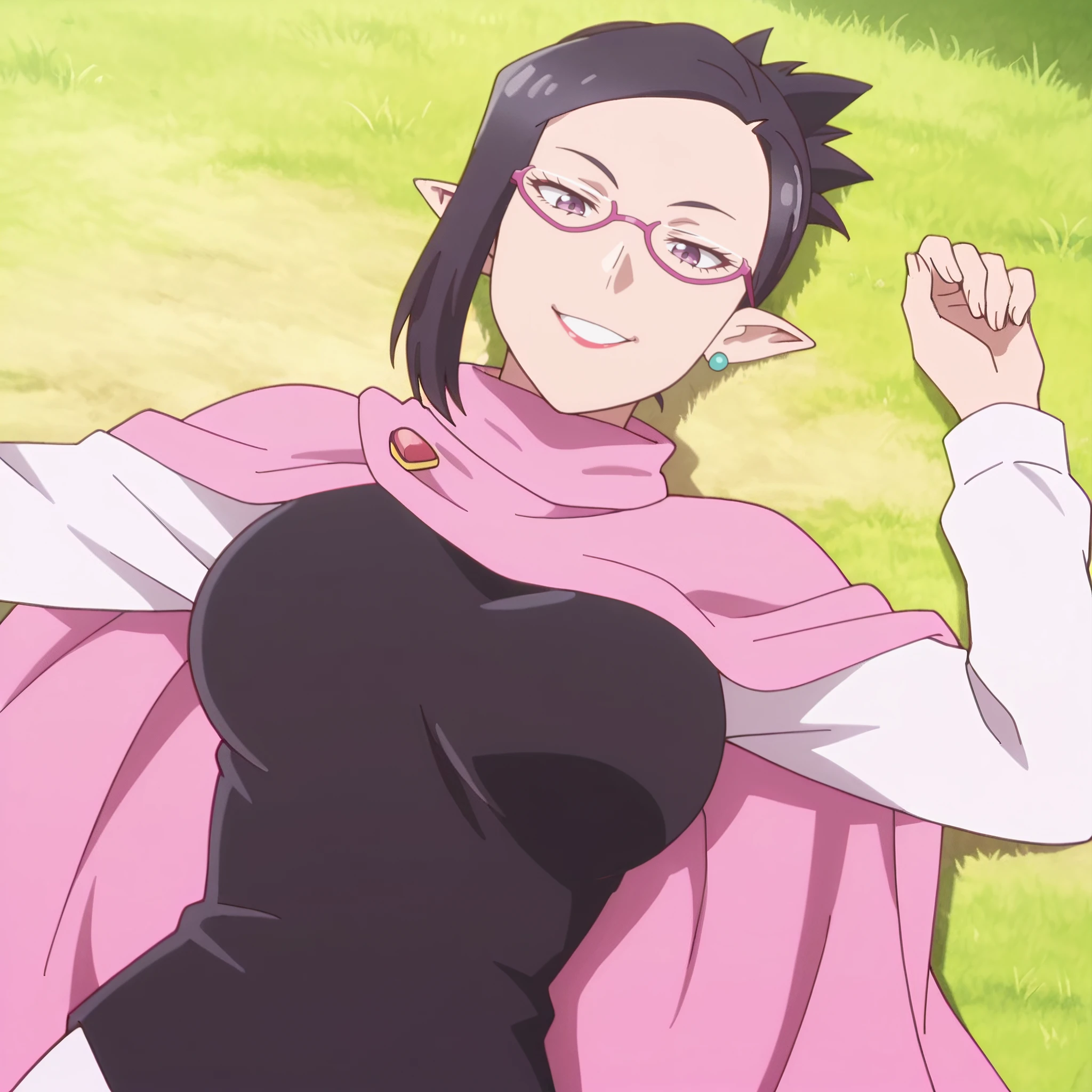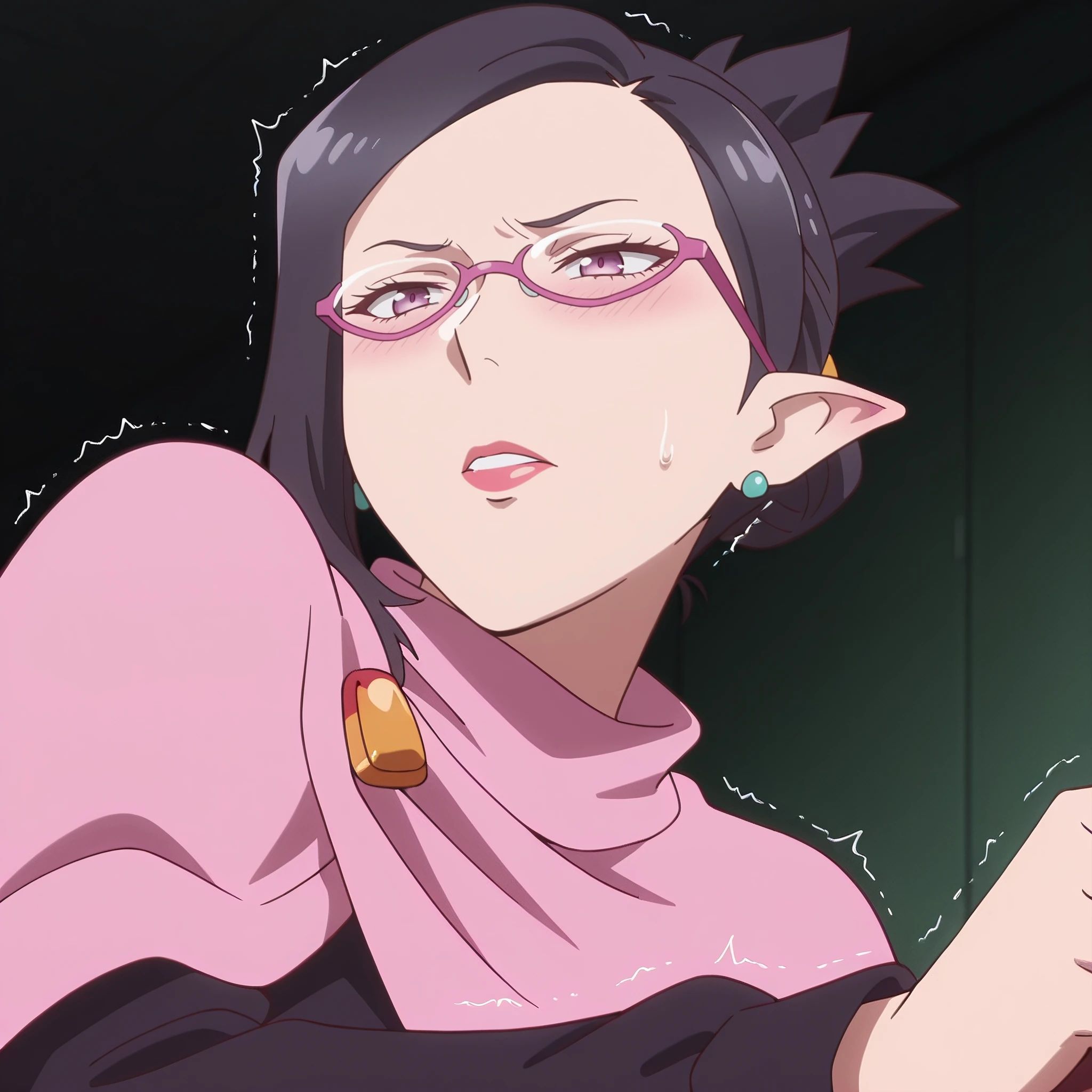 ARTGrenat, glasses, black hair, pointy ears, earrings, short hair, purple eyes, black-framed eyewear,