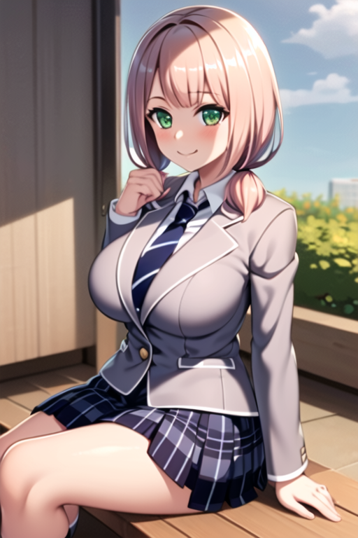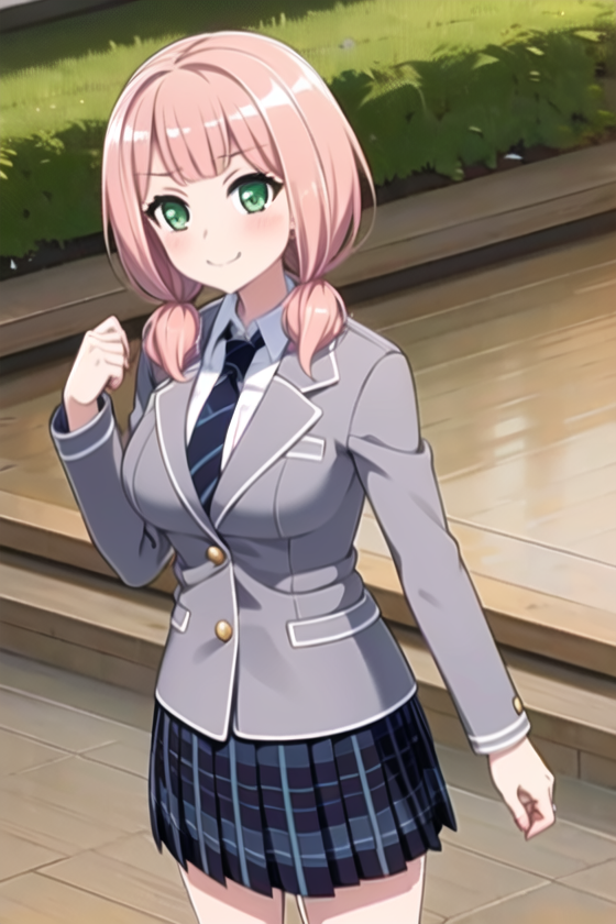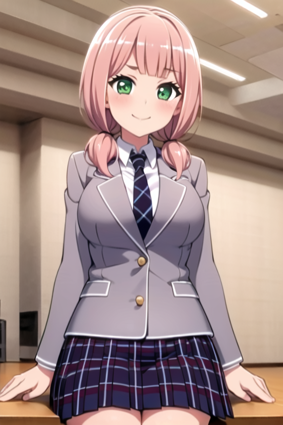 blue_skirt, haneoka_school_uniform, indoors, grey jacket, long_sleeves, necktie, pink_hair, plaid, plaid_skirt, pleated_skirt, school_uniform, shirt, skirt, smile,striped_necktie