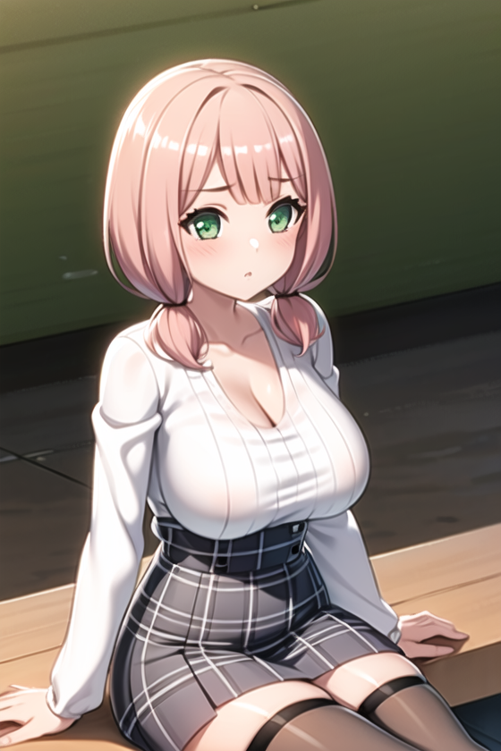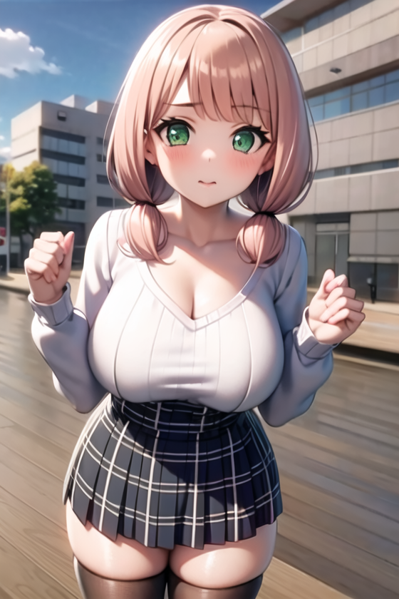 casual , black_legwear, blush, breasts, collarbone, green_eyes, long_sleeves, low_twintails, pink_hair, plaid, plaid_dress, plaid_skirt, shirt, short_twintails, skirt,thighhighs, twintails, white_shirt