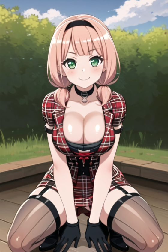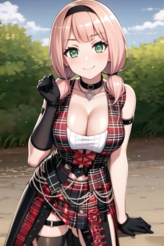 black_footwear, black_gloves, boots,cross-laced_footwear, garter_straps, gloves, lace-up_boots,low_twintails, plaid, plaid_shirt, shirt, skirt, thighhighs